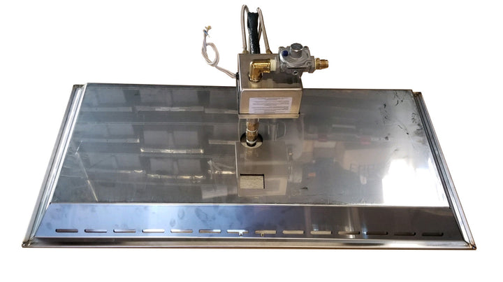 This fire pit insert features a 5” x 24” stainless steel H burner with 100K BTU set in a stainless steel pan sized for a 17” x 35” cutout. This kit is available with an optional 17” x 35” rectangular stainless steel fire pit lid to keep your fire pit covered and looking fresh. The low profile fire pit lid neatly conceals the fire pit burner pan and also creates a nice clean functional table top space.