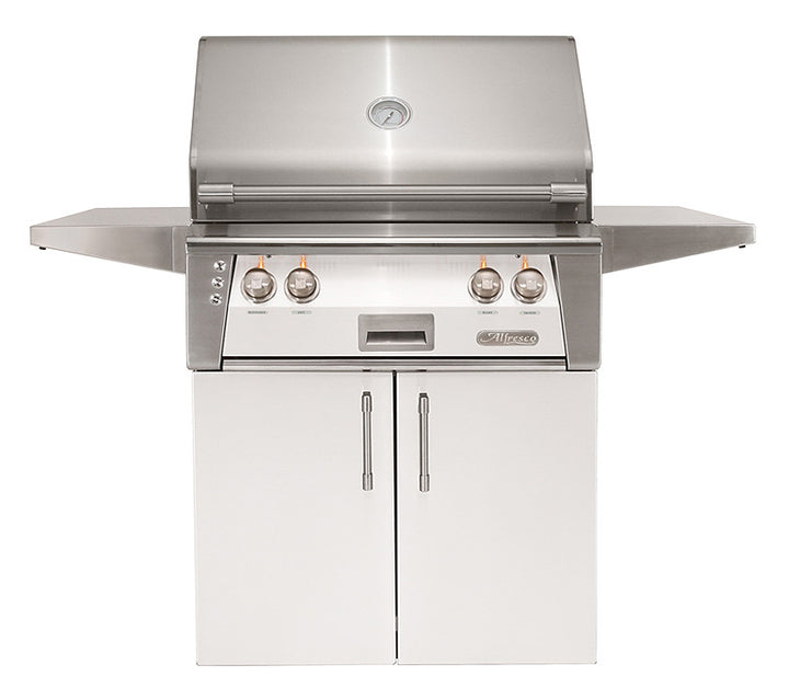 The Alfresco 2 Burner 30-Inch Freestanding Luxury BBQ Grill (SIGNAL WHITE Gloss or Matte) provides a high-performance luxury grill to complete your outdoor kitchen. The 304 stainless steel grill features (2) 18-SR stainless steel main burners producing 55,000 BTUs with 542 square inches of grilling area with the option to upgrade to a Sear Zone infrared burner. The Sear Zone features a “V-shaped” design and reaches temperatures up to 1500 degrees Fahrenheit to produce professional steakhouse results–all while using up to 50 percent less fuel. Pyramid-shaped ceramic briquettes situated above the burners eliminate hot and cold spots to maximize flavor through even delivery of heat to the cooking surface. Premium cooking grates featuring a special nonstick electro-polished finish allow for professional grill marks every time. The integrated rotisserie system features a chain-driven, whisper-quiet motor and a flush-mounted 15,000 BTU rear ceramic infrared burner. In addition, a dedicated 5,000 BTU burner provides heat to the sealed wood smoking drawer that holds large chunks of wood, herbs, and liquids to produce unmatched flavor. Additionally, this grill features an adjustable 3-position warming rack, SafeTouch technology to keep control components and electronics cool to the touch, hood-assist for easy lifting, simple push-button ignition with sealed 110v AC power source, dual halogen work lights, rich amber LED knob lighting, and includes a matching grill cover for a complete grilling package you’re sure to love. The durable cart features an all stainless steel construction that you can depend on. Its two side shelves are convenient for preparing your food, holding your drink or for placing tools that you are using on. Its double access doors offer an easy way to get to your utility connections.