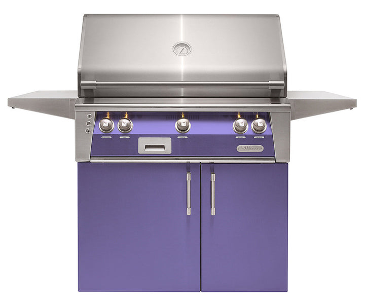 The Alfresco 3 Burner 36-Inch Freestanding Luxury BBQ Grill (BLUE LILAC Gloss) provides a high-performance luxury grill to complete your outdoor kitchen. The 304 stainless steel grill features (3) 18-SR stainless steel main burners producing 55,000 BTUs with 660 square inches of grilling area with the option to upgrade to a Sear Zone infrared burner. The Sear Zone features a “V-shaped” design and reaches temperatures up to 1500 degrees Fahrenheit to produce professional steakhouse results–all while using up to 50 percent less fuel. Pyramid-shaped ceramic briquettes situated above the burners eliminate hot and cold spots to maximize flavor through even delivery of heat to the cooking surface. Premium cooking grates featuring a special nonstick electro-polished finish allow for professional grill marks every time. The integrated rotisserie system features a chain-driven, whisper-quiet motor and a flush-mounted 15,000 BTU rear ceramic infrared burner. In addition, a dedicated 5,000 BTU burner provides heat to the sealed wood smoking drawer that holds large chunks of wood, herbs, and liquids to produce unmatched flavor. Additionally, this grill features an adjustable 3-position warming rack, SafeTouch technology to keep control components and electronics cool to the touch, hood-assist for easy lifting, simple push-button ignition with sealed 110v AC power source, dual halogen work lights, rich amber LED knob lighting, and includes a matching grill cover for a complete grilling package you’re sure to love. The durable cart features an all stainless steel construction that you can depend on. Its two side shelves are convenient for preparing your food, holding your drink or for placing tools that you are using on. Its double access doors offer an easy way to get to your utility connections.