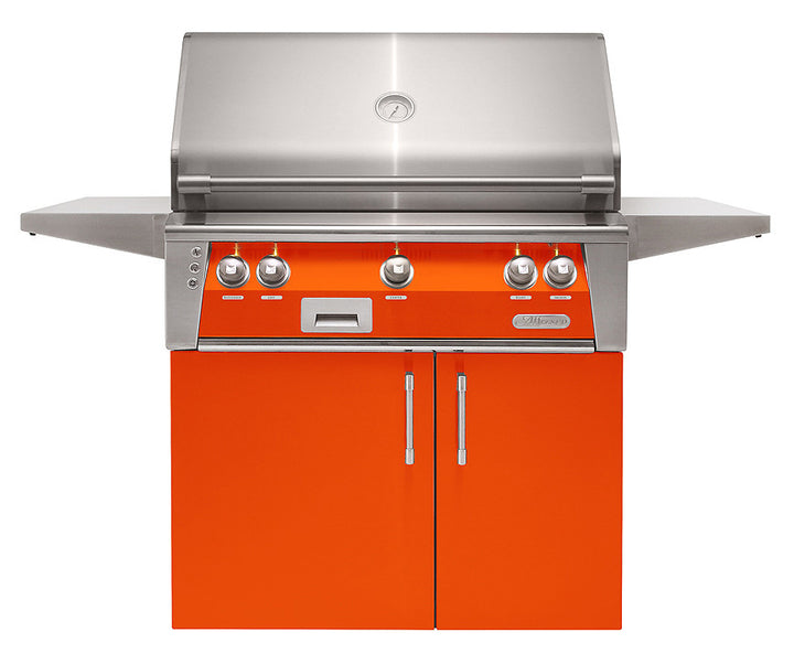 The Alfresco 3 Burner 36-Inch Freestanding Luxury BBQ Grill (LUMINOUS ORANGE Gloss) provides a high-performance luxury grill to complete your outdoor kitchen. The 304 stainless steel grill features (3) 18-SR stainless steel main burners producing 55,000 BTUs with 660 square inches of grilling area with the option to upgrade to a Sear Zone infrared burner. The Sear Zone features a “V-shaped” design and reaches temperatures up to 1500 degrees Fahrenheit to produce professional steakhouse results–all while using up to 50 percent less fuel. Pyramid-shaped ceramic briquettes situated above the burners eliminate hot and cold spots to maximize flavor through even delivery of heat to the cooking surface. Premium cooking grates featuring a special nonstick electro-polished finish allow for professional grill marks every time. The integrated rotisserie system features a chain-driven, whisper-quiet motor and a flush-mounted 15,000 BTU rear ceramic infrared burner. In addition, a dedicated 5,000 BTU burner provides heat to the sealed wood smoking drawer that holds large chunks of wood, herbs, and liquids to produce unmatched flavor. Additionally, this grill features an adjustable 3-position warming rack, SafeTouch technology to keep control components and electronics cool to the touch, hood-assist for easy lifting, simple push-button ignition with sealed 110v AC power source, dual halogen work lights, rich amber LED knob lighting, and includes a matching grill cover for a complete grilling package you’re sure to love. The durable cart features an all stainless steel construction that you can depend on. Its two side shelves are convenient for preparing your food, holding your drink or for placing tools that you are using on. Its double access doors offer an easy way to get to your utility connections.