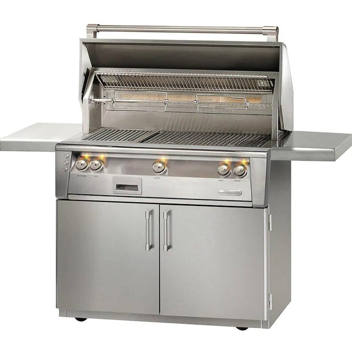 The Alfresco 3 Burner 42-Inch Freestanding Luxury BBQ Grill provides a high-performance luxury grill to complete your outdoor kitchen. The 304 stainless steel grill features (2) 18-SR stainless steel main burners producing 55,000 BTUs with 770 square inches of grilling area with the option to upgrade to a Sear Zone infrared burner. The Sear Zone features a “V-shaped” design and reaches temperatures up to 1500 degrees Fahrenheit to produce professional steakhouse results–all while using up to 50 percent less fuel. Pyramid-shaped ceramic briquettes situated above the burners eliminate hot and cold spots to maximize flavor through even delivery of heat to the cooking surface. Premium cooking grates featuring a special nonstick electro-polished finish allow for professional grill marks every time. The integrated rotisserie system features a chain-driven, whisper-quiet motor and a flush-mounted 15,000 BTU rear ceramic infrared burner. In addition, a dedicated 5,000 BTU burner provides heat to the sealed wood smoking drawer that holds large chunks of wood, herbs, and liquids to produce unmatched flavor. Additionally, this grill features an adjustable 3-position warming rack, SafeTouch technology to keep control components and electronics cool to the touch, hood-assist for easy lifting, simple push-button ignition with sealed 110v AC power source, dual halogen work lights, rich amber LED knob lighting, and includes a matching grill cover for a complete grilling package you’re sure to love. The durable cart features an all stainless steel construction that you can depend on. Its two side shelves are convenient for preparing your food, holding your drink or for placing tools that you are using on. Its double access doors offer an easy way to get to your utility connections.