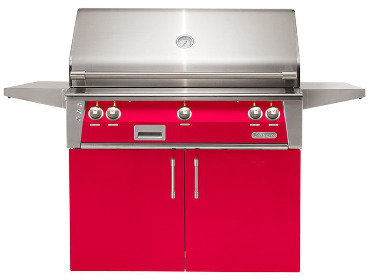 The Alfresco 3 Burner 42-Inch Freestanding Luxury BBQ Grill (RASPBERRY RED Gloss) provides a high-performance luxury grill to complete your outdoor kitchen. The 304 stainless steel grill features (2) 18-SR stainless steel main burners producing 55,000 BTUs with 770 square inches of grilling area with the option to upgrade to a Sear Zone infrared burner. The Sear Zone features a “V-shaped” design and reaches temperatures up to 1500 degrees Fahrenheit to produce professional steakhouse results–all while using up to 50 percent less fuel. Pyramid-shaped ceramic briquettes situated above the burners eliminate hot and cold spots to maximize flavor through even delivery of heat to the cooking surface. Premium cooking grates featuring a special nonstick electro-polished finish allow for professional grill marks every time. The integrated rotisserie system features a chain-driven, whisper-quiet motor and a flush-mounted 15,000 BTU rear ceramic infrared burner. In addition, a dedicated 5,000 BTU burner provides heat to the sealed wood smoking drawer that holds large chunks of wood, herbs, and liquids to produce unmatched flavor. Additionally, this grill features an adjustable 3-position warming rack, SafeTouch technology to keep control components and electronics cool to the touch, hood-assist for easy lifting, simple push-button ignition with sealed 110v AC power source, dual halogen work lights, rich amber LED knob lighting, and includes a matching grill cover for a complete grilling package you’re sure to love. The durable cart features an all stainless steel construction that you can depend on. Its two side shelves are convenient for preparing your food, holding your drink or for placing tools that you are using on. Its double access doors offer an easy way to get to your utility connections.