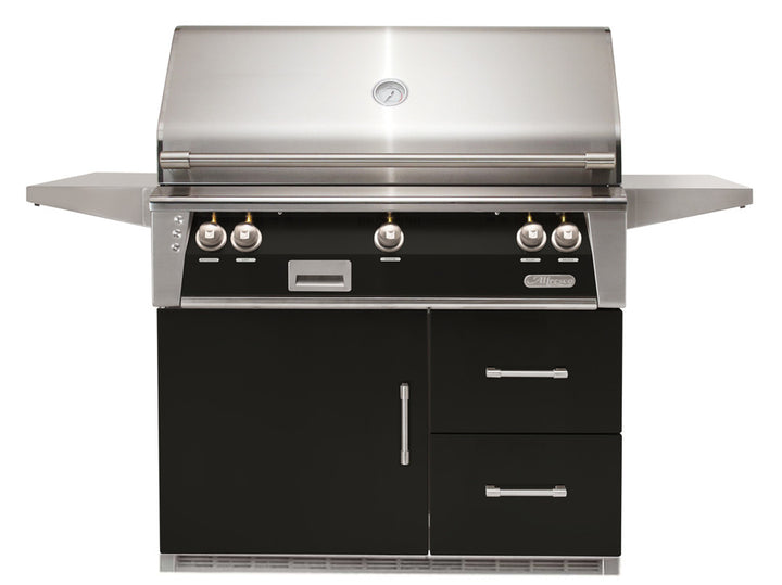 The Alfresco 3 Burner 42-Inch Freestanding Luxury BBQ Grill On Refrigerated Cart Base (JET BLACK Gloss or Matte) provides a high-performance luxury grill to complete your outdoor kitchen. The 304 stainless steel grill features (2) 18-SR stainless steel main burners producing 55,000 BTUs with 770 square inches of grilling area with the option to upgrade to a Sear Zone infrared burner. The Sear Zone features a “V-shaped” design and reaches temperatures up to 1500 degrees Fahrenheit to produce professional steakhouse results–all while using up to 50 percent less fuel. Pyramid-shaped ceramic briquettes situated above the burners eliminate hot and cold spots to maximize flavor through even delivery of heat to the cooking surface. Premium cooking grates featuring a special nonstick electro-polished finish allow for professional grill marks every time. The integrated rotisserie system features a chain-driven, whisper-quiet motor and a flush-mounted 15,000 BTU rear ceramic infrared burner. In addition, a dedicated 5,000 BTU burner provides heat to the sealed wood smoking drawer that holds large chunks of wood, herbs, and liquids to produce unmatched flavor. Additionally, this grill features an adjustable 3-position warming rack, SafeTouch technology to keep control components and electronics cool to the touch, hood-assist for easy lifting, simple push-button ignition with sealed 110v AC power source, dual halogen work lights, rich amber LED knob lighting, and includes a matching grill cover for a complete grilling package you’re sure to love. The durable cart features an all stainless steel construction that you can depend on. Its two side shelves are convenient for preparing your food, holding your drink or for placing tools that you are using on. Its double access doors offer an easy way to get to your utility connections.