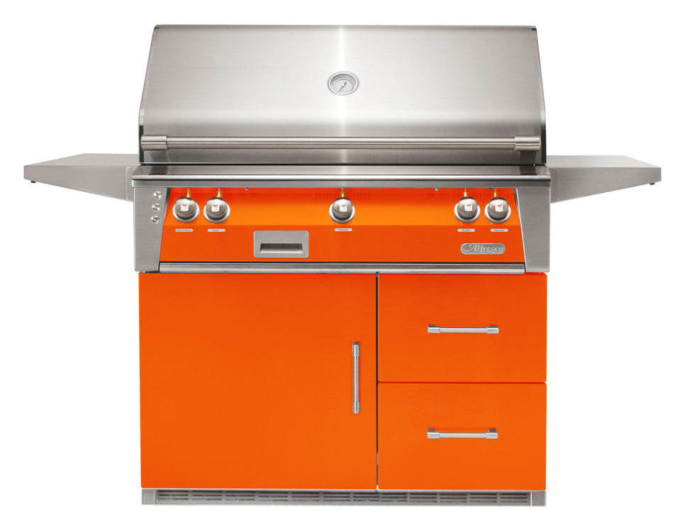 The Alfresco 3 Burner 42-Inch Freestanding Luxury BBQ Grill On Refrigerated Cart Base (LUMINOUS ORANGE Gloss) provides a high-performance luxury grill to complete your outdoor kitchen. The 304 stainless steel grill features (2) 18-SR stainless steel main burners producing 55,000 BTUs with 770 square inches of grilling area with the option to upgrade to a Sear Zone infrared burner. The Sear Zone features a “V-shaped” design and reaches temperatures up to 1500 degrees Fahrenheit to produce professional steakhouse results–all while using up to 50 percent less fuel. Pyramid-shaped ceramic briquettes situated above the burners eliminate hot and cold spots to maximize flavor through even delivery of heat to the cooking surface. Premium cooking grates featuring a special nonstick electro-polished finish allow for professional grill marks every time. The integrated rotisserie system features a chain-driven, whisper-quiet motor and a flush-mounted 15,000 BTU rear ceramic infrared burner. In addition, a dedicated 5,000 BTU burner provides heat to the sealed wood smoking drawer that holds large chunks of wood, herbs, and liquids to produce unmatched flavor. Additionally, this grill features an adjustable 3-position warming rack, SafeTouch technology to keep control components and electronics cool to the touch, hood-assist for easy lifting, simple push-button ignition with sealed 110v AC power source, dual halogen work lights, rich amber LED knob lighting, and includes a matching grill cover for a complete grilling package you’re sure to love. The durable cart features an all stainless steel construction that you can depend on. Its two side shelves are convenient for preparing your food, holding your drink or for placing tools that you are using on. Its double access doors offer an easy way to get to your utility connections.