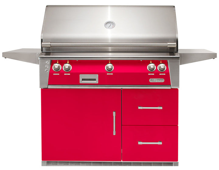 The Alfresco 3 Burner 42-Inch Freestanding Luxury BBQ Grill On Refrigerated Cart Base (RASPBERRY RED Gloss) provides a high-performance luxury grill to complete your outdoor kitchen. The 304 stainless steel grill features (2) 18-SR stainless steel main burners producing 55,000 BTUs with 770 square inches of grilling area with the option to upgrade to a Sear Zone infrared burner. The Sear Zone features a “V-shaped” design and reaches temperatures up to 1500 degrees Fahrenheit to produce professional steakhouse results–all while using up to 50 percent less fuel. Pyramid-shaped ceramic briquettes situated above the burners eliminate hot and cold spots to maximize flavor through even delivery of heat to the cooking surface. Premium cooking grates featuring a special nonstick electro-polished finish allow for professional grill marks every time. The integrated rotisserie system features a chain-driven, whisper-quiet motor and a flush-mounted 15,000 BTU rear ceramic infrared burner. In addition, a dedicated 5,000 BTU burner provides heat to the sealed wood smoking drawer that holds large chunks of wood, herbs, and liquids to produce unmatched flavor. Additionally, this grill features an adjustable 3-position warming rack, SafeTouch technology to keep control components and electronics cool to the touch, hood-assist for easy lifting, simple push-button ignition with sealed 110v AC power source, dual halogen work lights, rich amber LED knob lighting, and includes a matching grill cover for a complete grilling package you’re sure to love. The durable cart features an all stainless steel construction that you can depend on. Its two side shelves are convenient for preparing your food, holding your drink or for placing tools that you are using on. Its double access doors offer an easy way to get to your utility connections.