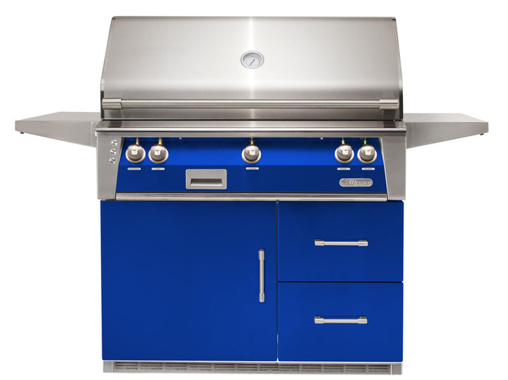The Alfresco 3 Burner 42-Inch Freestanding Luxury BBQ Grill On Refrigerated Cart Base (ULTRAMARINE BLUE Gloss) provides a high-performance luxury grill to complete your outdoor kitchen. The 304 stainless steel grill features (2) 18-SR stainless steel main burners producing 55,000 BTUs with 770 square inches of grilling area with the option to upgrade to a Sear Zone infrared burner. The Sear Zone features a “V-shaped” design and reaches temperatures up to 1500 degrees Fahrenheit to produce professional steakhouse results–all while using up to 50 percent less fuel. Pyramid-shaped ceramic briquettes situated above the burners eliminate hot and cold spots to maximize flavor through even delivery of heat to the cooking surface. Premium cooking grates featuring a special nonstick electro-polished finish allow for professional grill marks every time. The integrated rotisserie system features a chain-driven, whisper-quiet motor and a flush-mounted 15,000 BTU rear ceramic infrared burner. In addition, a dedicated 5,000 BTU burner provides heat to the sealed wood smoking drawer that holds large chunks of wood, herbs, and liquids to produce unmatched flavor. Additionally, this grill features an adjustable 3-position warming rack, SafeTouch technology to keep control components and electronics cool to the touch, hood-assist for easy lifting, simple push-button ignition with sealed 110v AC power source, dual halogen work lights, rich amber LED knob lighting, and includes a matching grill cover for a complete grilling package you’re sure to love. The durable cart features an all stainless steel construction that you can depend on. Its two side shelves are convenient for preparing your food, holding your drink or for placing tools that you are using on. Its double access doors offer an easy way to get to your utility connections.