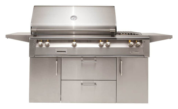 The Alfresco 3 Burner 56-Inch Freestanding Luxury Deluxe BBQ Grill On Cart With Rotis And Smoker With Optional SearZone™ provides a high-performance luxury grill to complete your outdoor kitchen. The 304 stainless steel grill features (3) 18-SR stainless steel main burners producing 55,000 BTUs with 770 square inches of grilling area with the option to upgrade to a Sear Zone infrared burner. The Sear Zone features a “V-shaped” design and reaches temperatures up to 1500 degrees Fahrenheit to produce professional steakhouse results–all while using up to 50 percent less fuel. Pyramid-shaped ceramic briquettes situated above the burners eliminate hot and cold spots to maximize flavor through even delivery of heat to the cooking surface. Premium cooking grates featuring a special nonstick electro-polished finish allow for professional grill marks every time. The integrated rotisserie system features a chain-driven, whisper-quiet motor and a flush-mounted 15,000 BTU rear ceramic infrared burner. In addition, a dedicated 5,000 BTU burner provides heat to the sealed wood smoking drawer that holds large chunks of wood, herbs, and liquids to produce unmatched flavor. Additionally, this grill features an adjustable 3-position warming rack, SafeTouch technology to keep control components and electronics cool to the touch, hood-assist for easy lifting, simple push-button ignition with sealed 110v AC power source, dual halogen work lights, rich amber LED knob lighting, and includes a matching grill cover for a complete grilling package you’re sure to love. The durable cart features an all stainless steel construction that you can depend on. Its two side shelves are convenient for preparing your food, holding your drink or for placing tools that you are using on. Its double access doors offer an easy way to get to your utility connections.