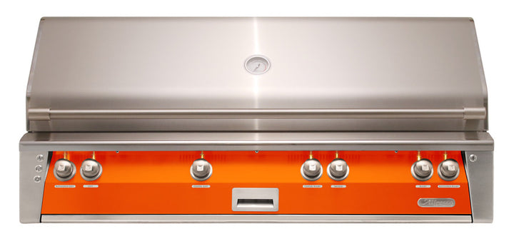 The Alfresco 3 Burner 56-Inch Built-In Luxury BBQ Grill With Rotis, Smoker and SearZone™ (LUMINOUS ORANGE Gloss) provides a high-performance luxury grill to complete your outdoor kitchen. The 304 stainless steel grill features (3) 18-SR stainless steel main burners producing 55,000 BTUs with 998 square inches of grilling area with the option to upgrade to a Sear Zone infrared burner. The Sear Zone features a “V-shaped” design and reaches temperatures up to 1500 degrees Fahrenheit to produce professional steakhouse results–all while using up to 50 percent less fuel. Pyramid-shaped ceramic briquettes situated above the burners eliminate hot and cold spots to maximize flavor through even delivery of heat to the cooking surface. Premium cooking grates featuring a special nonstick electro-polished finish allow for professional grill marks every time. The integrated rotisserie system features a chain-driven, whisper-quiet motor and a flush-mounted 15,000 BTU rear ceramic infrared burner. In addition, a dedicated 5,000 BTU burner provides heat to the sealed wood smoking drawer that holds large chunks of wood, herbs, and liquids to produce unmatched flavor. Additionally, this grill features an adjustable 3-position warming rack, SafeTouch technology to keep control components and electronics cool to the touch, hood-assist for easy lifting, simple push-button ignition with sealed 110v AC power source, dual halogen work lights, rich amber LED knob lighting, and includes a matching grill cover for a complete grilling package you’re sure to love. The durable cart features an all stainless steel construction that you can depend on. Its two side shelves are convenient for preparing your food, holding your drink or for placing tools that you are using on. Its double access doors offer an easy way to get to your utility connections.