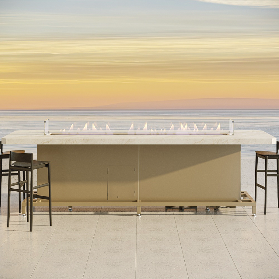 This is the perfect bar height fire pit table for community dining or a large outdoor living area and have been installed and many fine hotels and resorts. This 42"H table is designed for high traffic, high use areas where durability is of high importance. This table is a unique modern take on a bar height table that you can customize and personalize to fit your space.