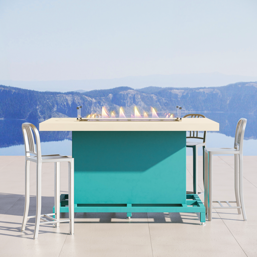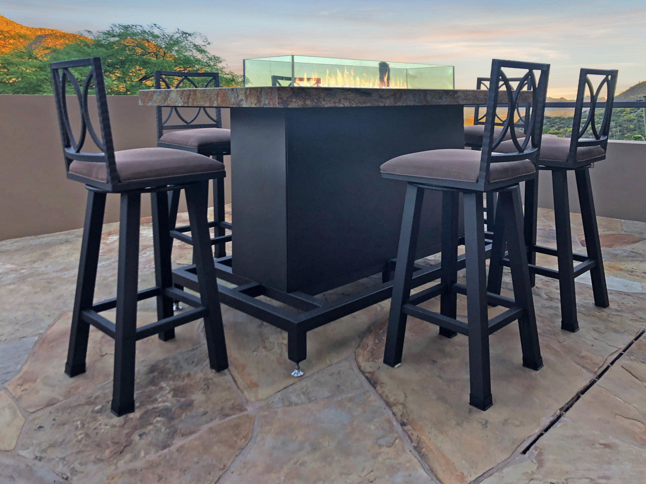 This is the perfect bar height fire pit table for a community dining or an everyday porch or patio work station. This 30"H table is designed for high traffic, high use areas where durability is of high importance. This table is a unique modern take on a bar height table that you can customize and personalize to fit your space.