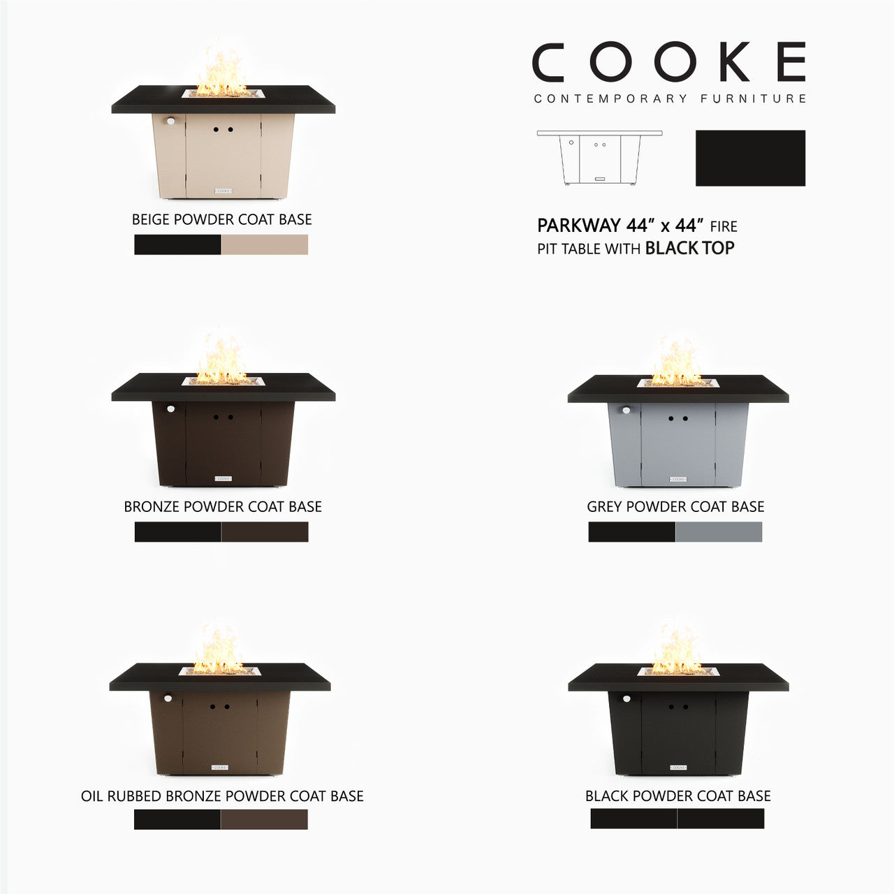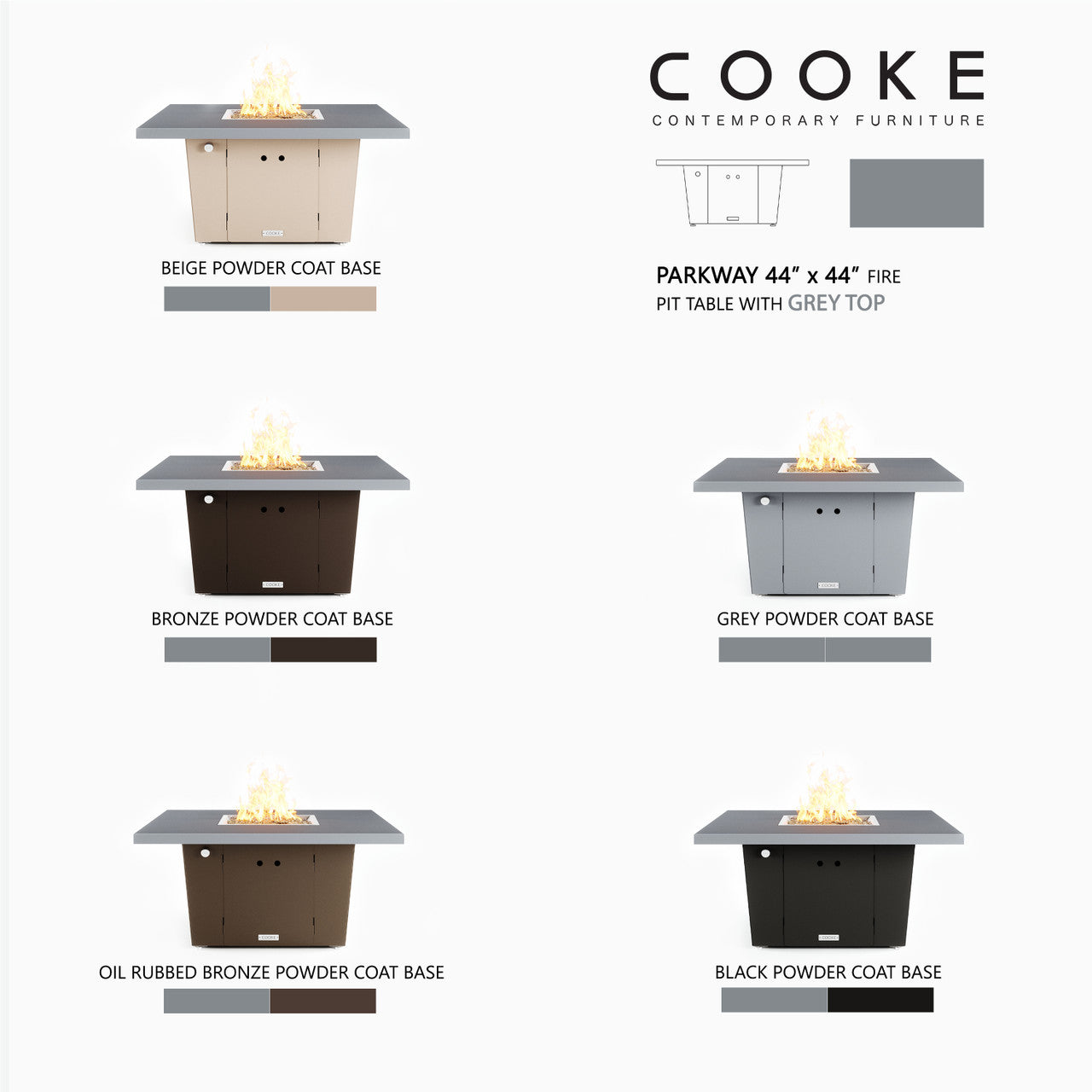 The Parkway fire pit table is COOKE's solution to a great-looking, quality, made-in-USA square fire pit table that is versatile and a great value. This chat height fire pit table features a generous table top with 3cm edge on a 21" tall slightly tapered base. This table has lighter lines, a more traditional look, but a clean simplicity that will continue to look fresh. This table is big enough for ample seating but is carefully designed to be integrated into landscaped lounge areas, open patio spaces with planters, or near fountains and water features. The COOKE Parkway is hands down the best value for an all aluminum or real stone fire pit table.