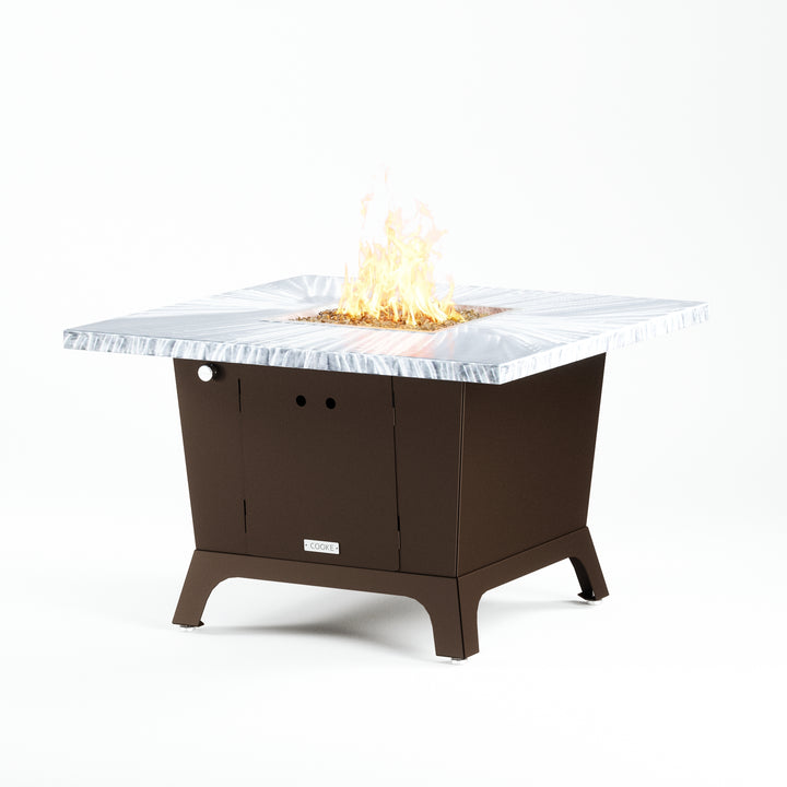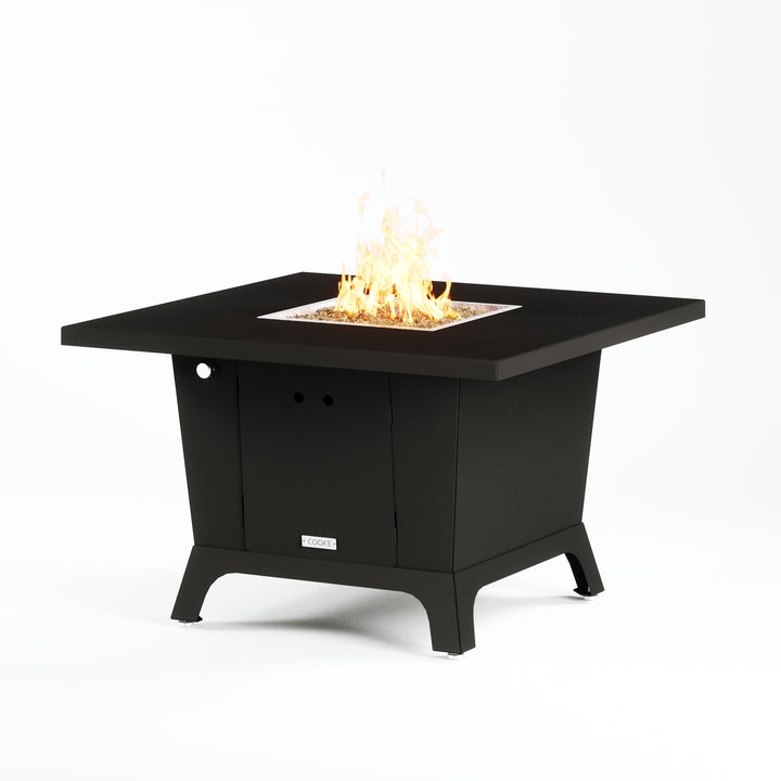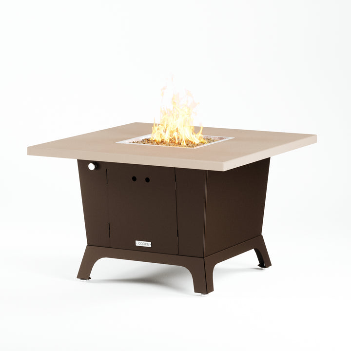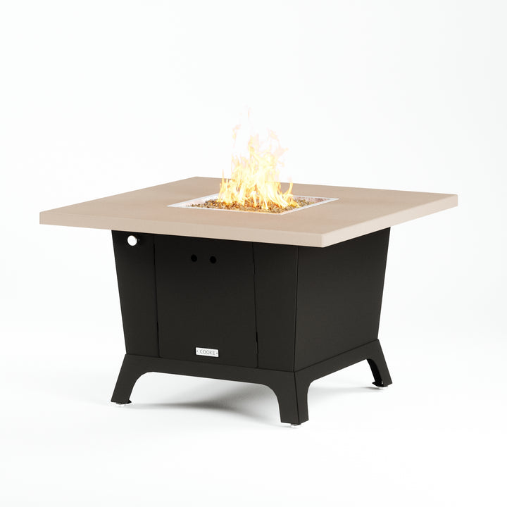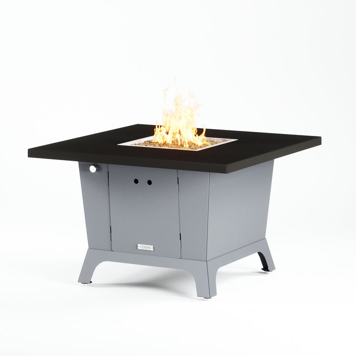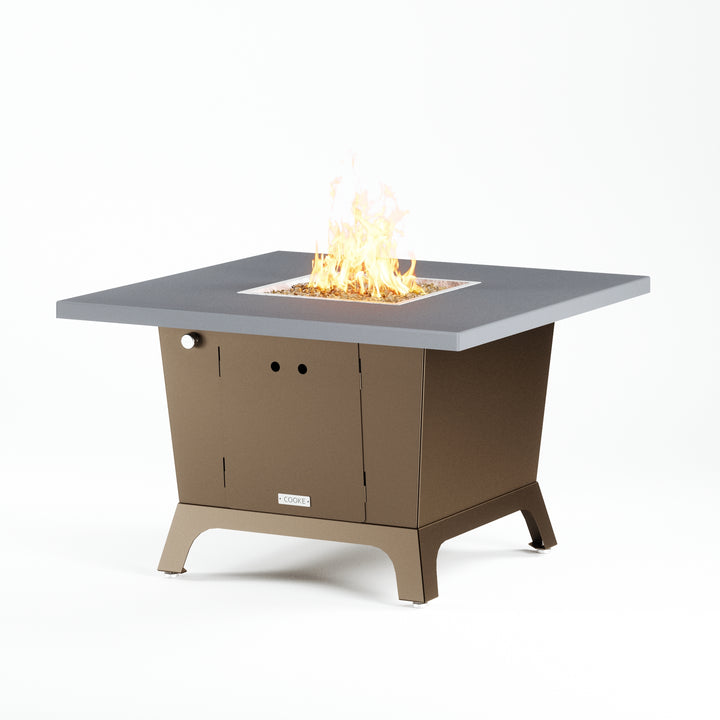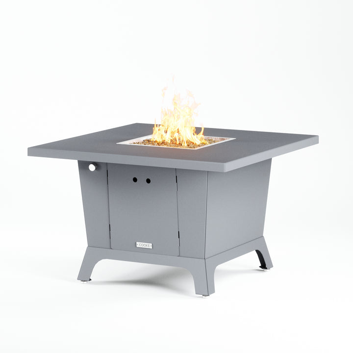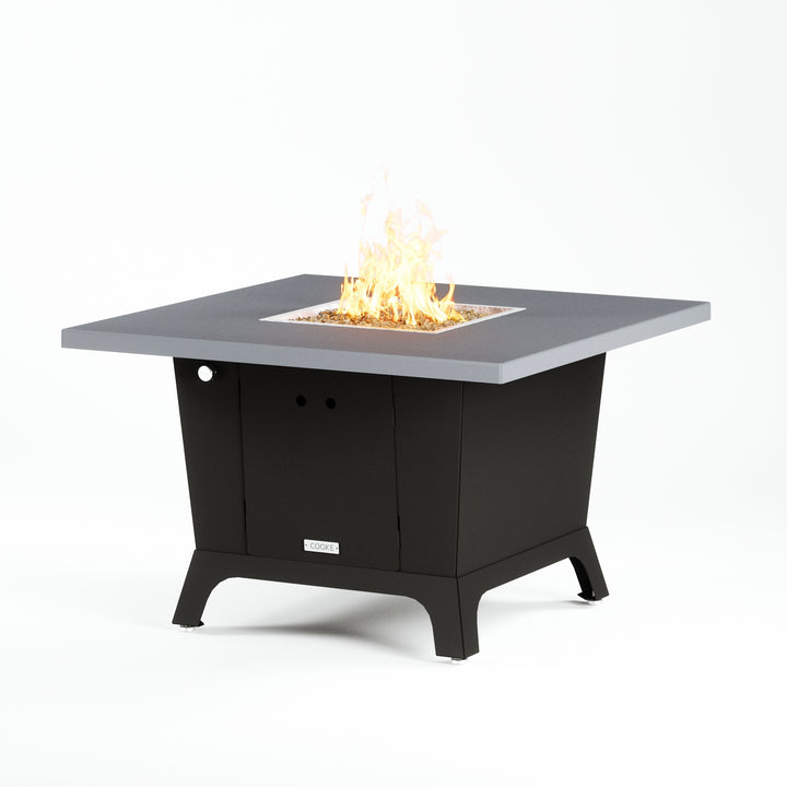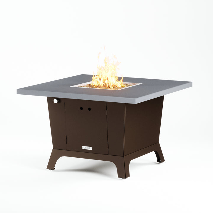 Dine under the stars with a COOKE Parkway fire pit table. The Parkway fire pit table is COOKE's solution to a great-looking, quality, made-in-USA square fire pit table that is versatile and a great value. This dining height fire pit table features a generous table top with 3cm edge on a 28" tall slightly tapered base. This table has lighter lines a clean simplicity that radiates quality that will continue to look fresh. This table is big enough for ample seating but is carefully designed to be integrated into landscaped lounge areas, open patio spaces with planters, or near fountains and water features. The COOKE Parkway is hands down the best value for an all aluminum or real stone fire pit table.