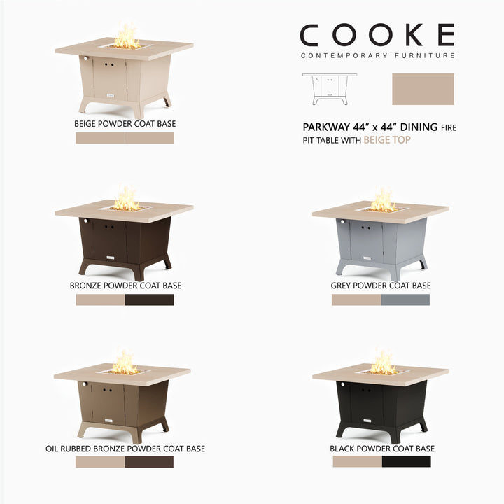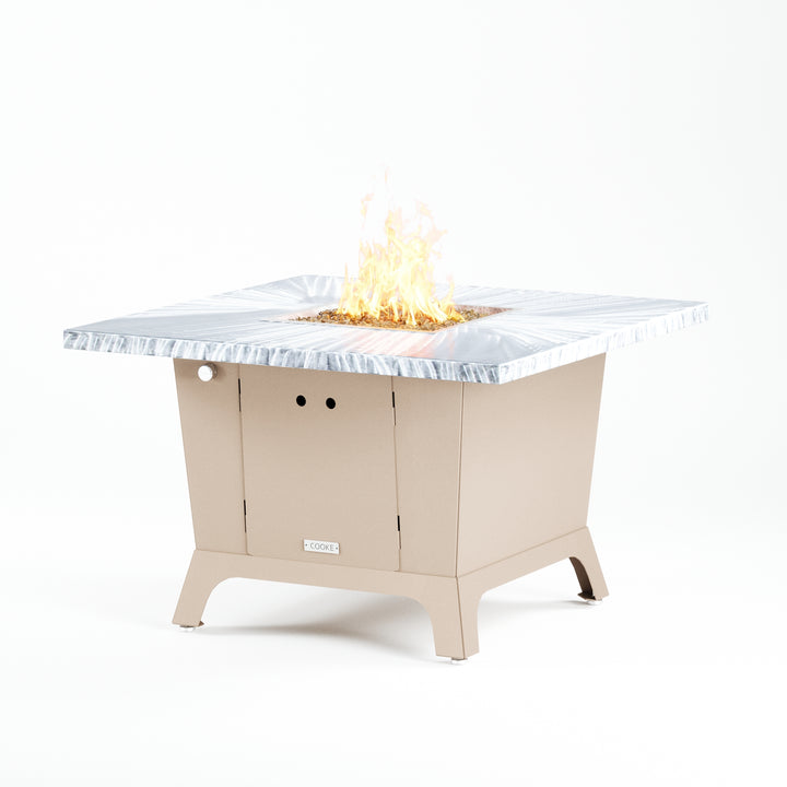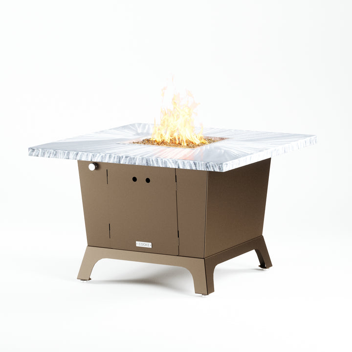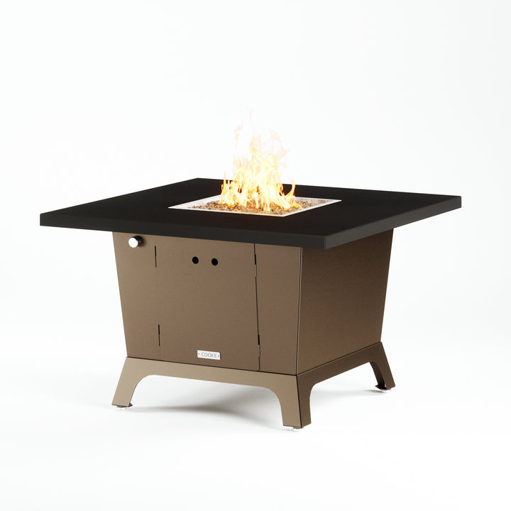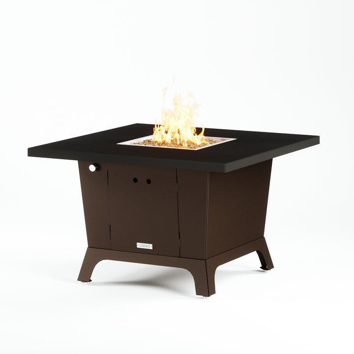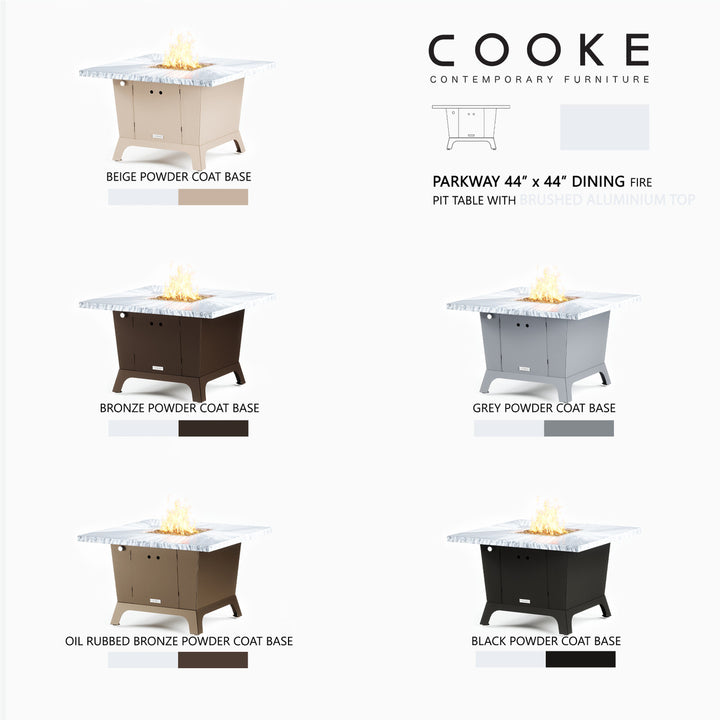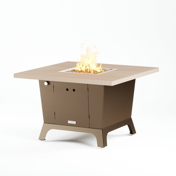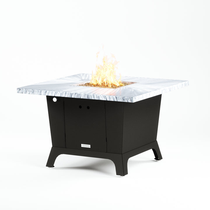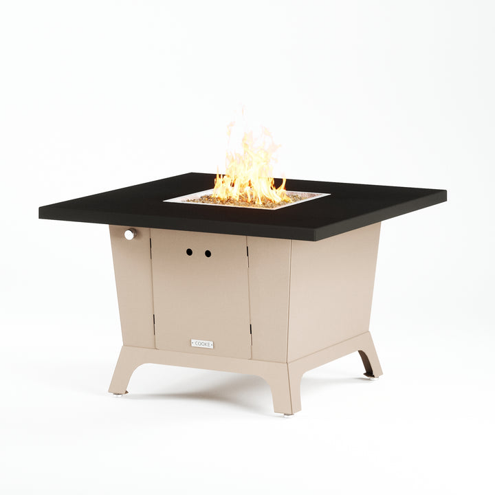 Dine under the stars with a COOKE Parkway fire pit table. The Parkway fire pit table is COOKE's solution to a great-looking, quality, made-in-USA square fire pit table that is versatile and a great value. This dining height fire pit table features a generous table top with 3cm edge on a 28" tall slightly tapered base. This table has lighter lines a clean simplicity that radiates quality that will continue to look fresh. This table is big enough for ample seating but is carefully designed to be integrated into landscaped lounge areas, open patio spaces with planters, or near fountains and water features. The COOKE Parkway is hands down the best value for an all aluminum or real stone fire pit table.