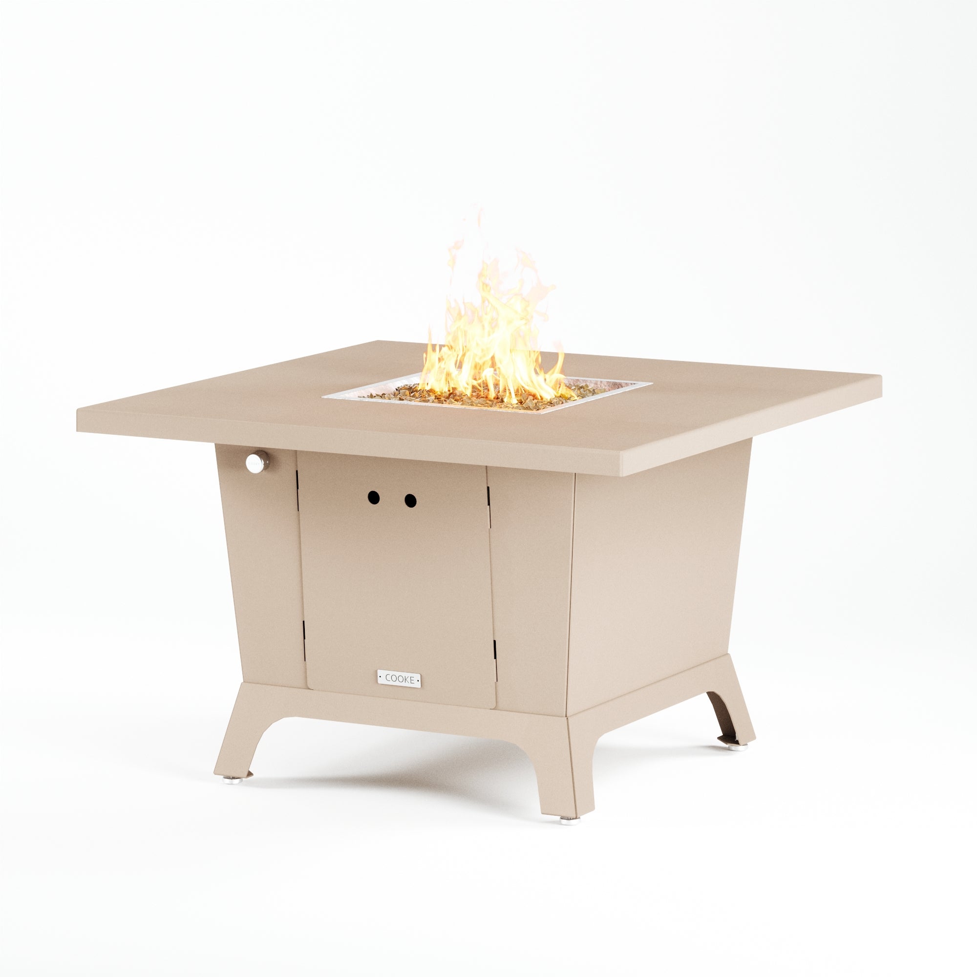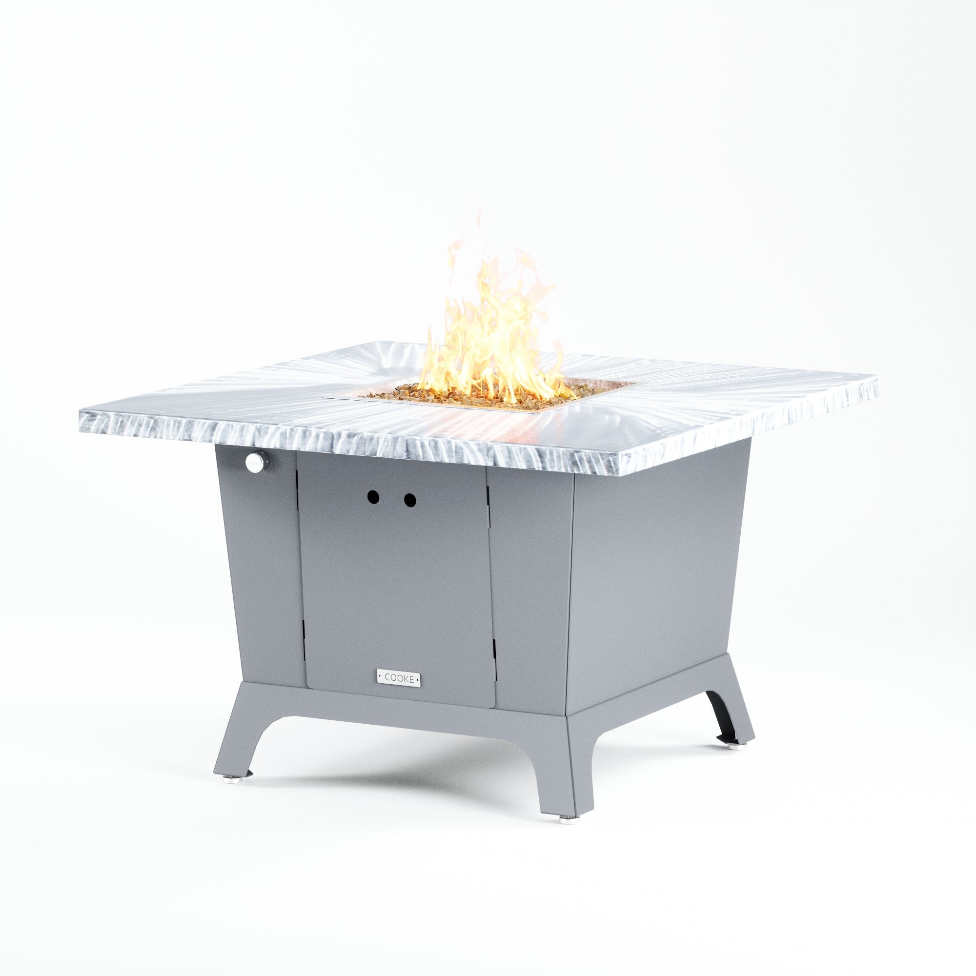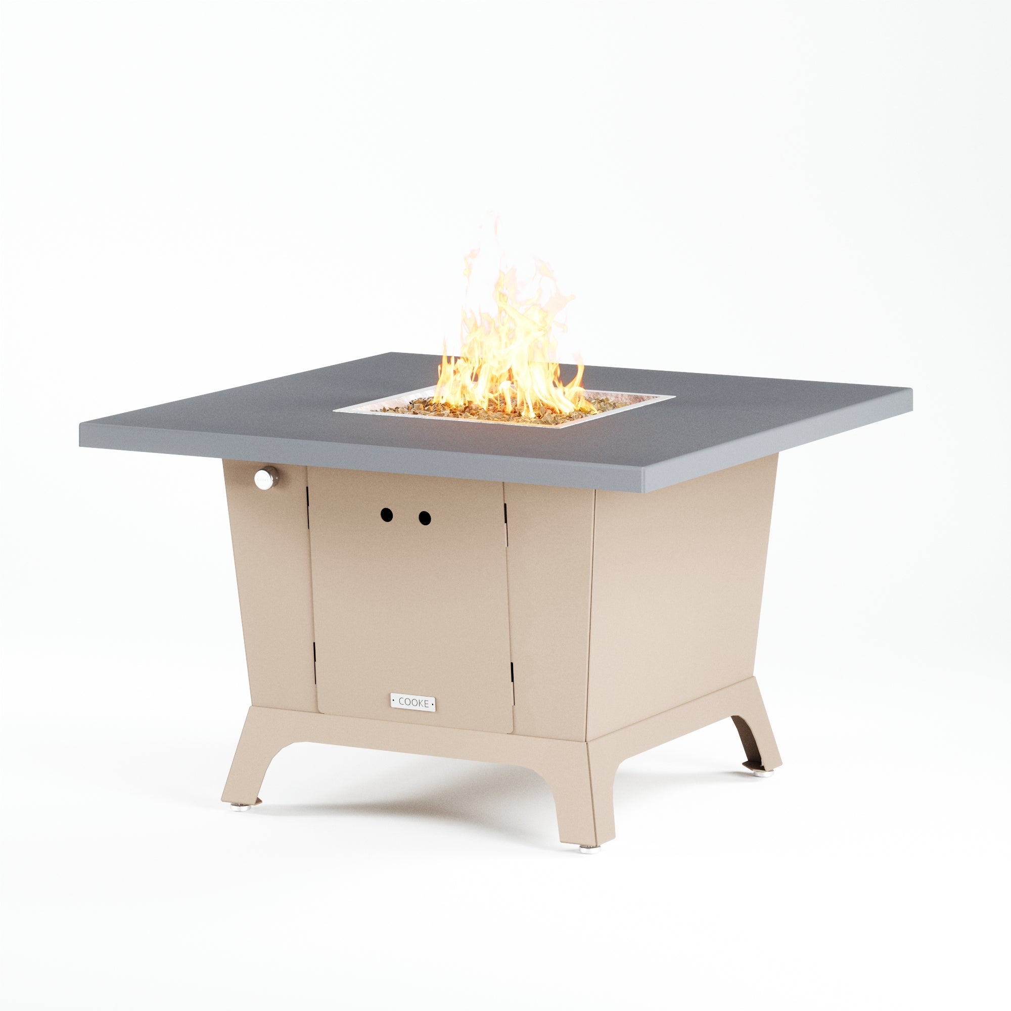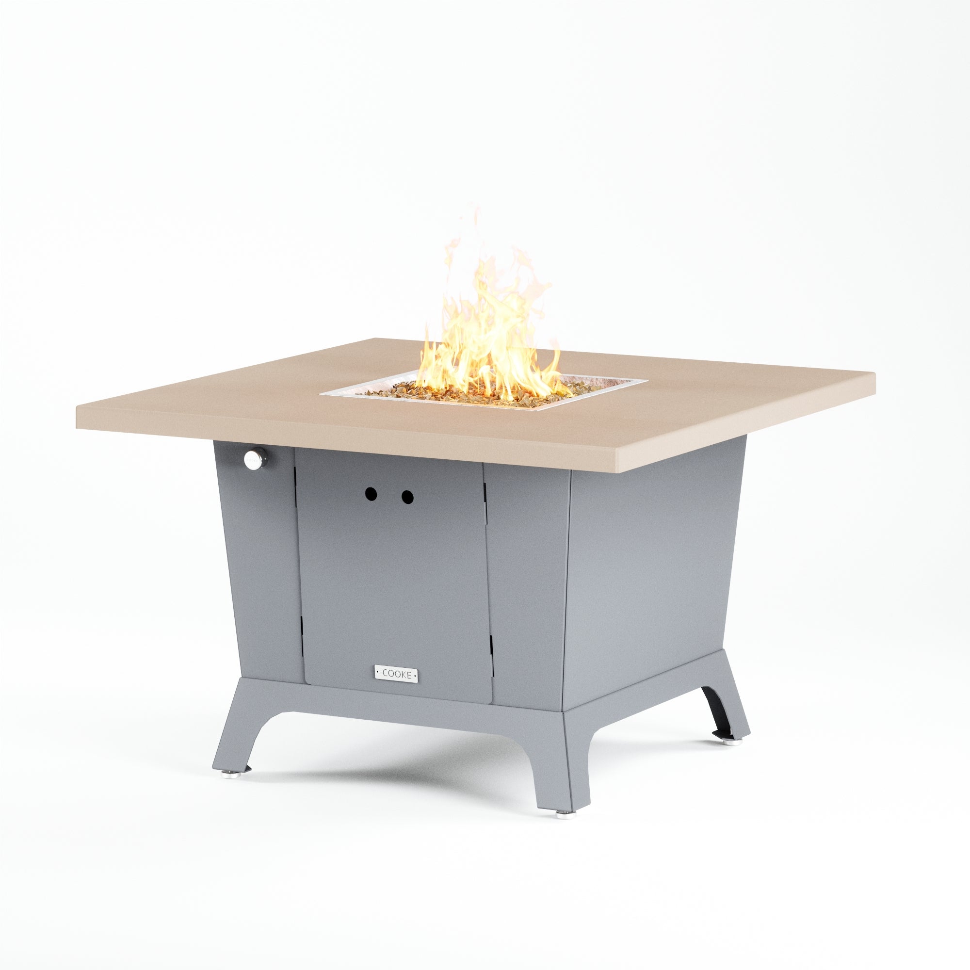 Dine under the stars with a COOKE Parkway fire pit table. The Parkway fire pit table is COOKE's solution to a great-looking, quality, made-in-USA square fire pit table that is versatile and a great value. This dining height fire pit table features a generous table top with 3cm edge on a 28" tall slightly tapered base. This table has lighter lines a clean simplicity that radiates quality that will continue to look fresh. This table is big enough for ample seating but is carefully designed to be integrated into landscaped lounge areas, open patio spaces with planters, or near fountains and water features. The COOKE Parkway is hands down the best value for an all aluminum or real stone fire pit table.