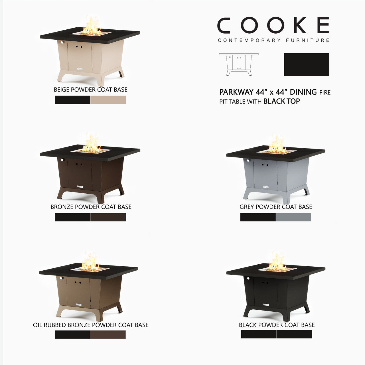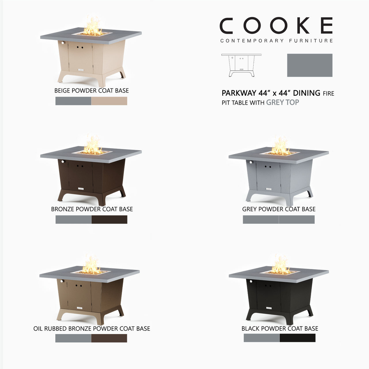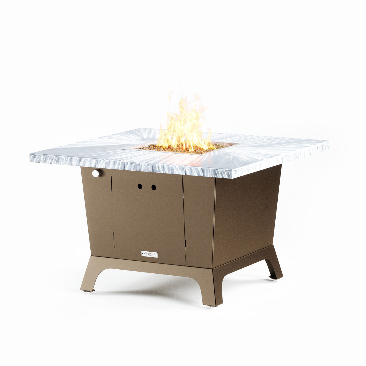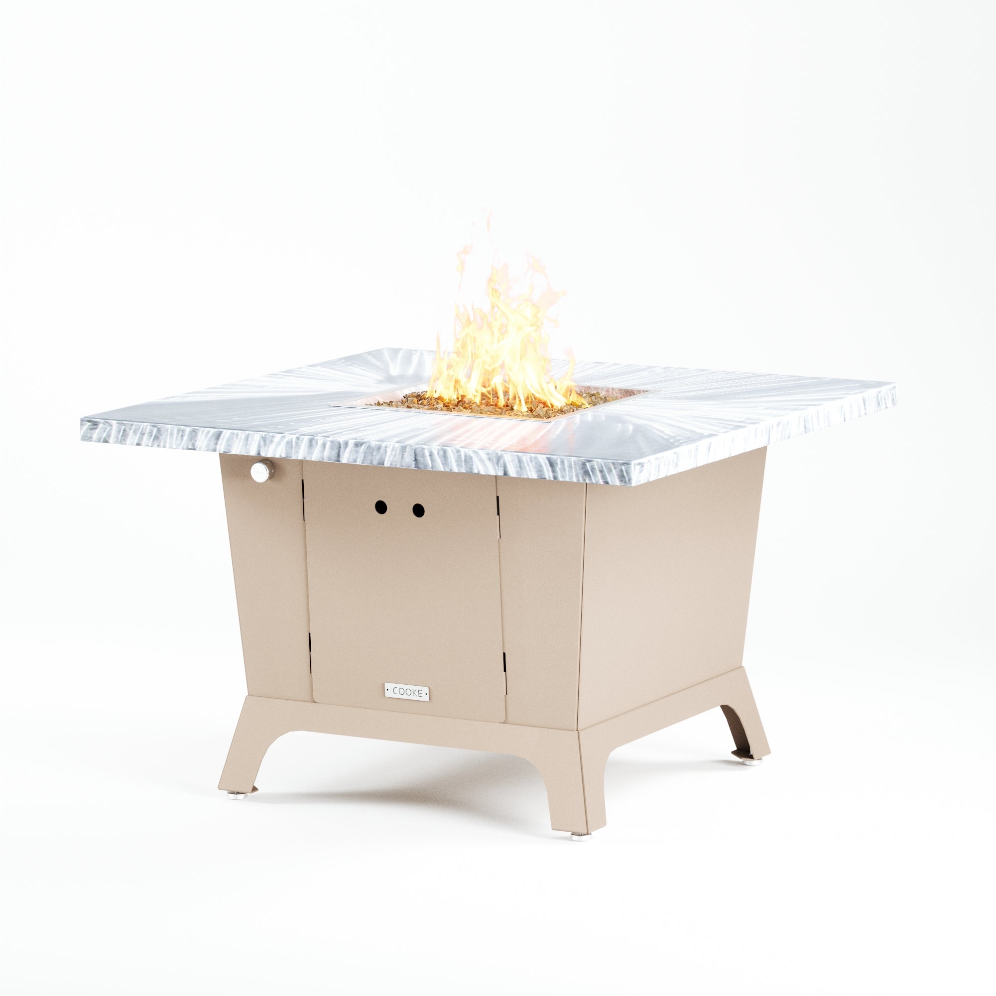 Dine under the stars with a COOKE Parkway fire pit table. The Parkway fire pit table is COOKE's solution to a great-looking, quality, made-in-USA square fire pit table that is versatile and a great value. This dining height fire pit table features a generous table top with 3cm edge on a 28" tall slightly tapered base. This table has lighter lines a clean simplicity that radiates quality that will continue to look fresh. This table is big enough for ample seating but is carefully designed to be integrated into landscaped lounge areas, open patio spaces with planters, or near fountains and water features. The COOKE Parkway is hands down the best value for an all aluminum or real stone fire pit table.