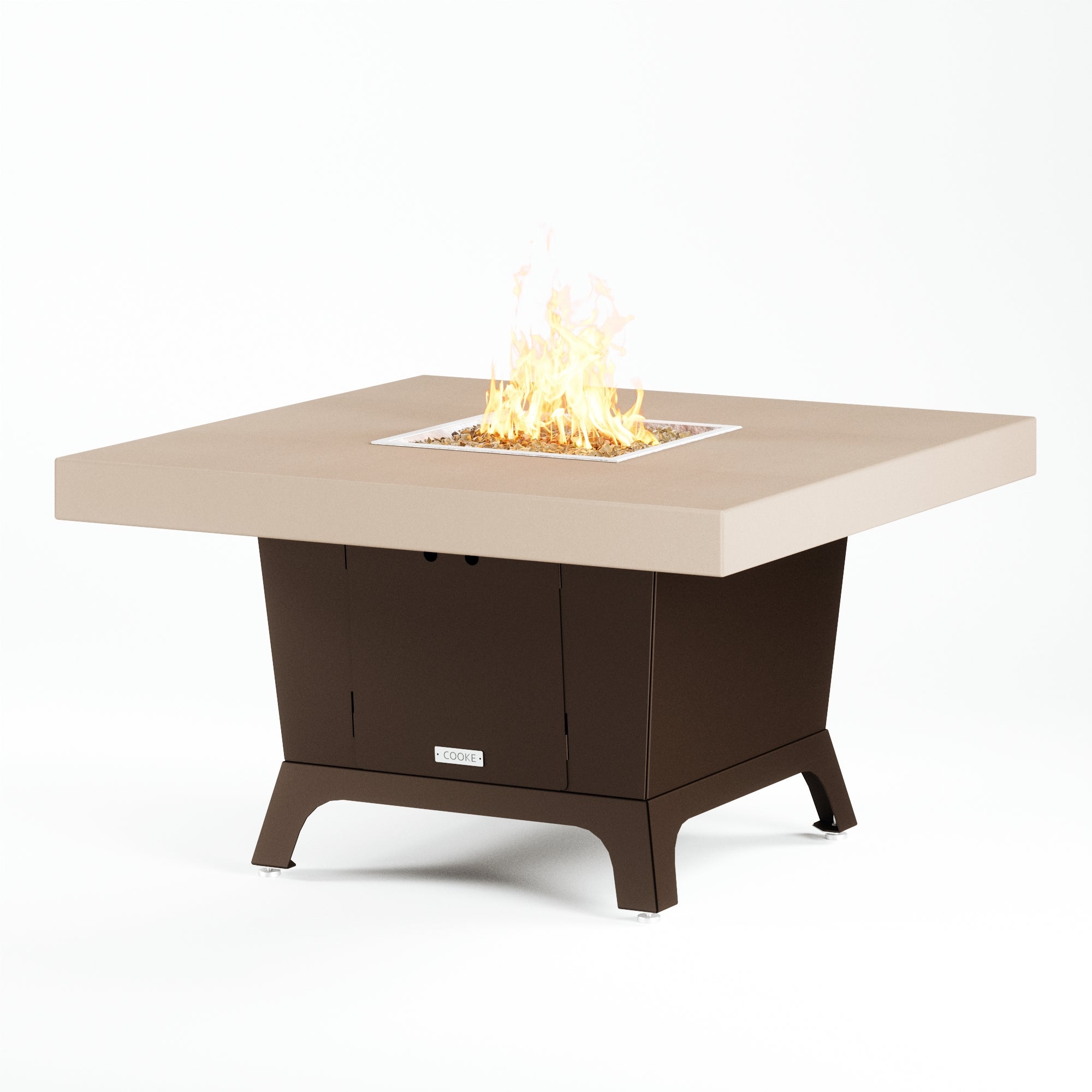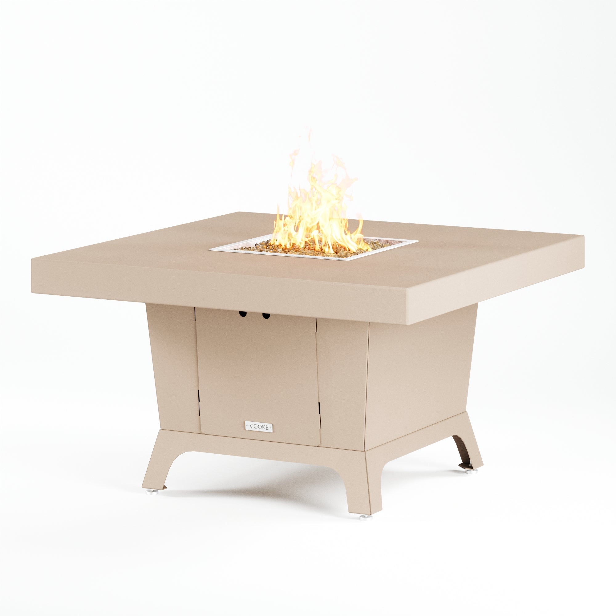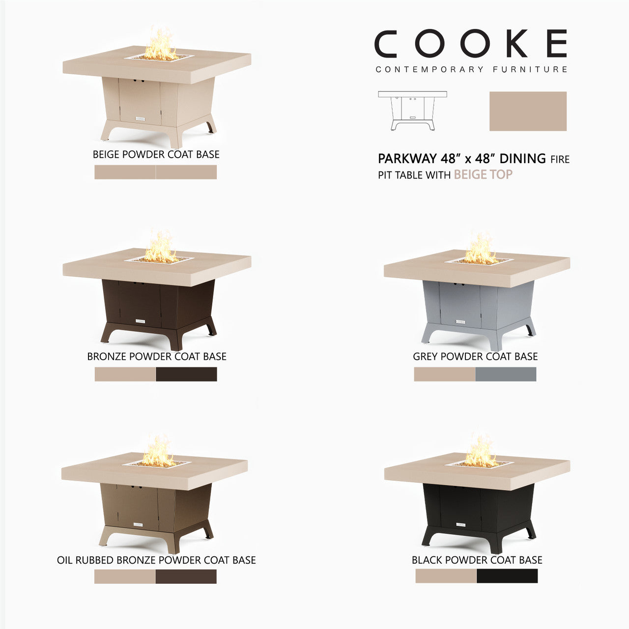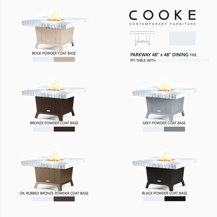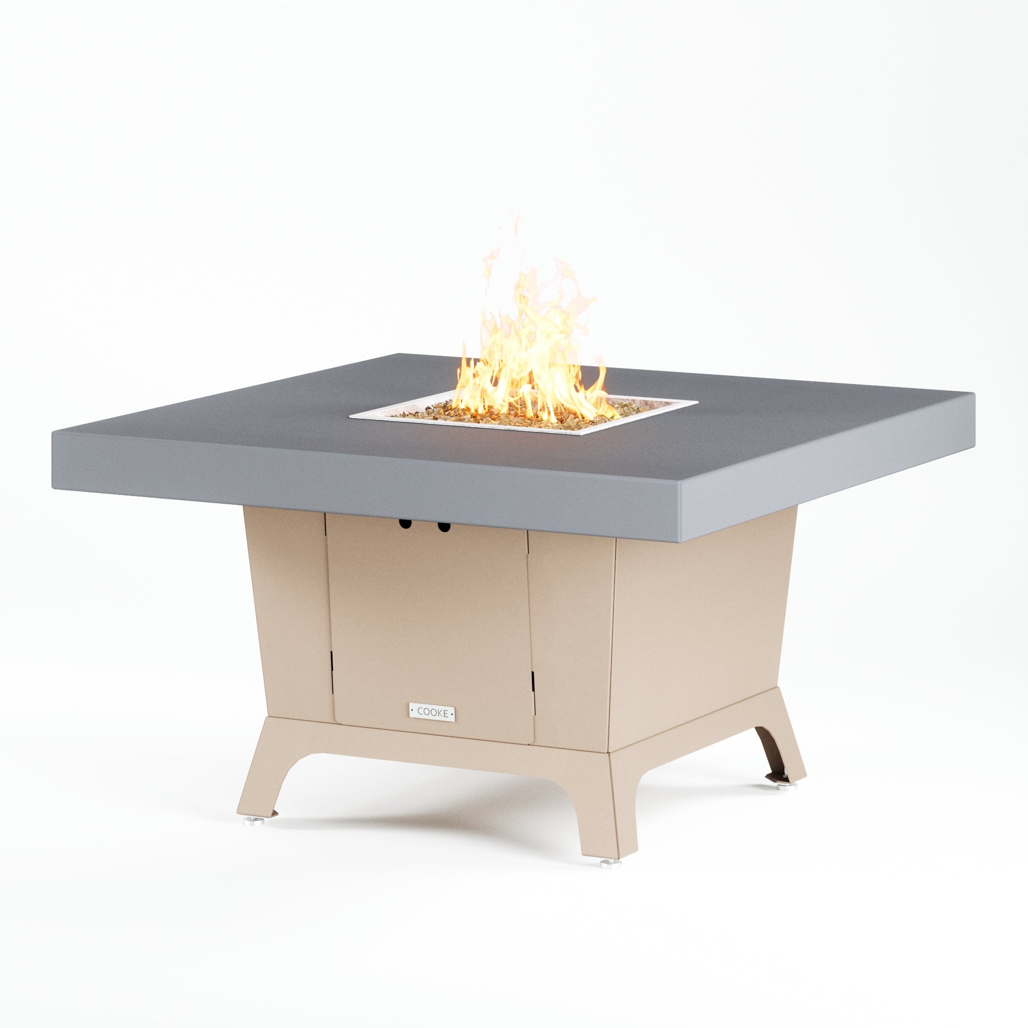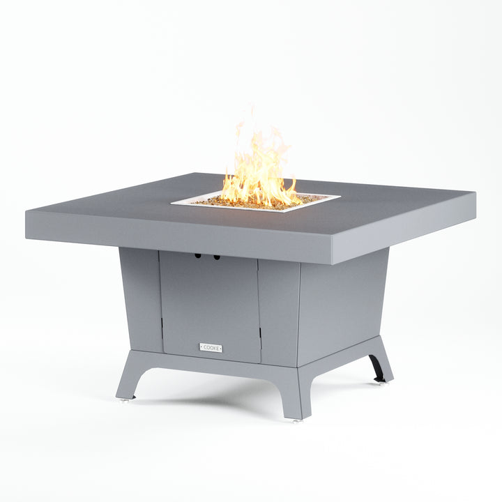 Dine under the stars with a COOKE Parkway fire pit table. The Parkway fire pit table is COOKE's solution to a great-looking, quality, made-in-USA square fire pit table that is versatile and a great value. This dining height fire pit table features a generous table top with a modern design. This table is big enough for ample seating but is carefully designed to be integrated into landscaped lounge areas, open patio spaces with planters, or near fountains and water features. The COOKE Parkway is hands down the best value for an all aluminum or real stone fire pit table.