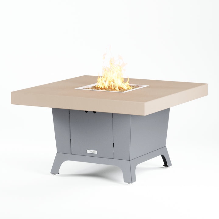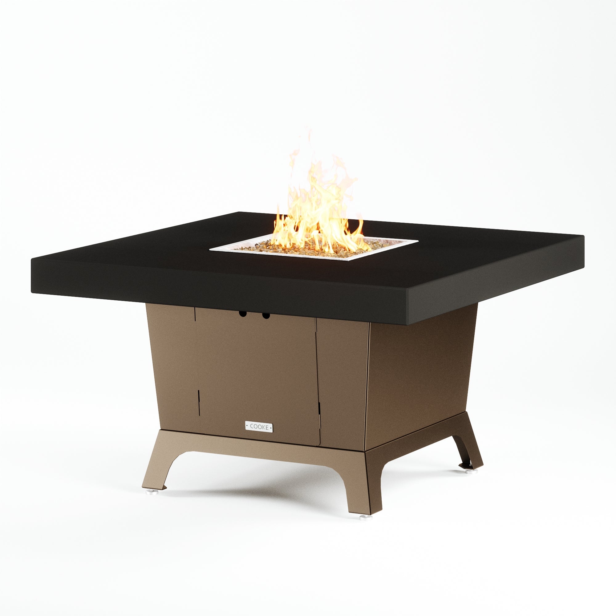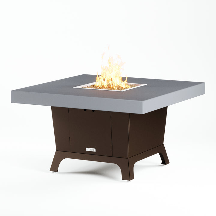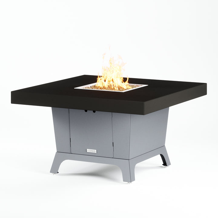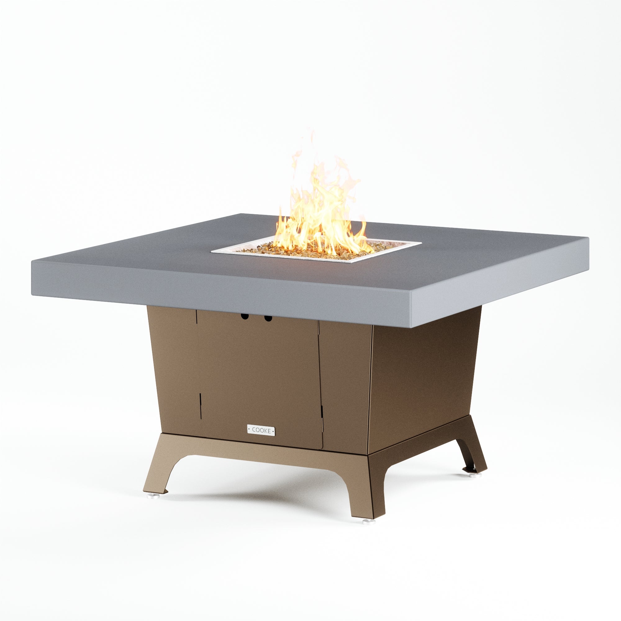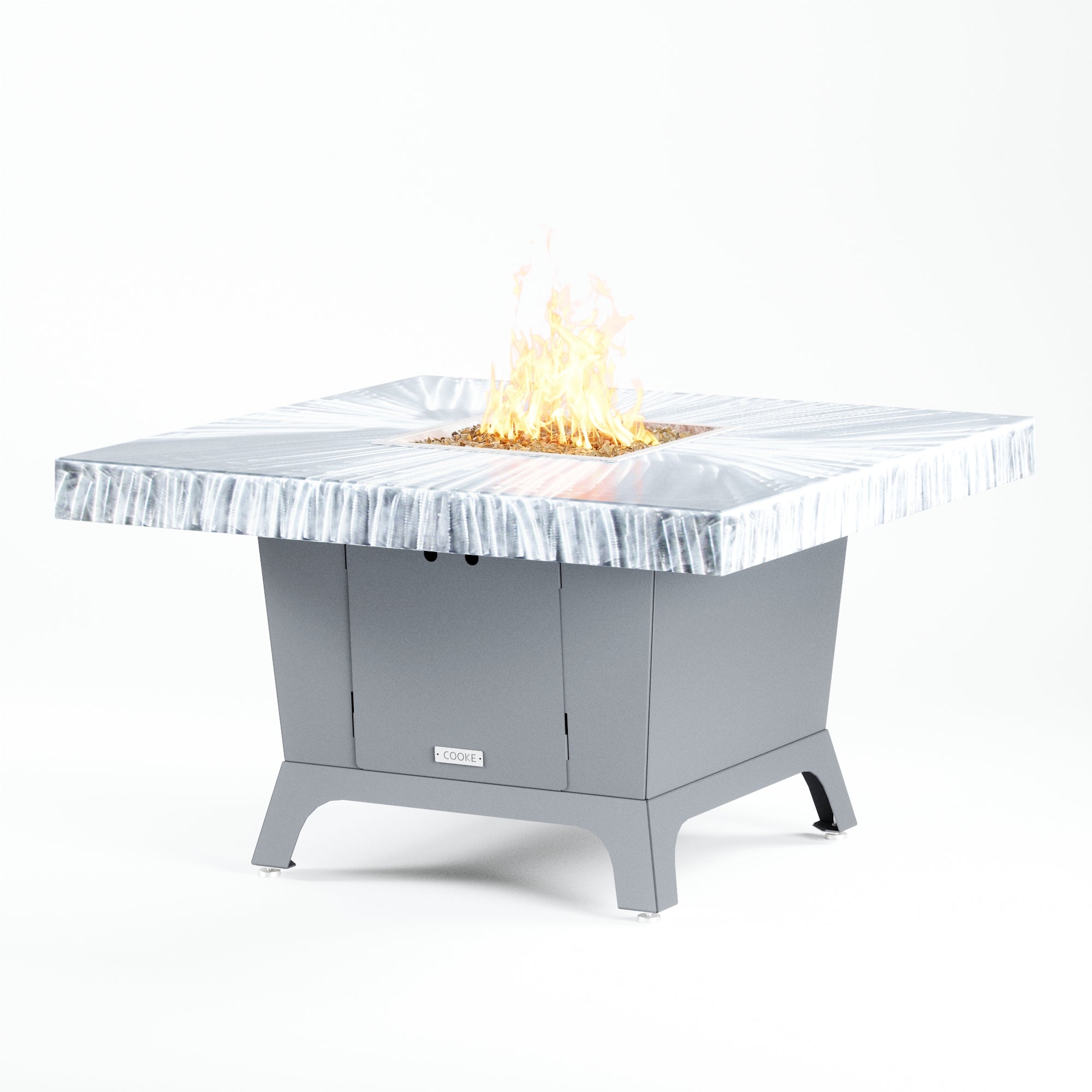 Dine under the stars with a COOKE Parkway fire pit table. The Parkway fire pit table is COOKE's solution to a great-looking, quality, made-in-USA square fire pit table that is versatile and a great value. This dining height fire pit table features a generous table top with a modern design. This table is big enough for ample seating but is carefully designed to be integrated into landscaped lounge areas, open patio spaces with planters, or near fountains and water features. The COOKE Parkway is hands down the best value for an all aluminum or real stone fire pit table.
