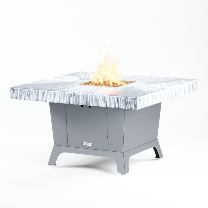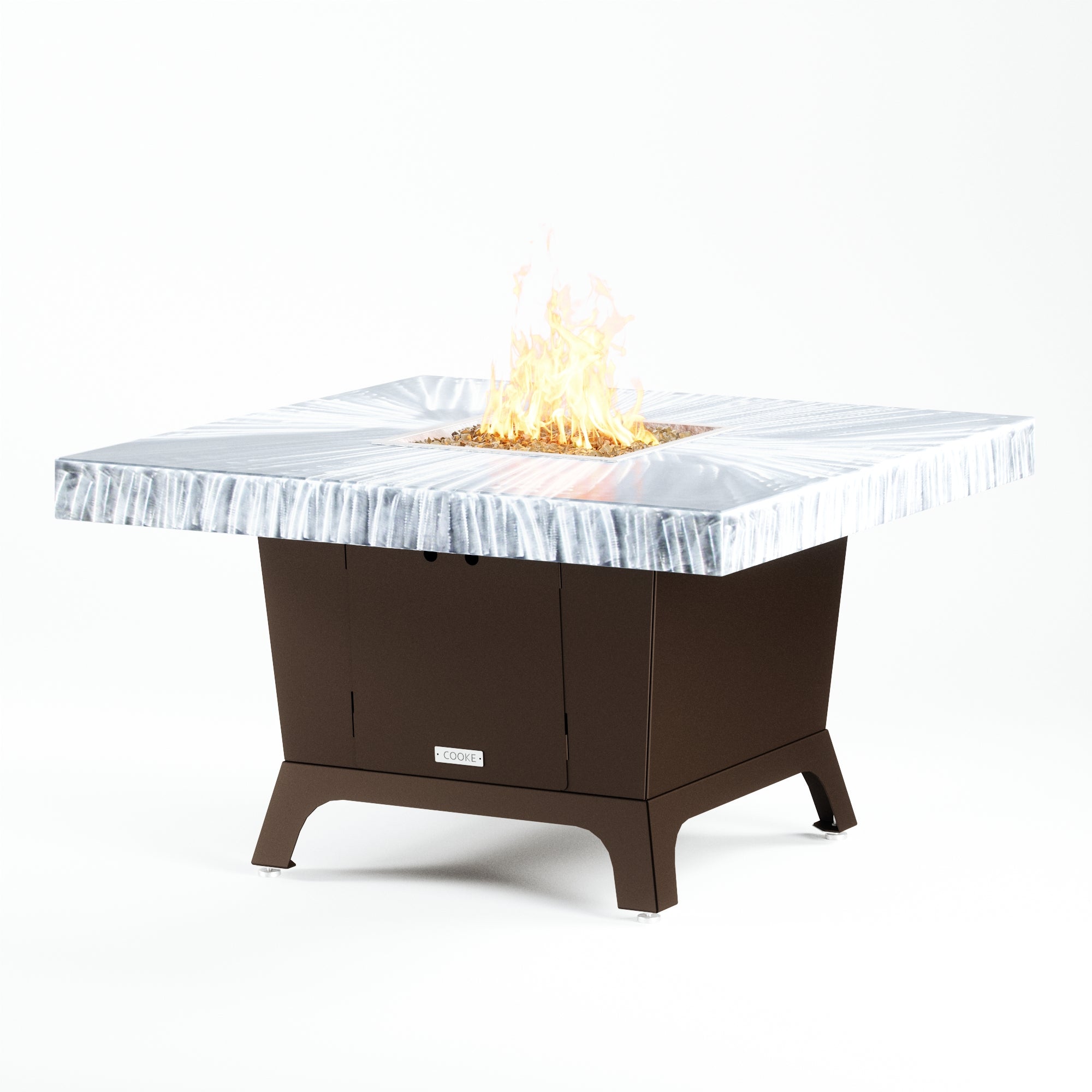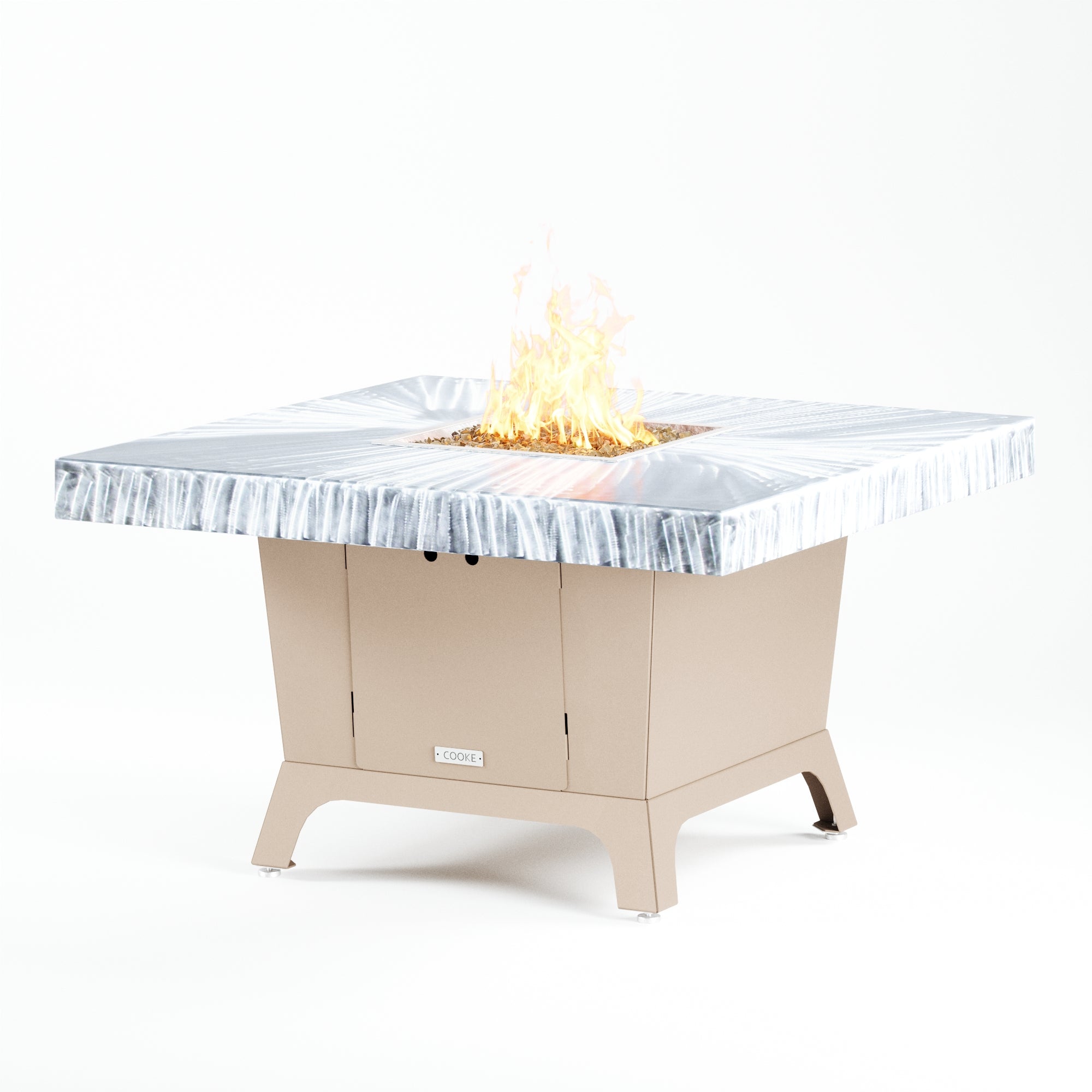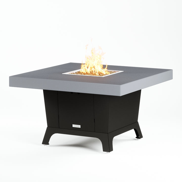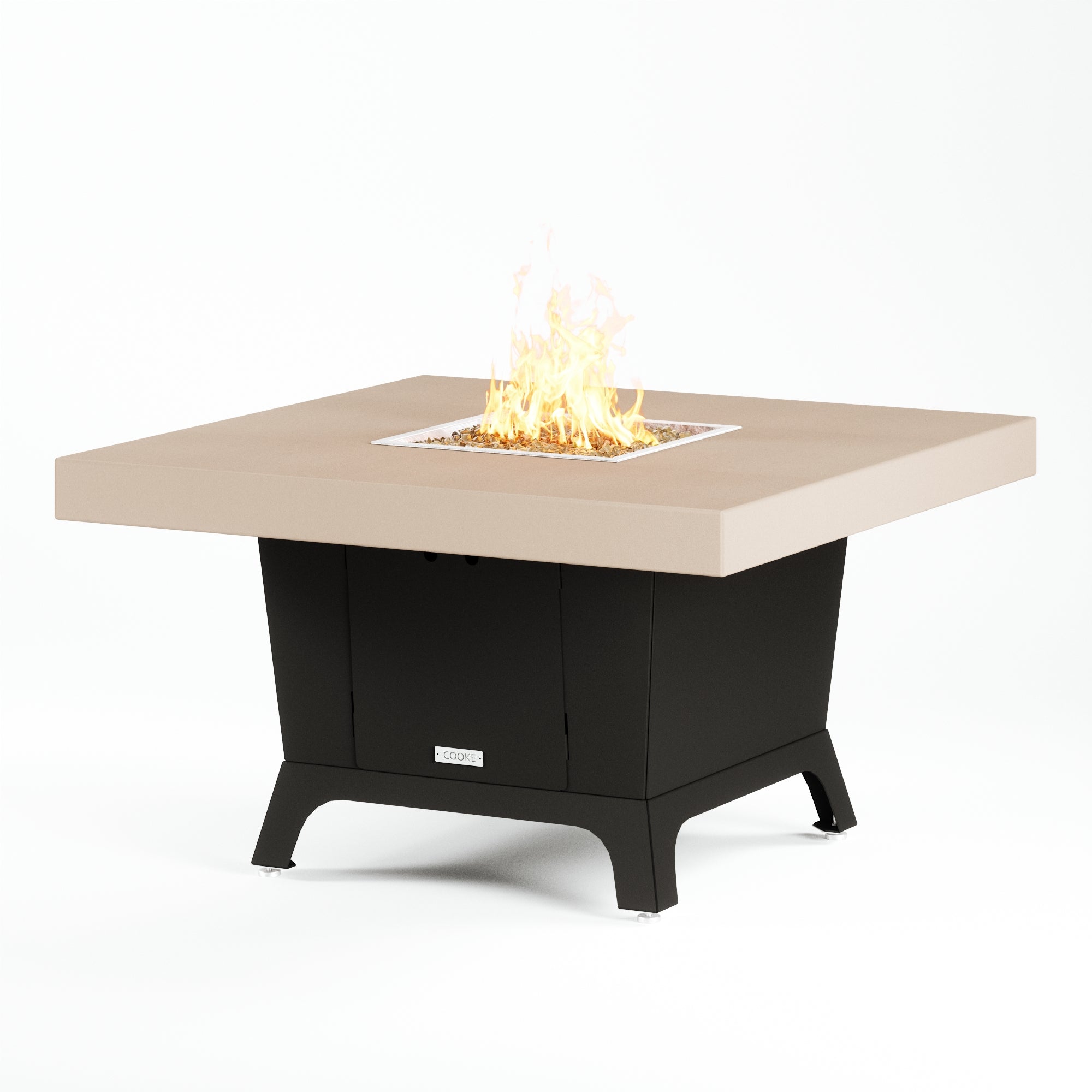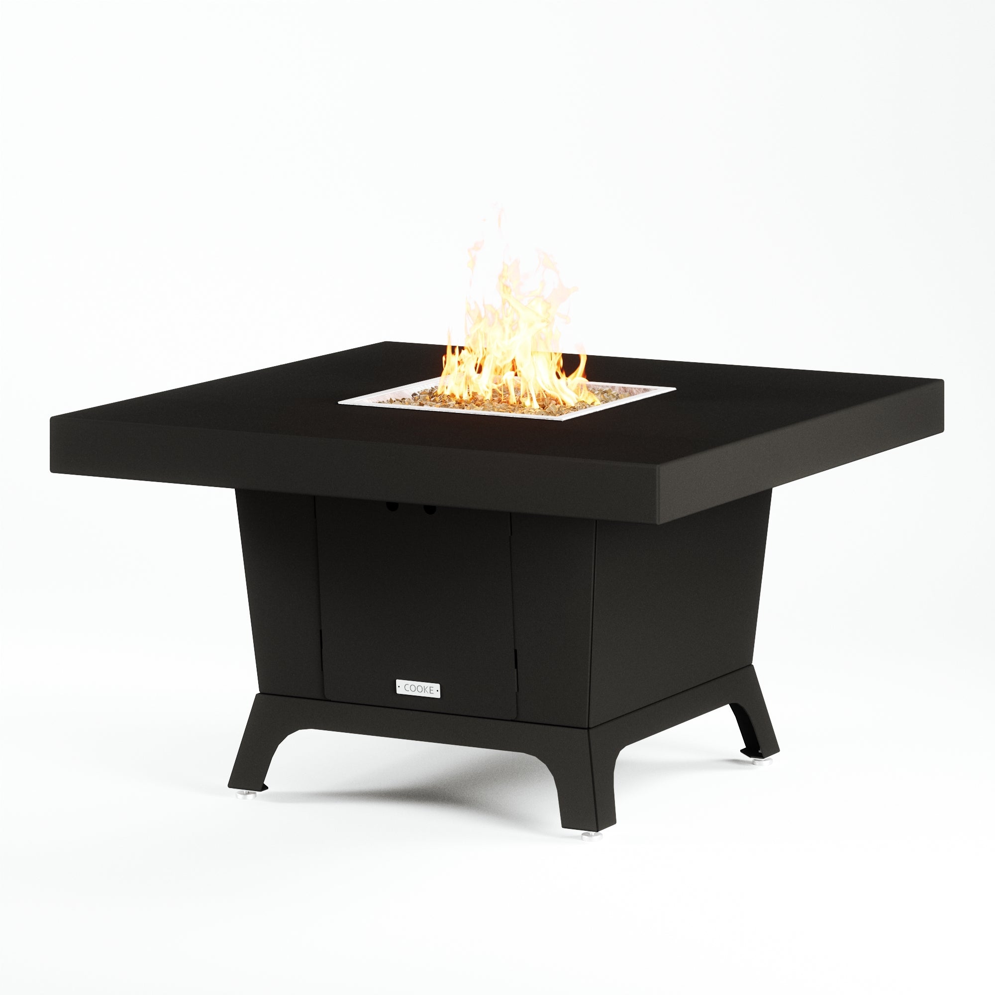 Dine under the stars with a COOKE Parkway fire pit table. The Parkway fire pit table is COOKE's solution to a great-looking, quality, made-in-USA square fire pit table that is versatile and a great value. This dining height fire pit table features a generous table top with a modern design. This table is big enough for ample seating but is carefully designed to be integrated into landscaped lounge areas, open patio spaces with planters, or near fountains and water features. The COOKE Parkway is hands down the best value for an all aluminum or real stone fire pit table.