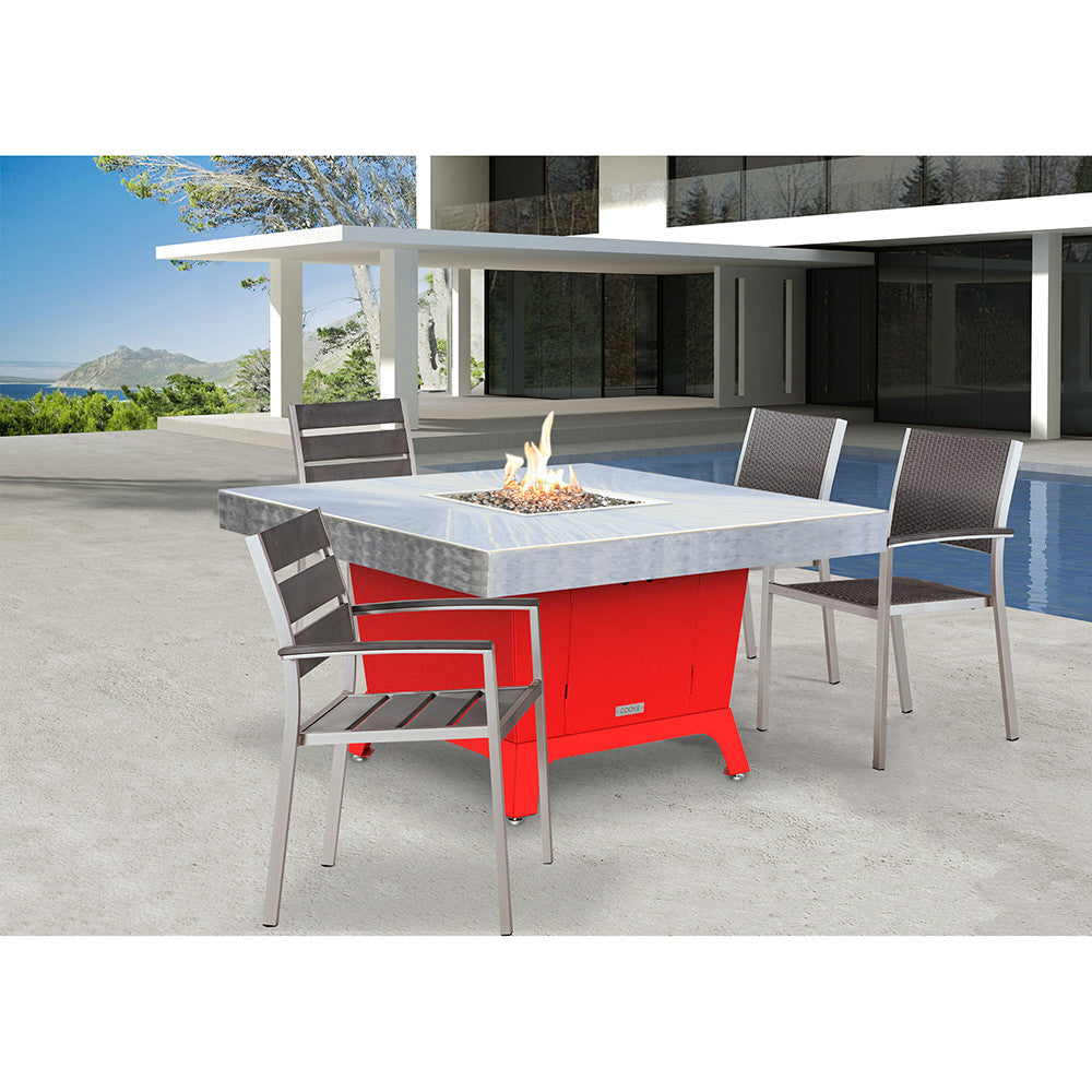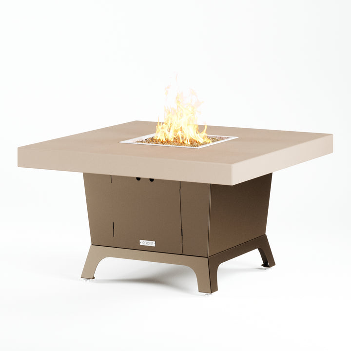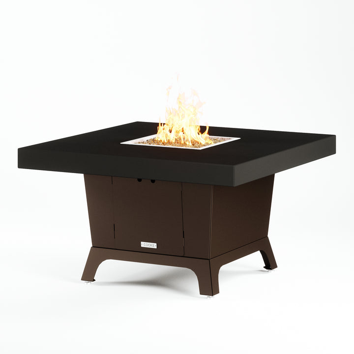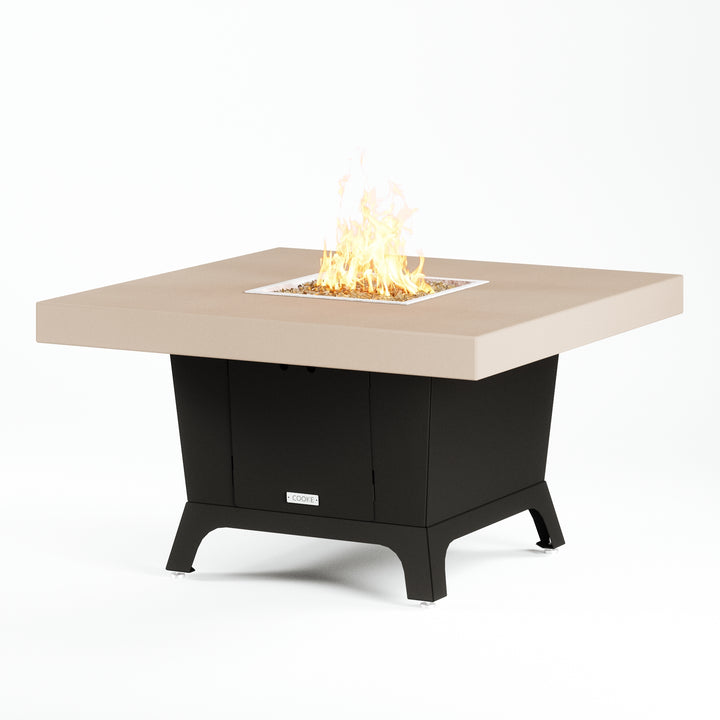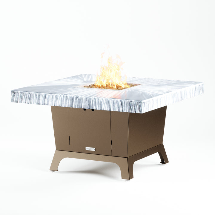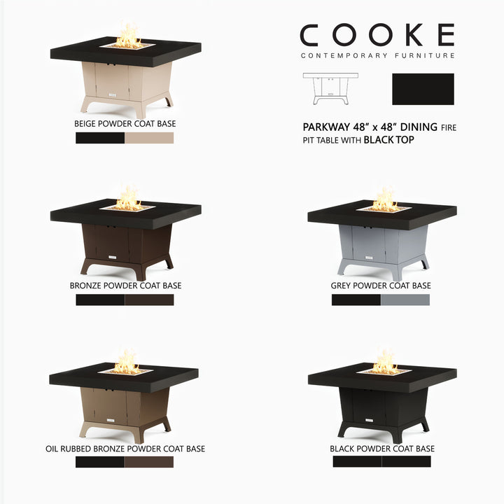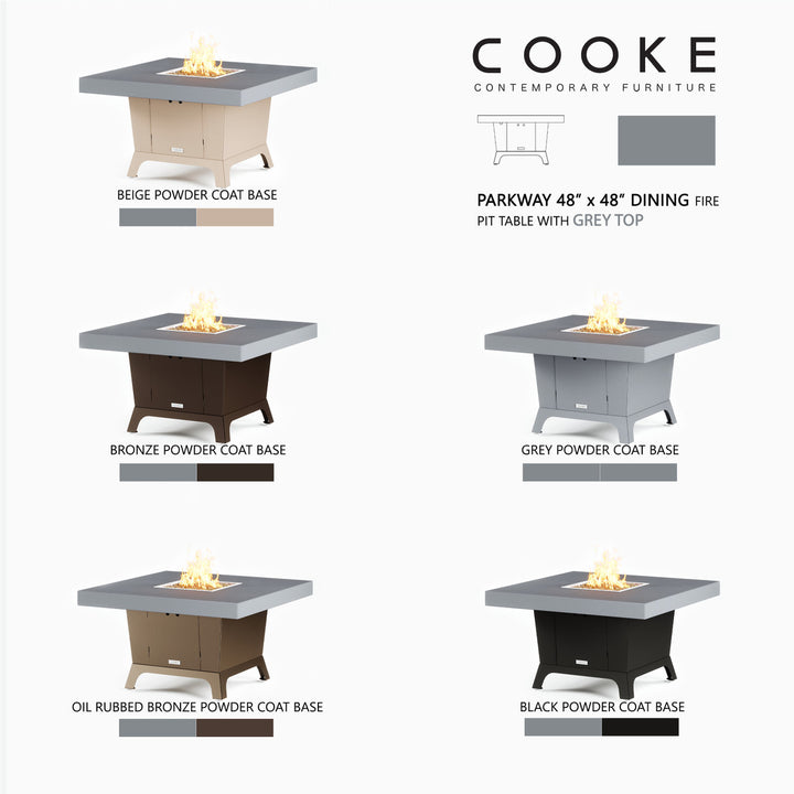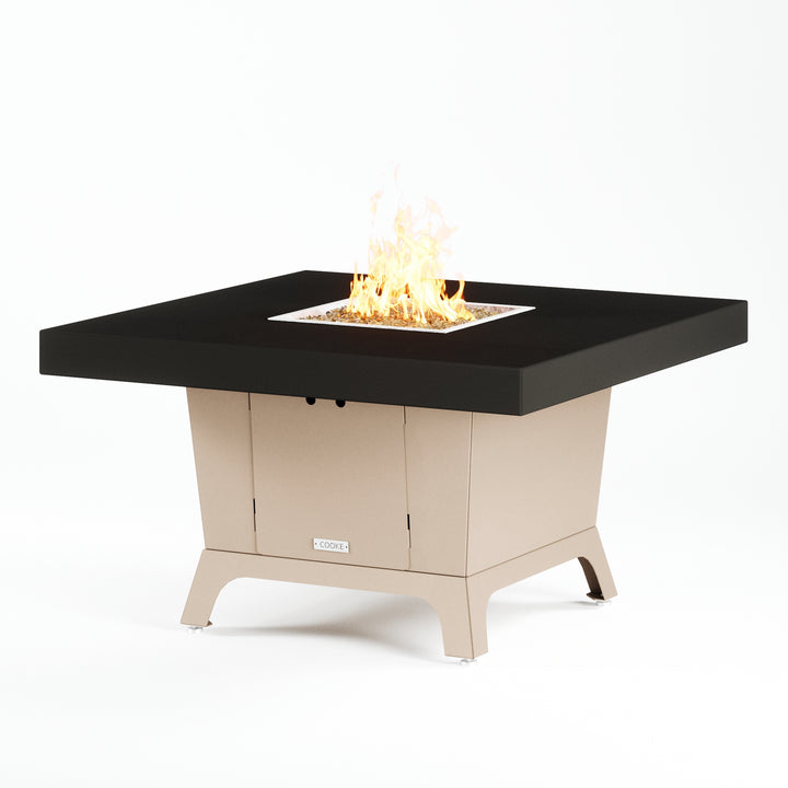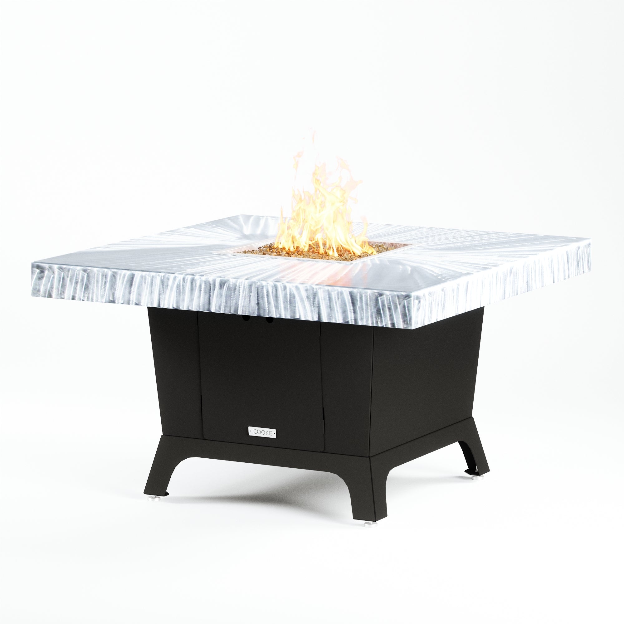 Dine under the stars with a COOKE Parkway fire pit table. The Parkway fire pit table is COOKE's solution to a great-looking, quality, made-in-USA square fire pit table that is versatile and a great value. This dining height fire pit table features a generous table top with a modern design. This table is big enough for ample seating but is carefully designed to be integrated into landscaped lounge areas, open patio spaces with planters, or near fountains and water features. The COOKE Parkway is hands down the best value for an all aluminum or real stone fire pit table.