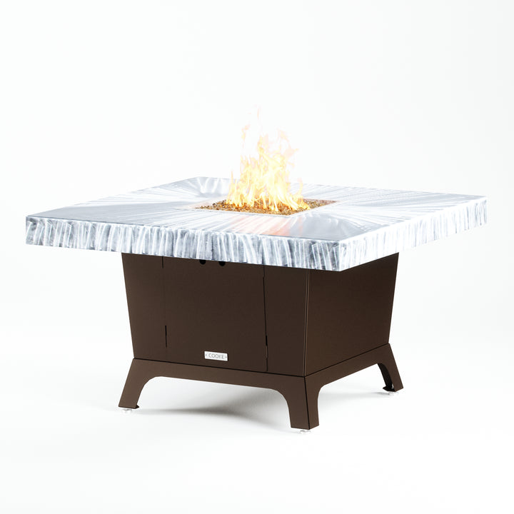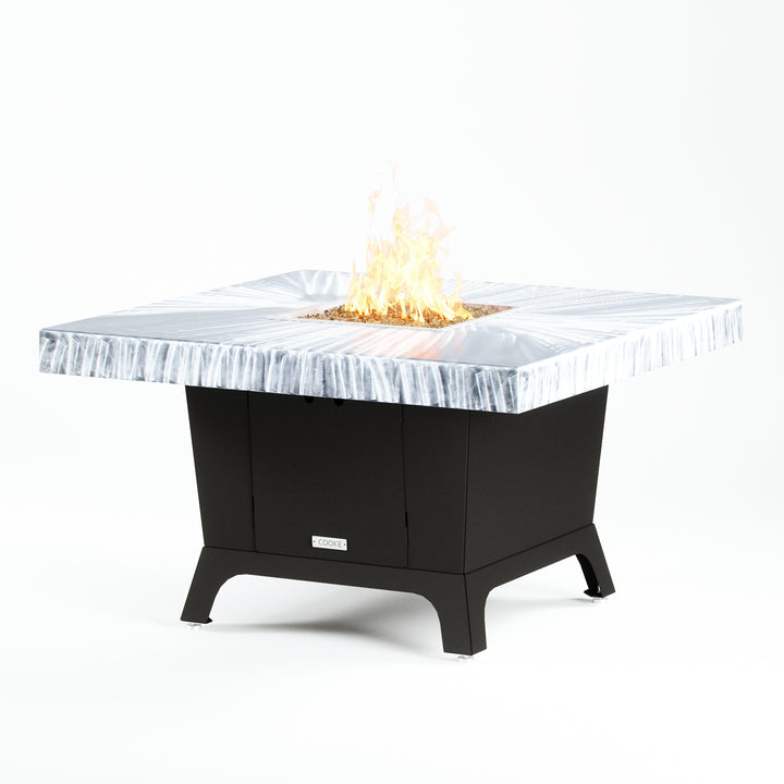 The 48" x 48" table top is the perfect medium size table and accommodates seating up to 4. Our customers love this table's stain resistant aluminum table top which has plenty of room for small plates and drinks. COOKE produces some of the finest fire pit tables in the industry which can be seen in the level of detail brought to the table top surface. Finally, a fire pit table with a premium table top!