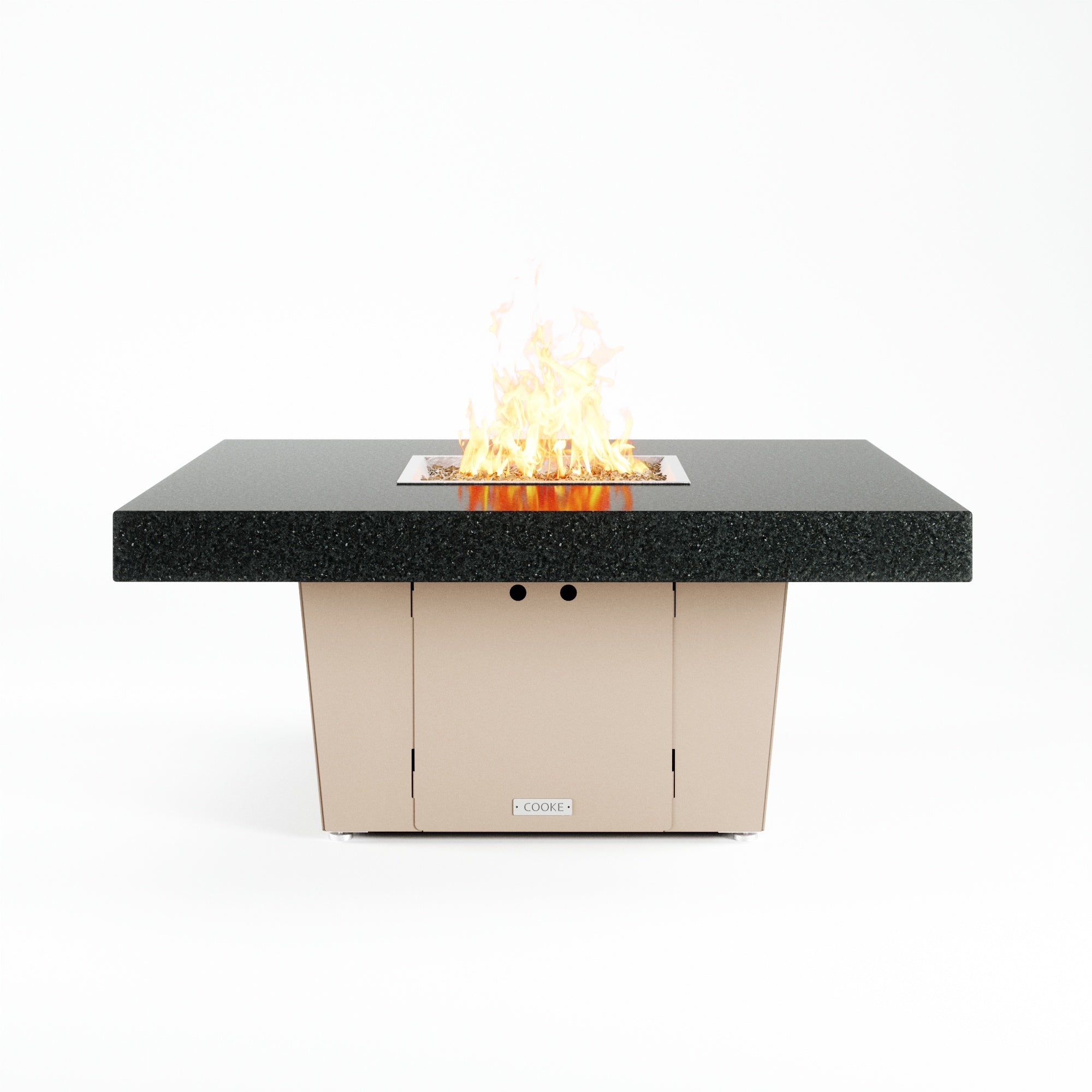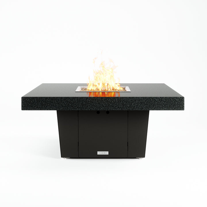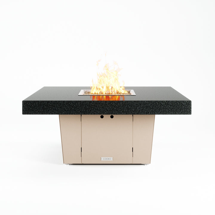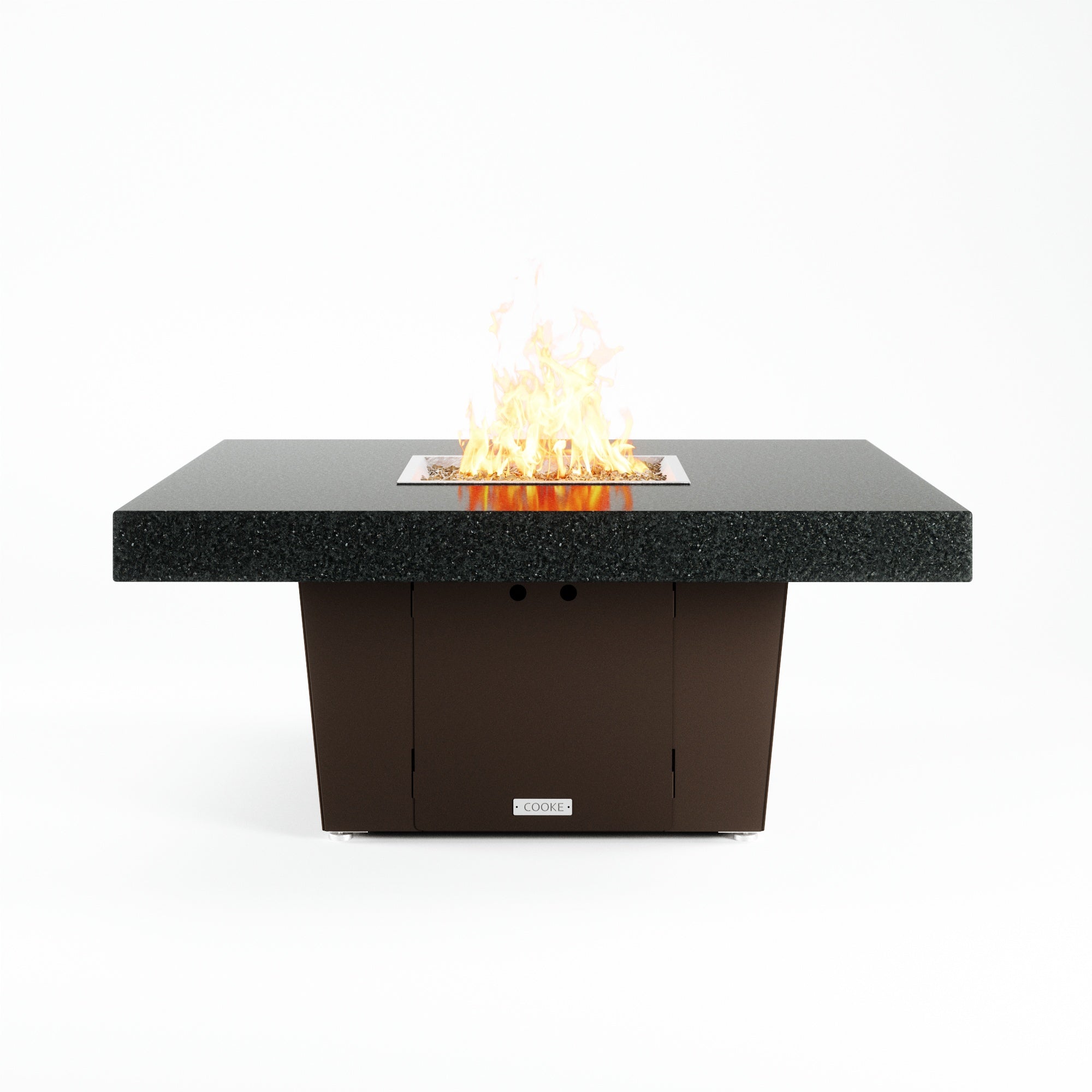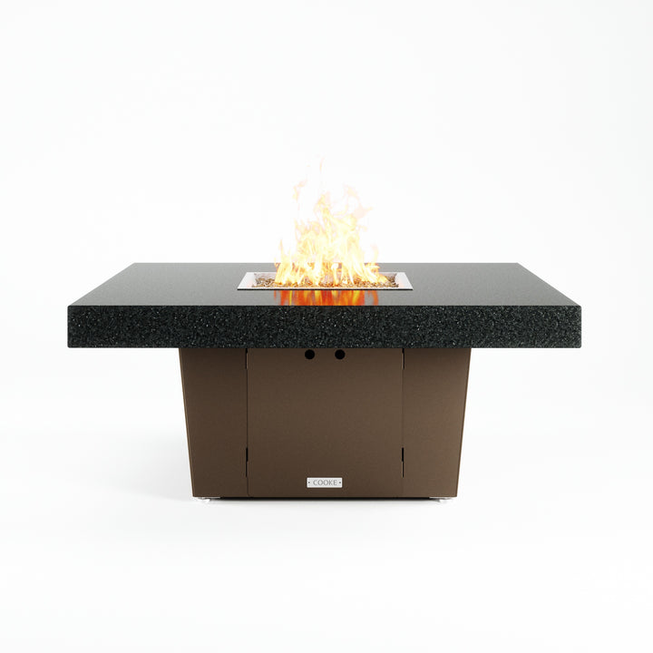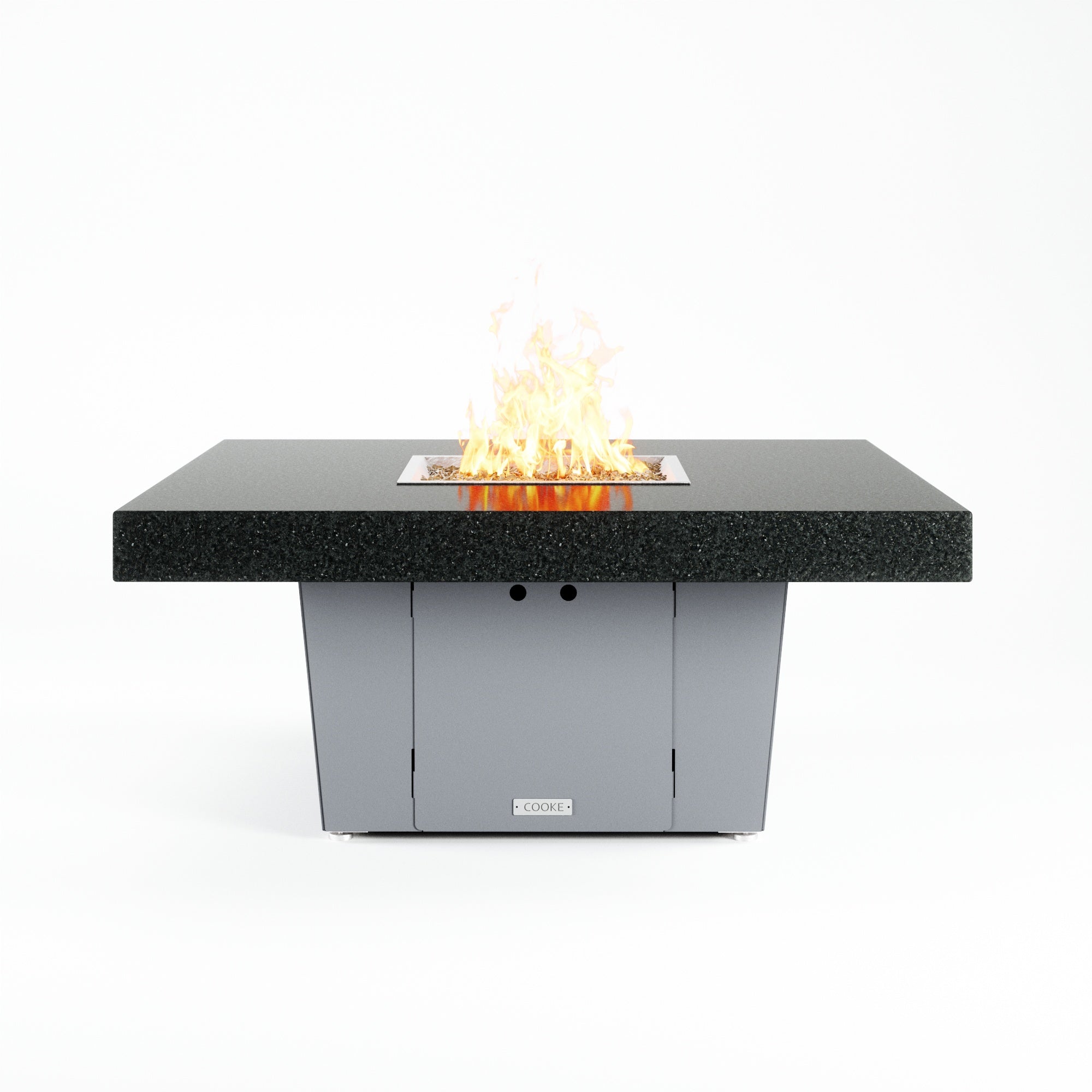 This table features tapered base for more footroom and a 4" thick top. Choose from COOKE’s selection of real, one-piece premium granite tops or satin finish powdercoat colors. COOKE granite is cut from real, one-of-a kind, slabs also used for high end architectural applications. Cover up the fire pit burner with the included stainless steel lid and your Cooke fire pit table transforms into a functional and beautiful garden or patio table. This table is perfect for your romantic backyard jungle meeting spot, modern clubhouse, or contemporary outdoor concrete patio.
