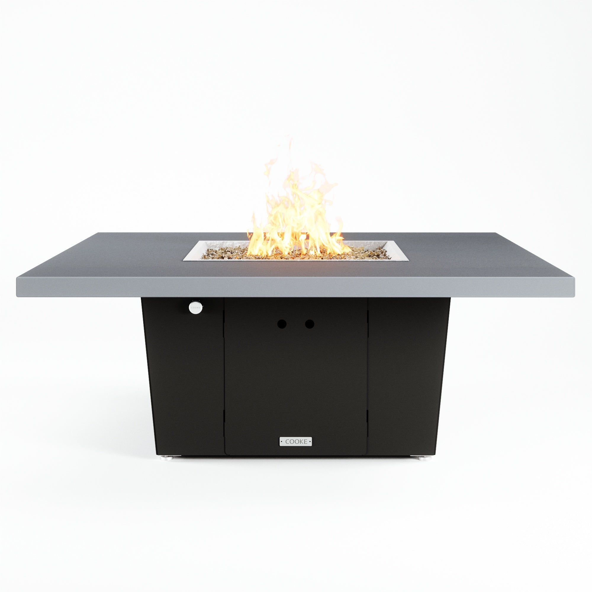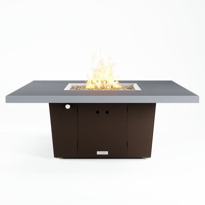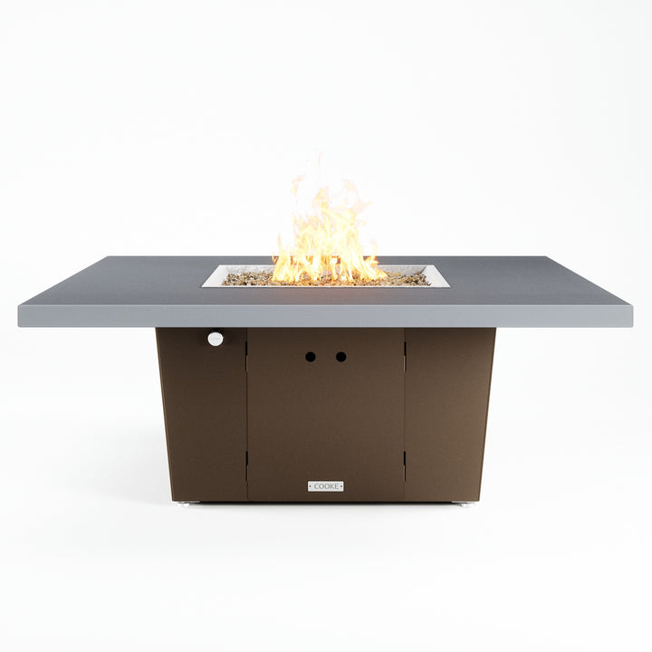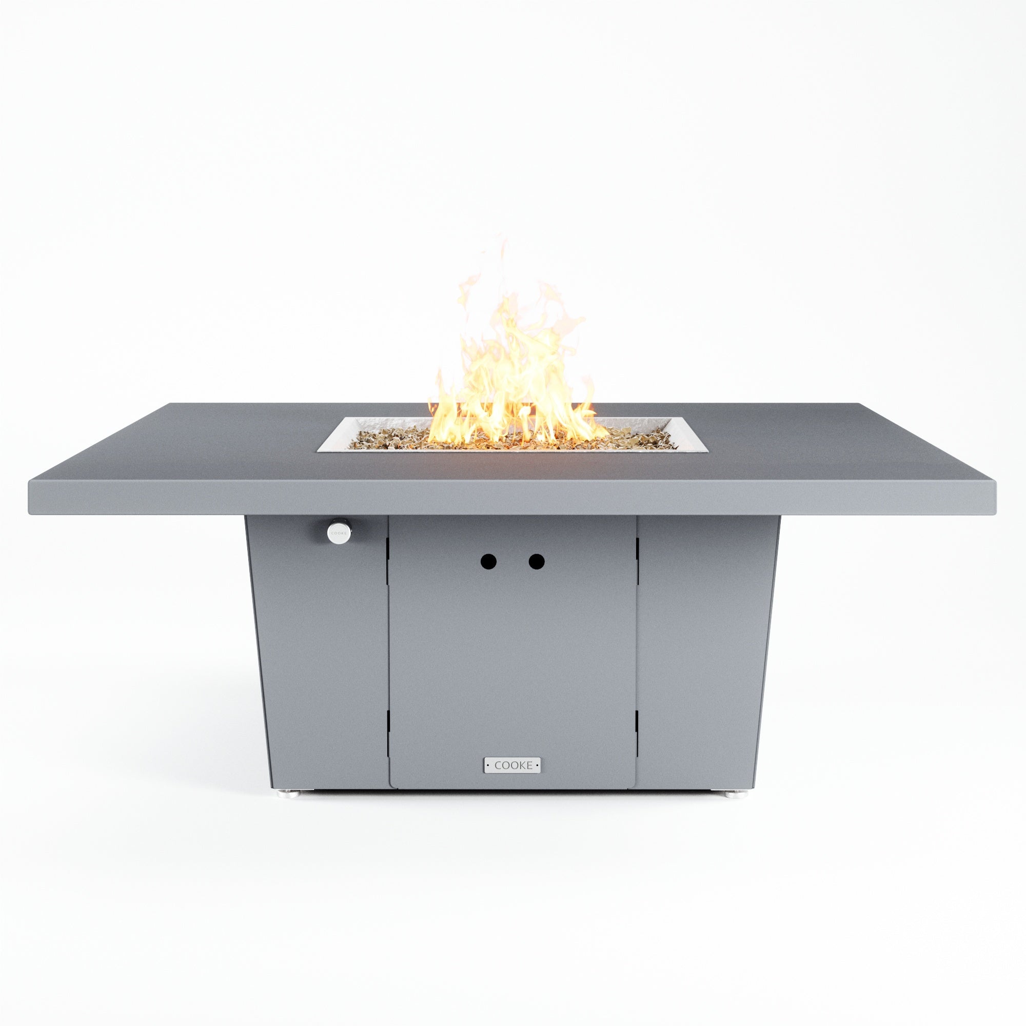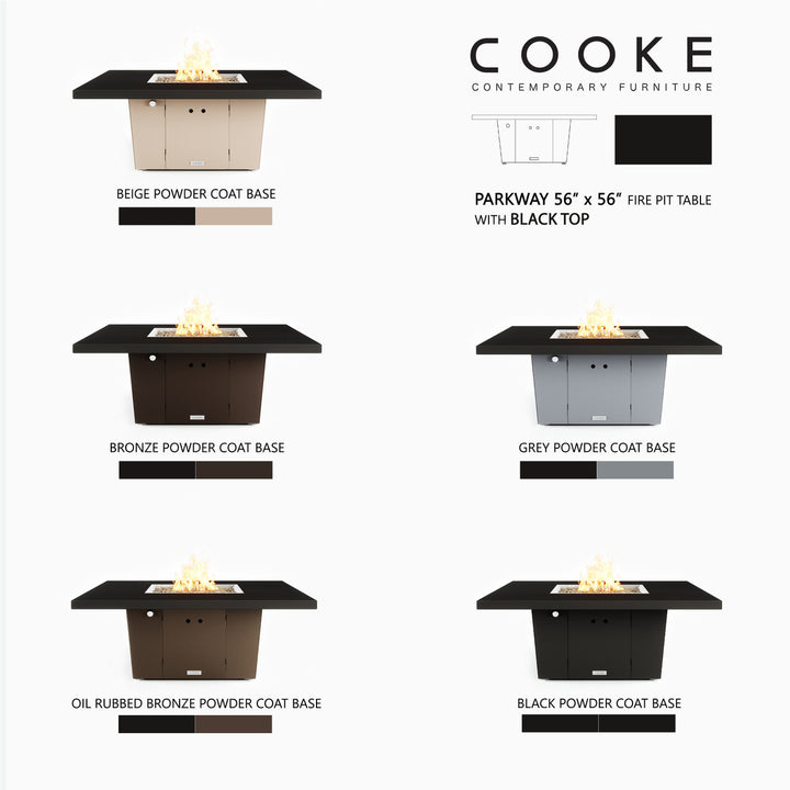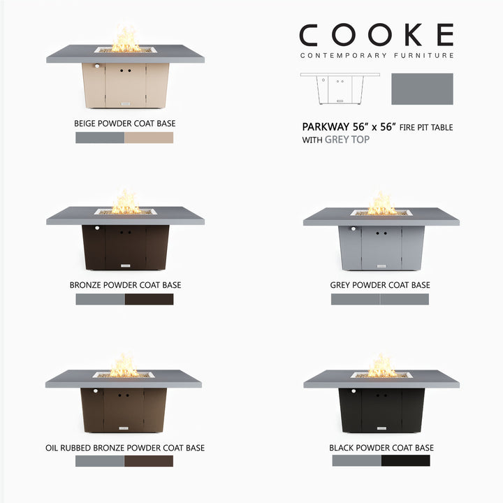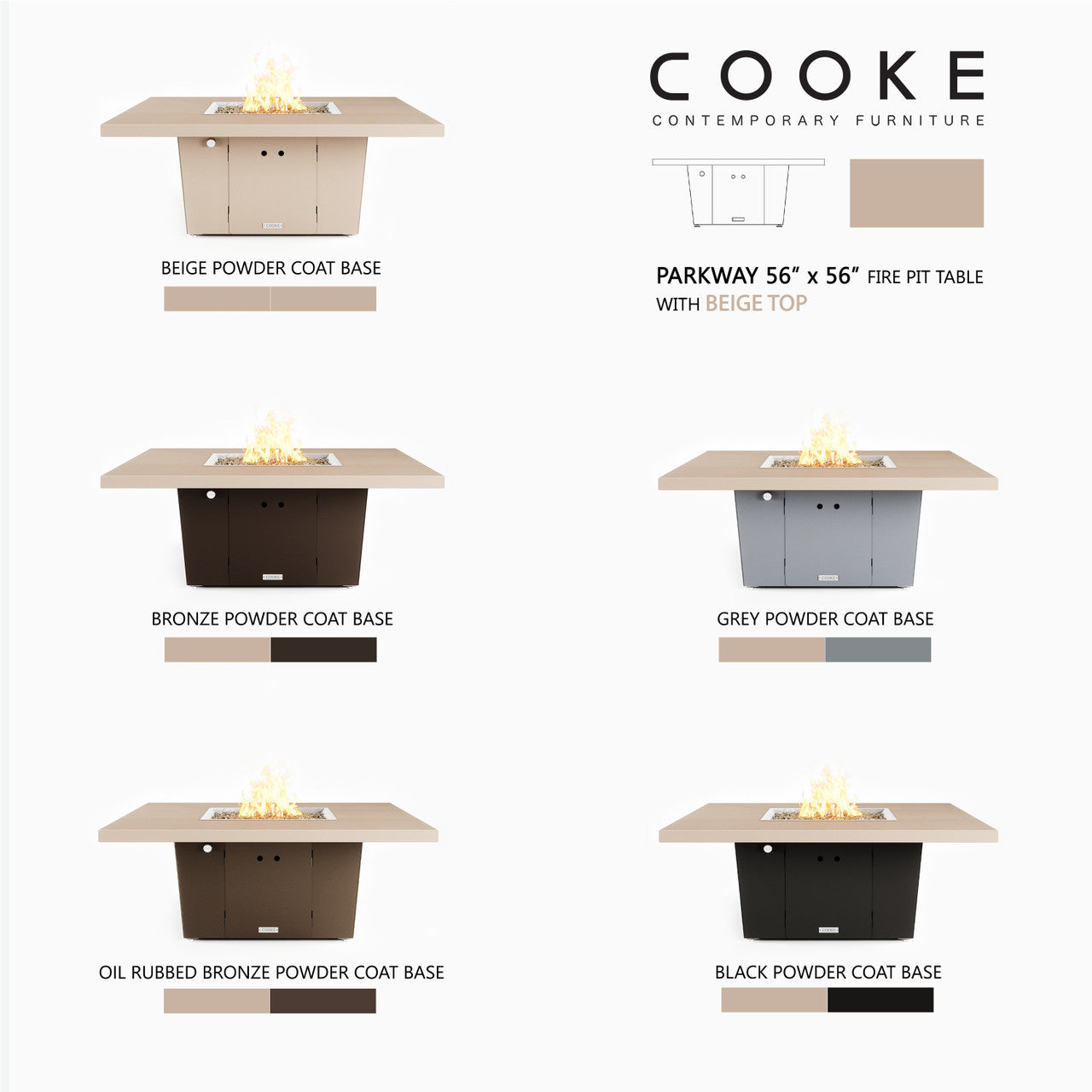 The Parkway fire pit table is COOKE's solution to a great-looking, quality, made-in-USA square fire pit table that is versatile and a great value. This chat height fire pit table features a generous table top on a 21" tall slightly tapered modern base. This table has fine all aluminum top in a variety of colors that radiate a clean simplicity. This table is big enough for ample seating but is carefully designed to be integrated into landscaped lounge areas, open patio spaces with planters, or near fountains and water features. We love the foot room under the table.The COOKE Parkway is hands down the best value for an all aluminum or real stone fire pit table.