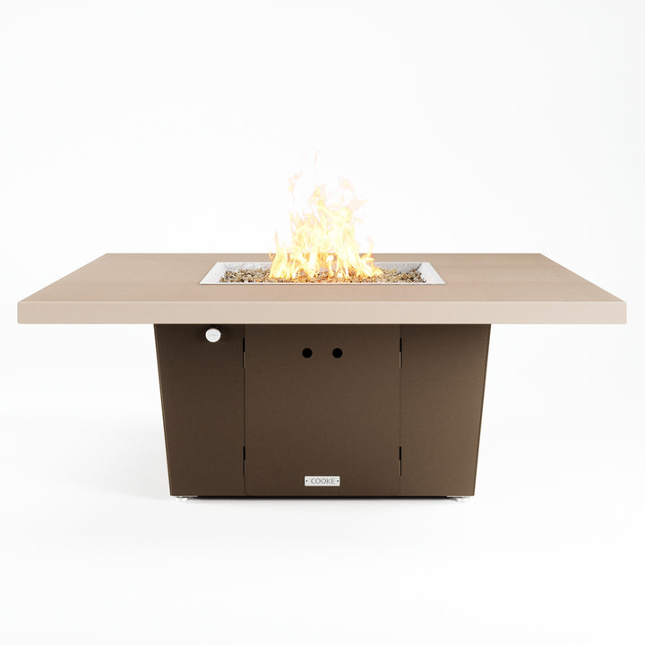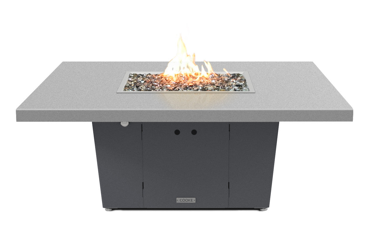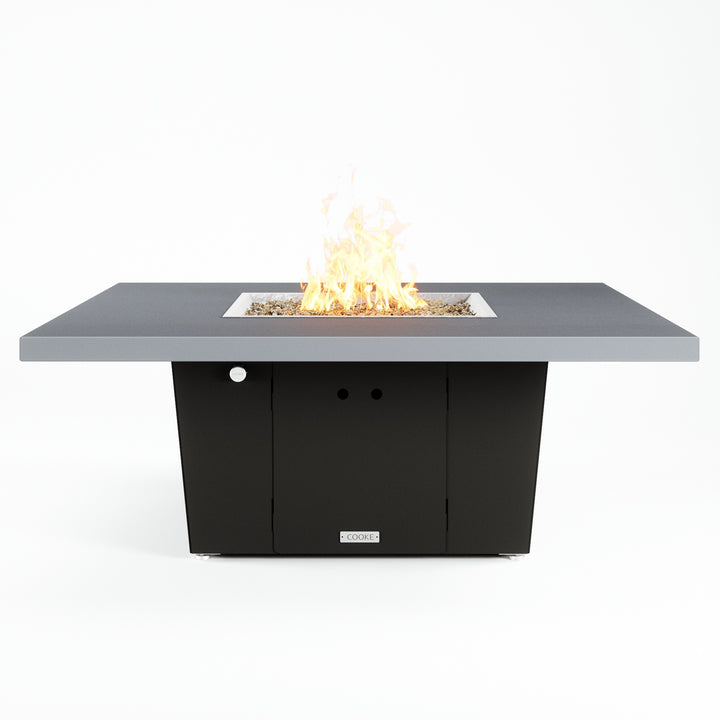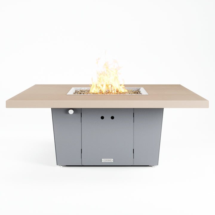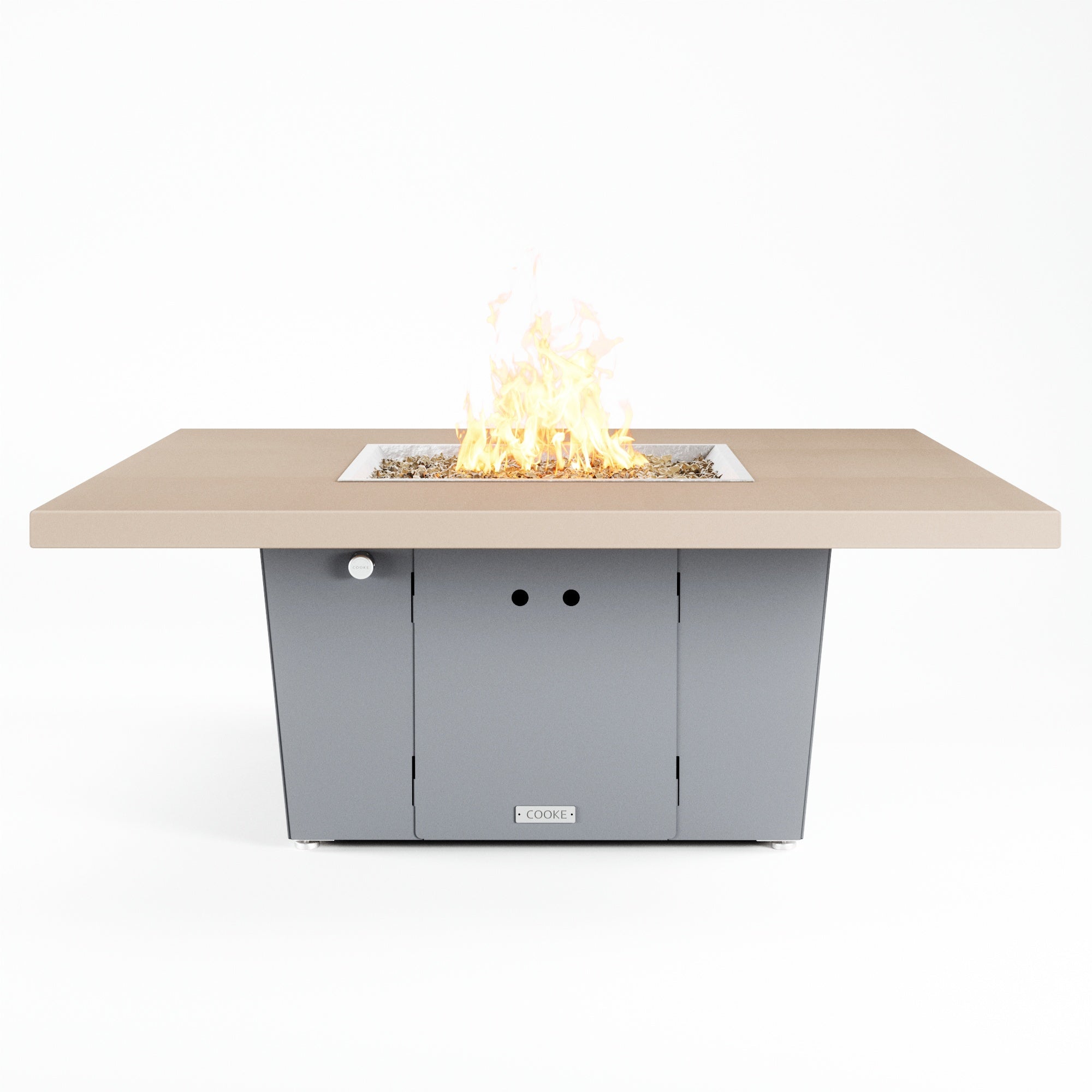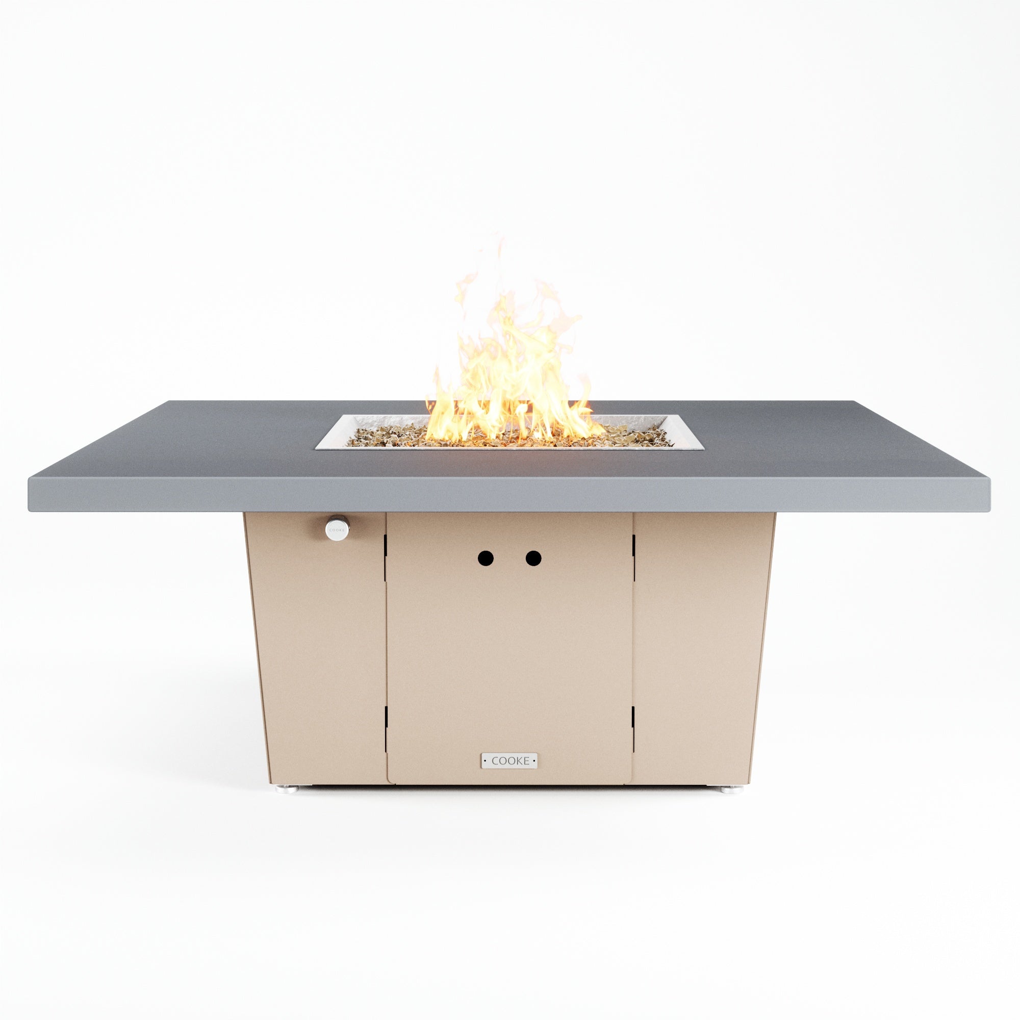 The Parkway fire pit table is COOKE's solution to a great-looking, quality, made-in-USA square fire pit table that is versatile and a great value. This chat height fire pit table features a generous table top on a 21" tall slightly tapered modern base. This table has fine all aluminum top in a variety of colors that radiate a clean simplicity. This table is big enough for ample seating but is carefully designed to be integrated into landscaped lounge areas, open patio spaces with planters, or near fountains and water features. We love the foot room under the table.The COOKE Parkway is hands down the best value for an all aluminum or real stone fire pit table.