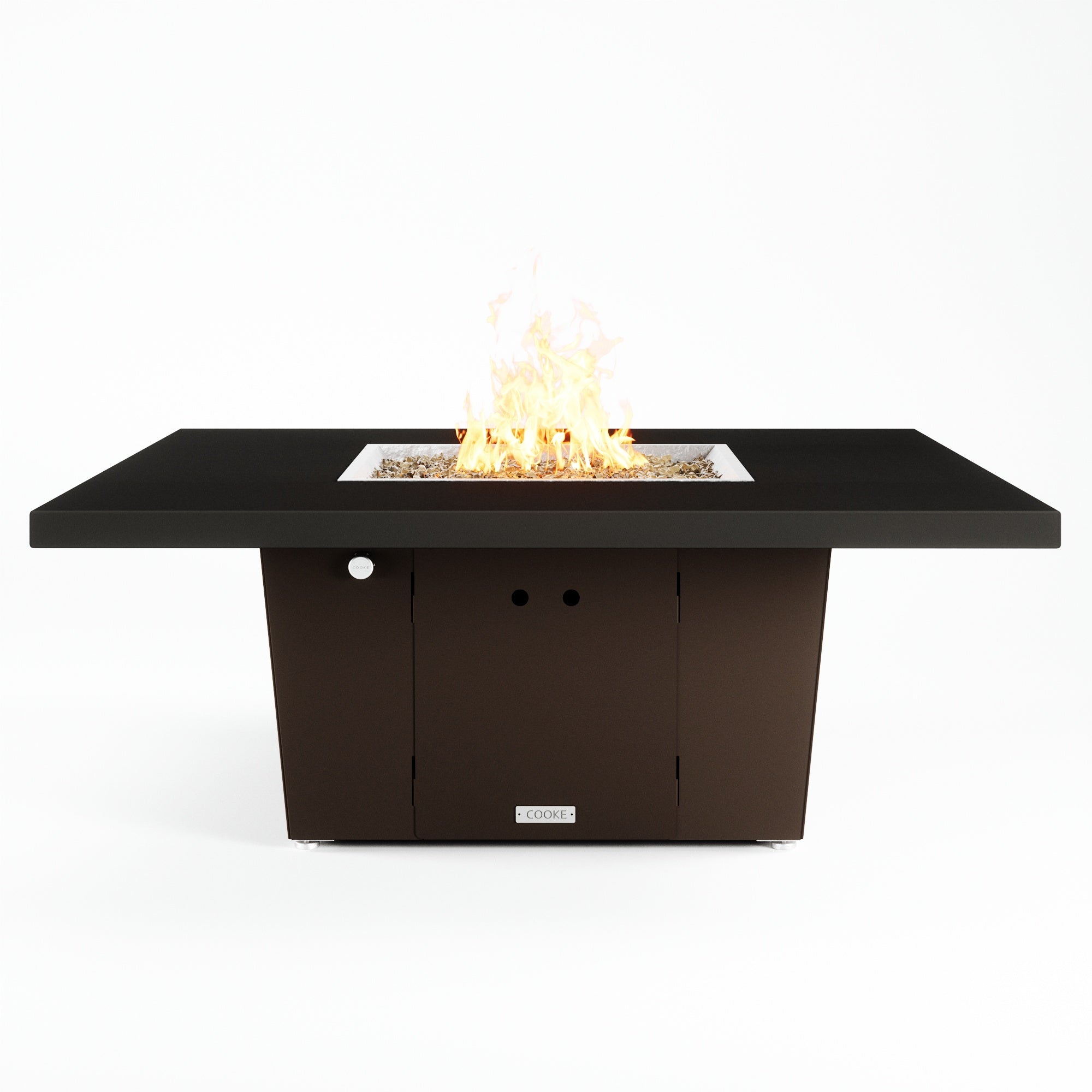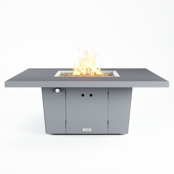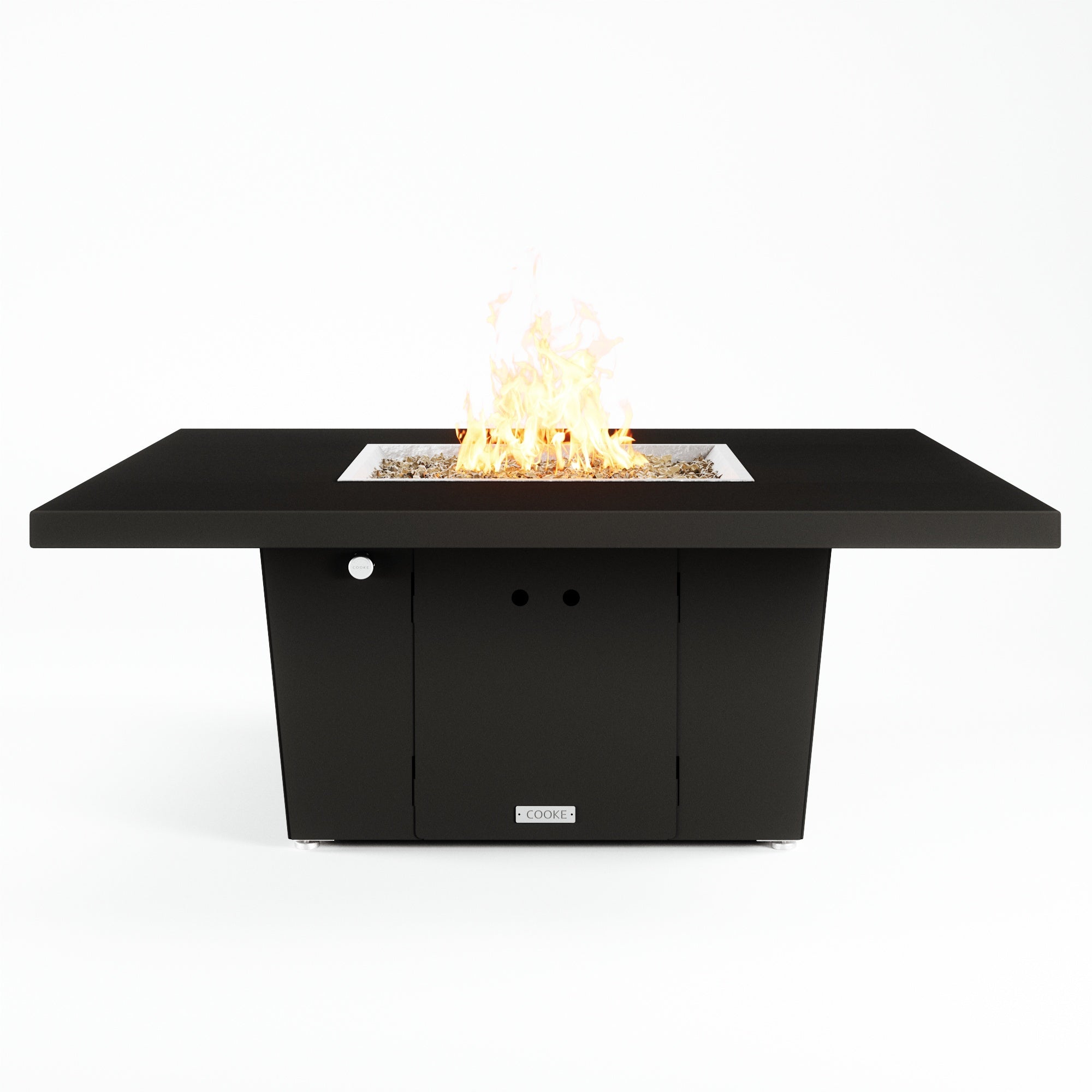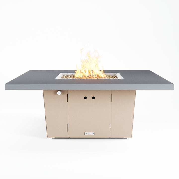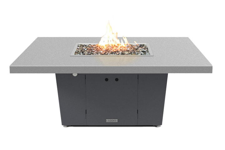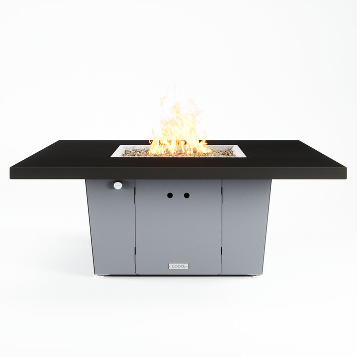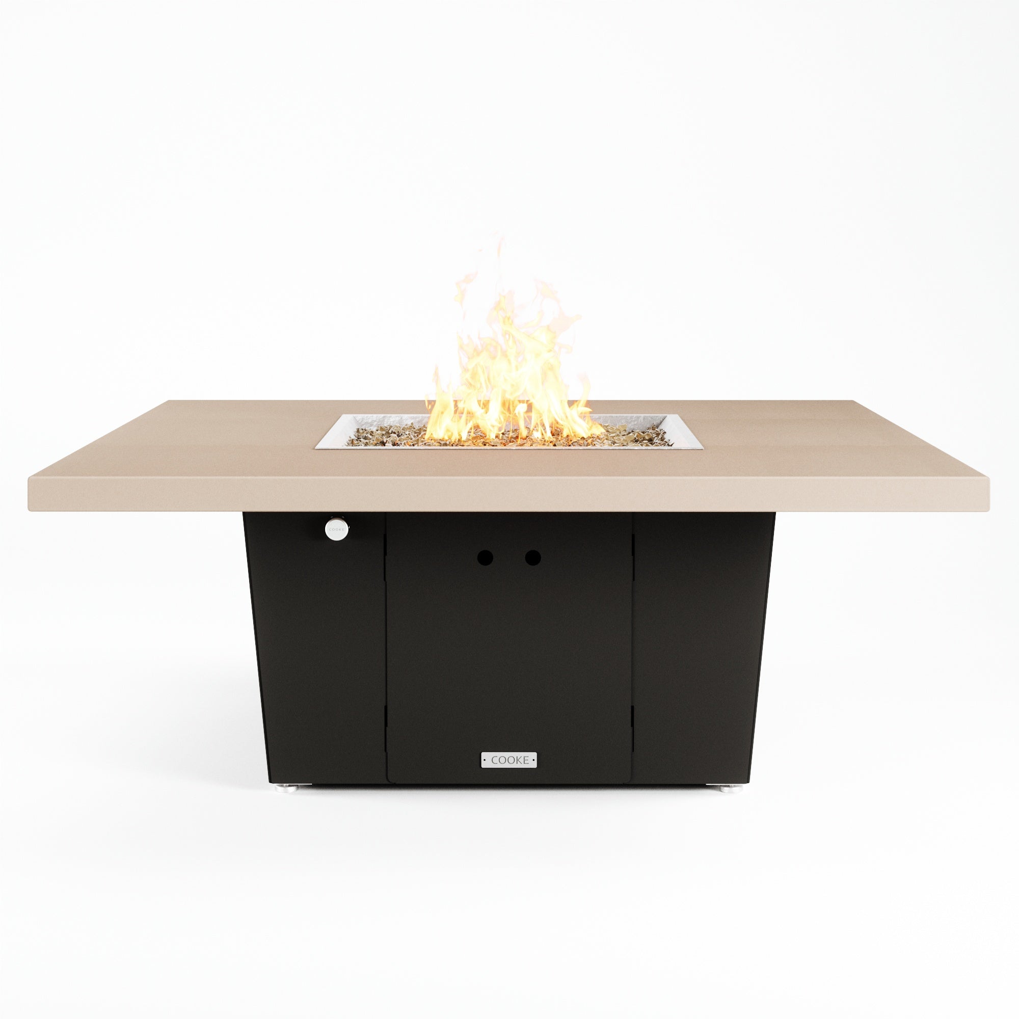 The Parkway fire pit table is COOKE's solution to a great-looking, quality, made-in-USA square fire pit table that is versatile and a great value. This chat height fire pit table features a generous table top on a 21" tall slightly tapered modern base. This table has fine all aluminum top in a variety of colors that radiate a clean simplicity. This table is big enough for ample seating but is carefully designed to be integrated into landscaped lounge areas, open patio spaces with planters, or near fountains and water features. We love the foot room under the table.The COOKE Parkway is hands down the best value for an all aluminum or real stone fire pit table.