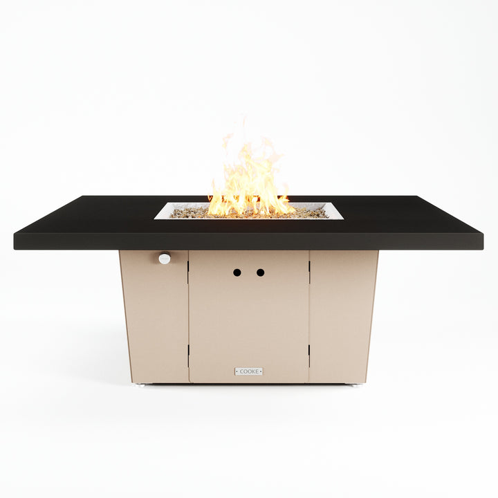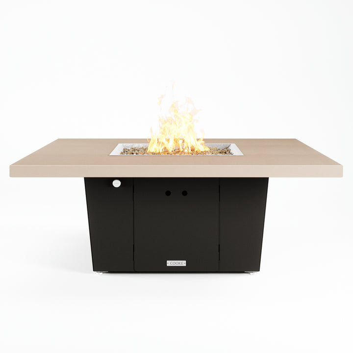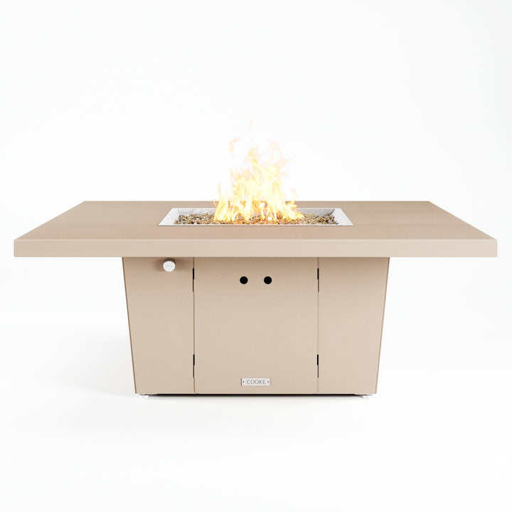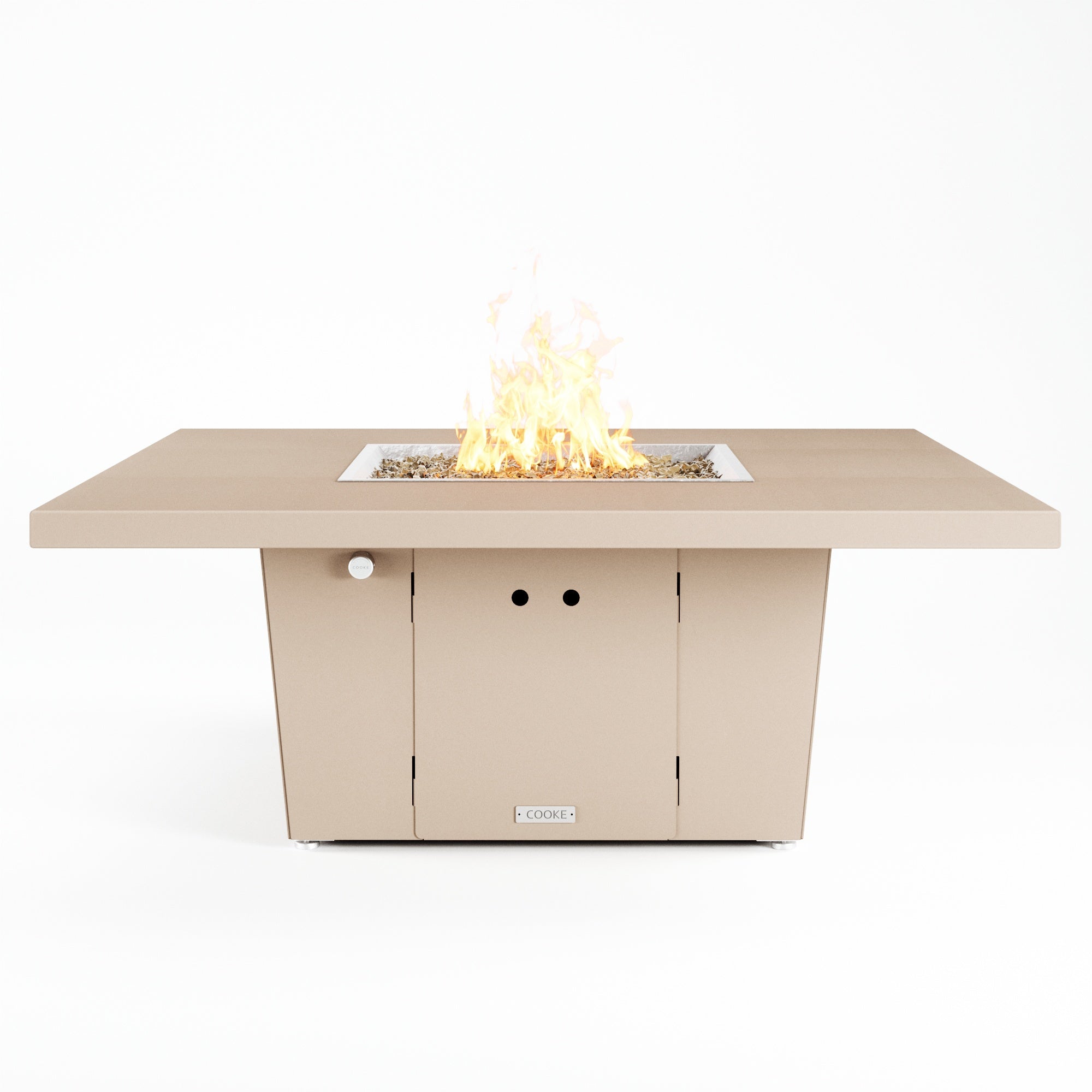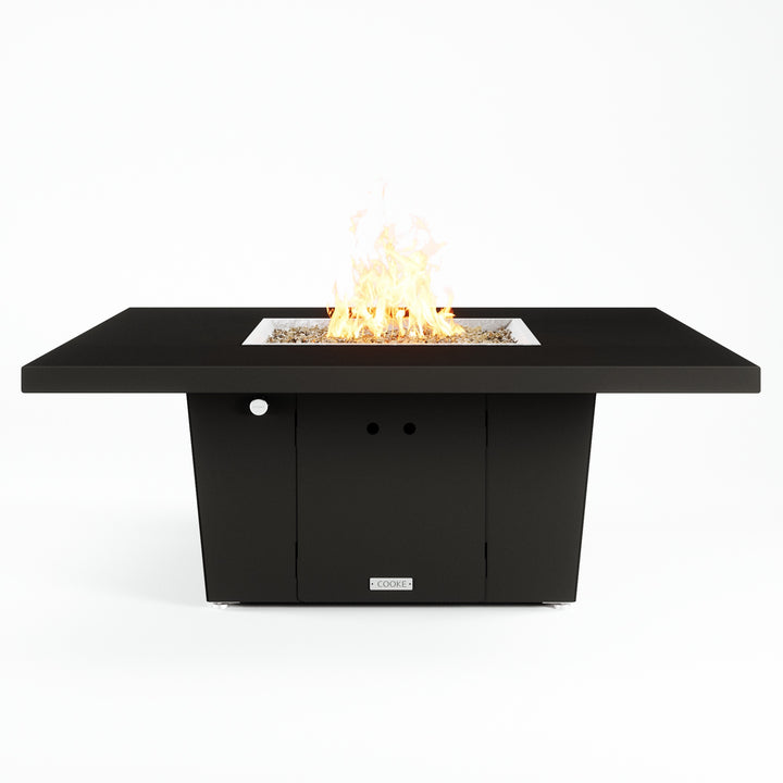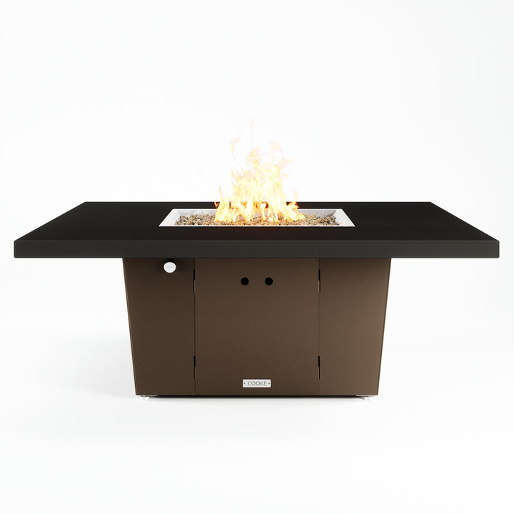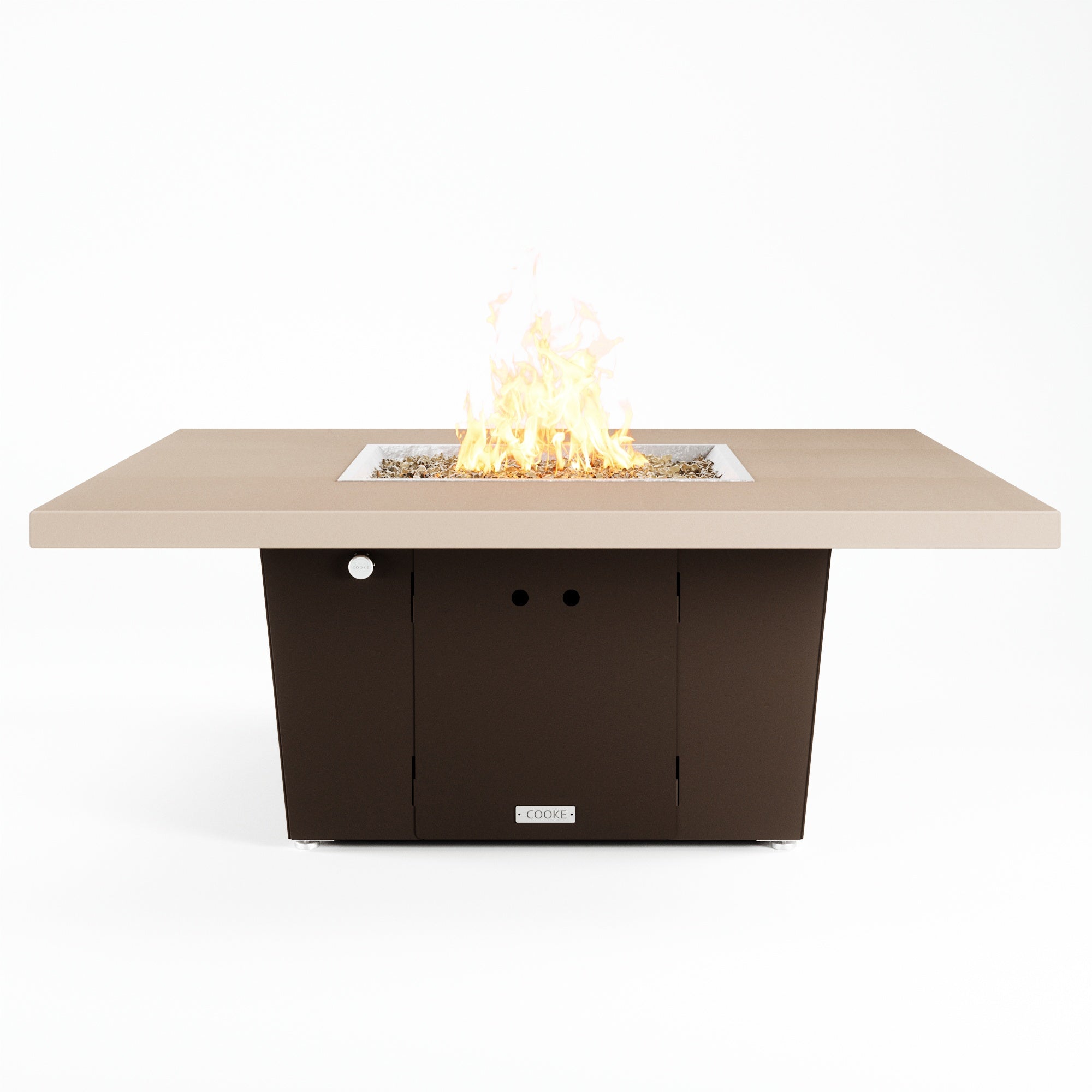 The Parkway fire pit table is COOKE's solution to a great-looking, quality, made-in-USA square fire pit table that is versatile and a great value. This chat height fire pit table features a generous table top on a 21" tall slightly tapered modern base. This table has fine all aluminum top in a variety of colors that radiate a clean simplicity. This table is big enough for ample seating but is carefully designed to be integrated into landscaped lounge areas, open patio spaces with planters, or near fountains and water features. We love the foot room under the table.The COOKE Parkway is hands down the best value for an all aluminum or real stone fire pit table.