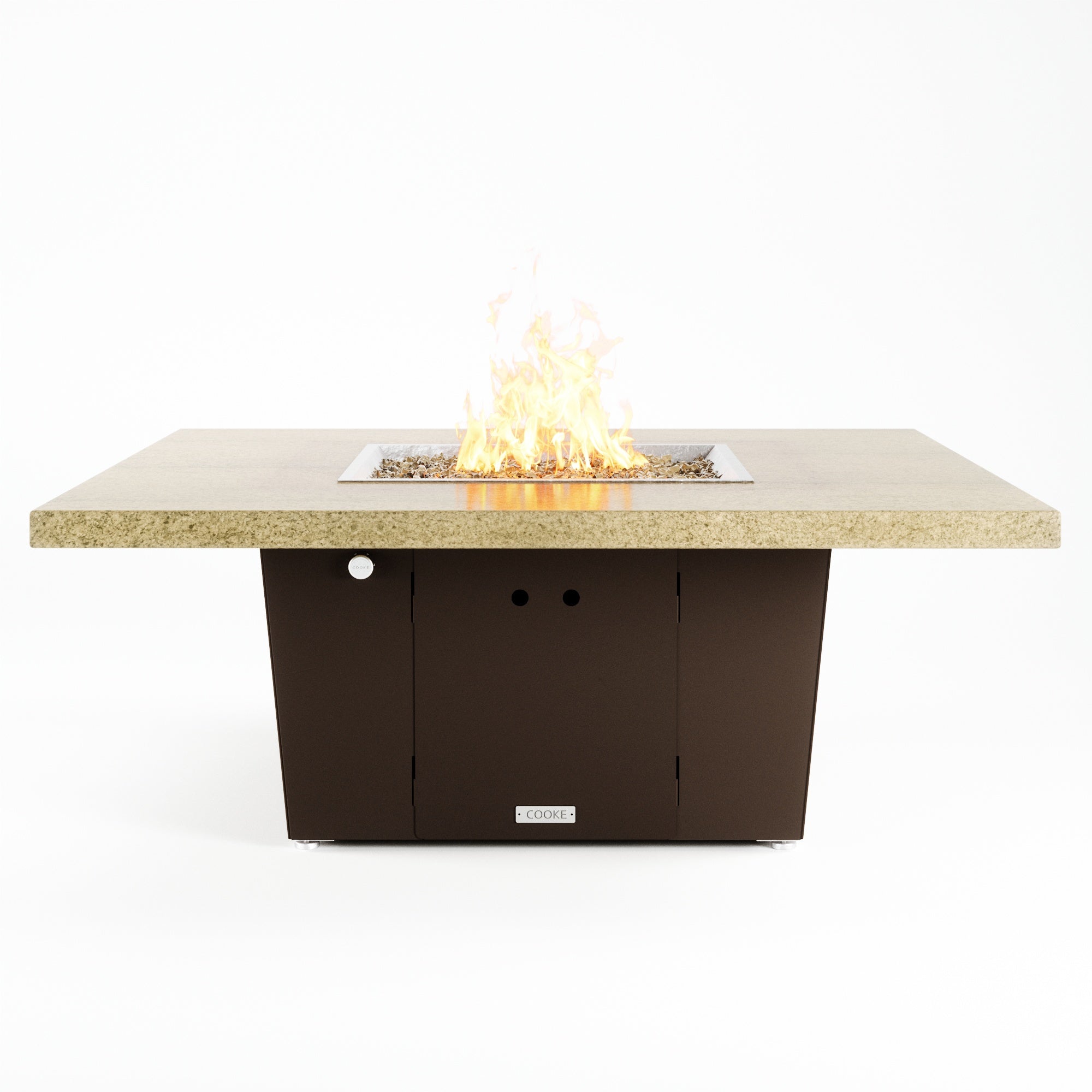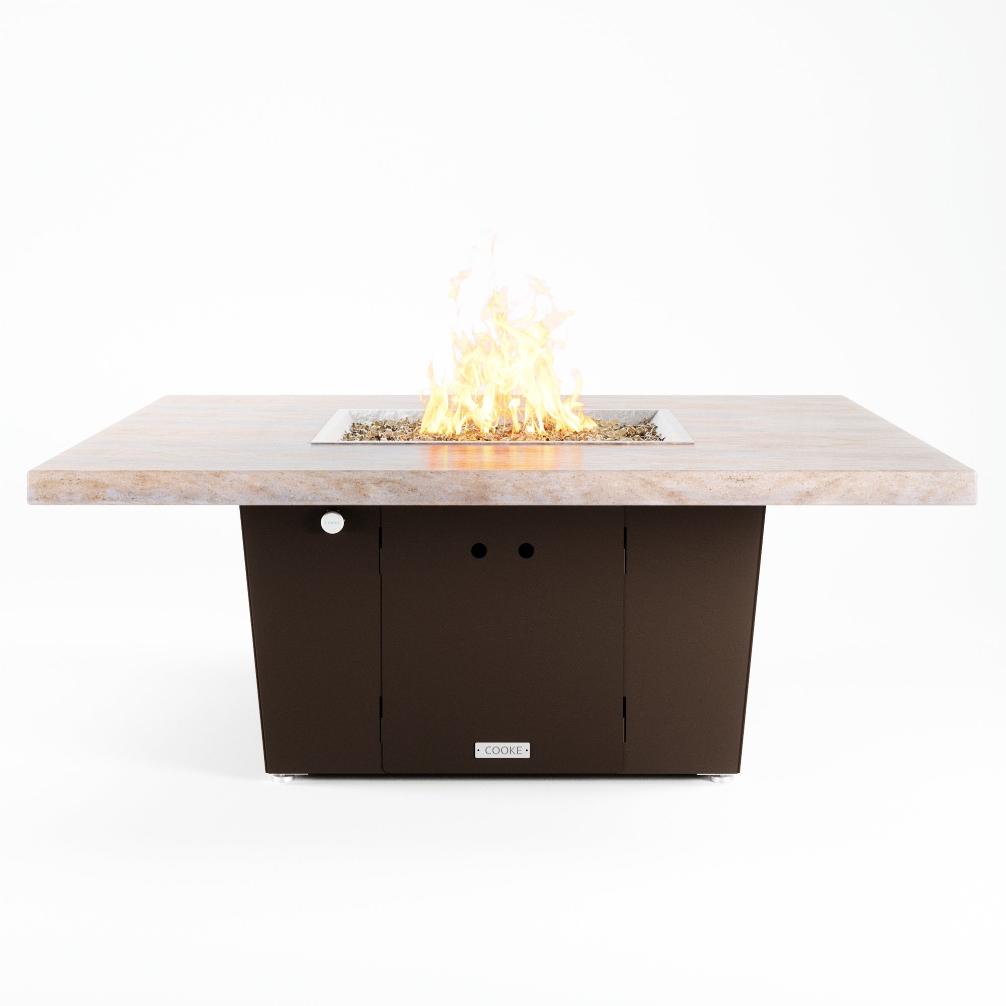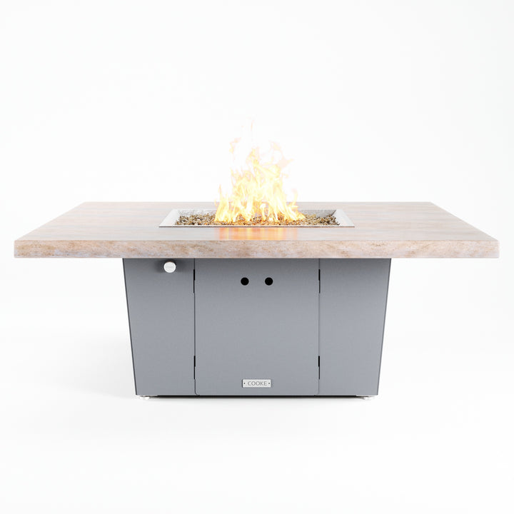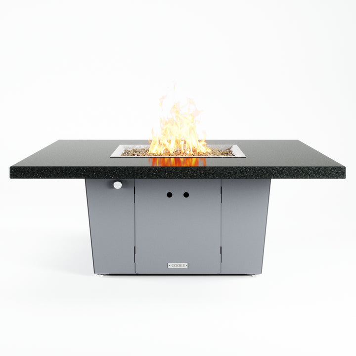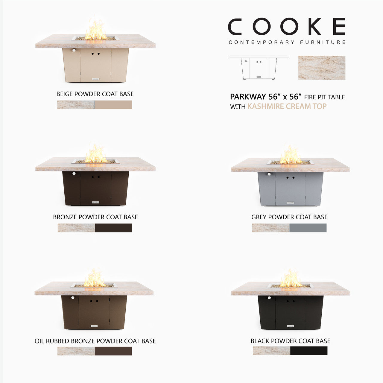 The Parkway fire pit table is COOKE's solution to a great-looking, quality, made-in-USA square fire pit table that is versatile and a great value. This chat height fire pit table features a generous table top with 4" bookmatched edges on a 21" tall slightly tapered base. This table has nice thick top with a modern look. A clean simplicity that will continue to look fresh. This table is big enough for ample seating but is carefully designed to be integrated into landscaped lounge areas, open patio spaces with planters, or near fountains and water features. The COOKE Parkway is hands down the best value for an all aluminum or real stone fire pit table.