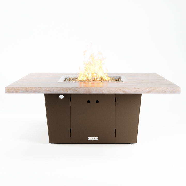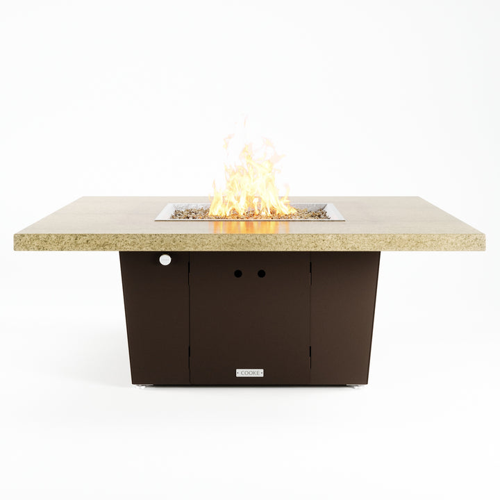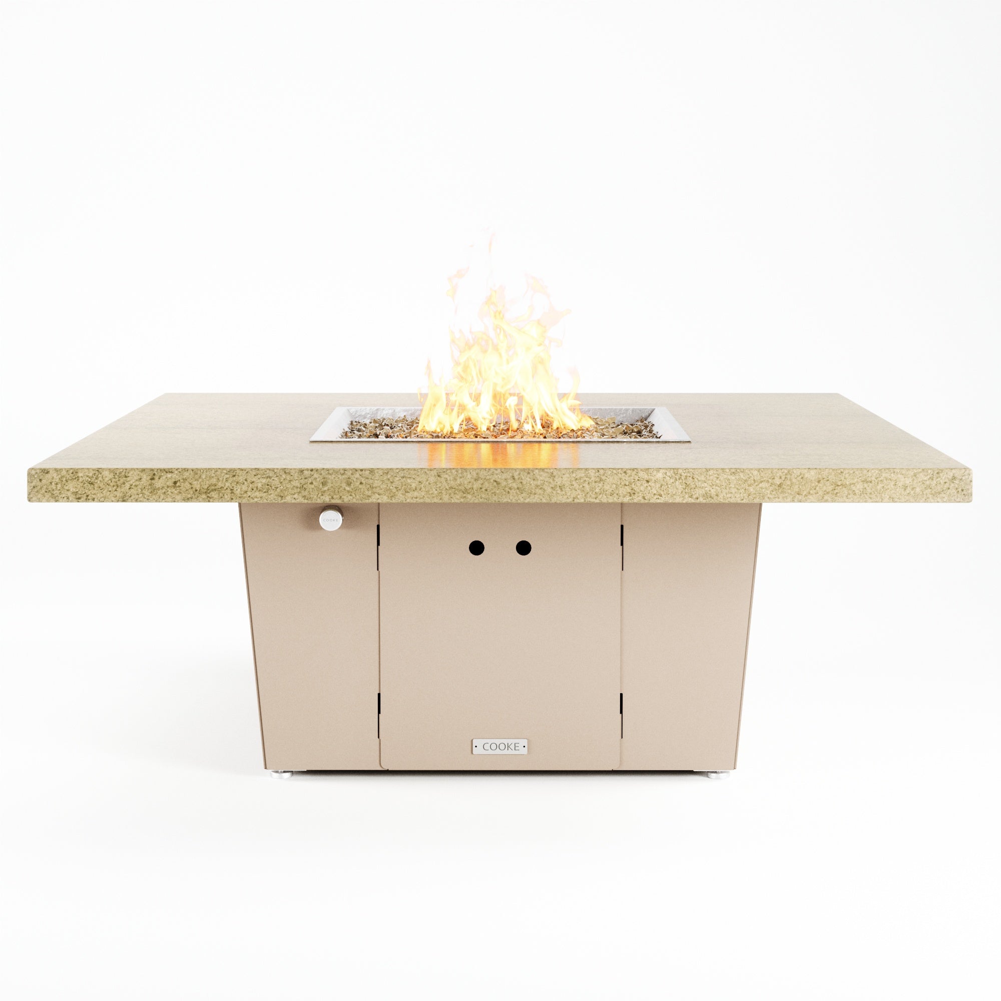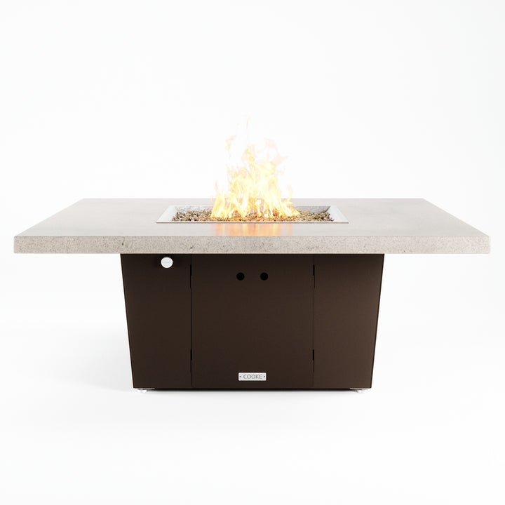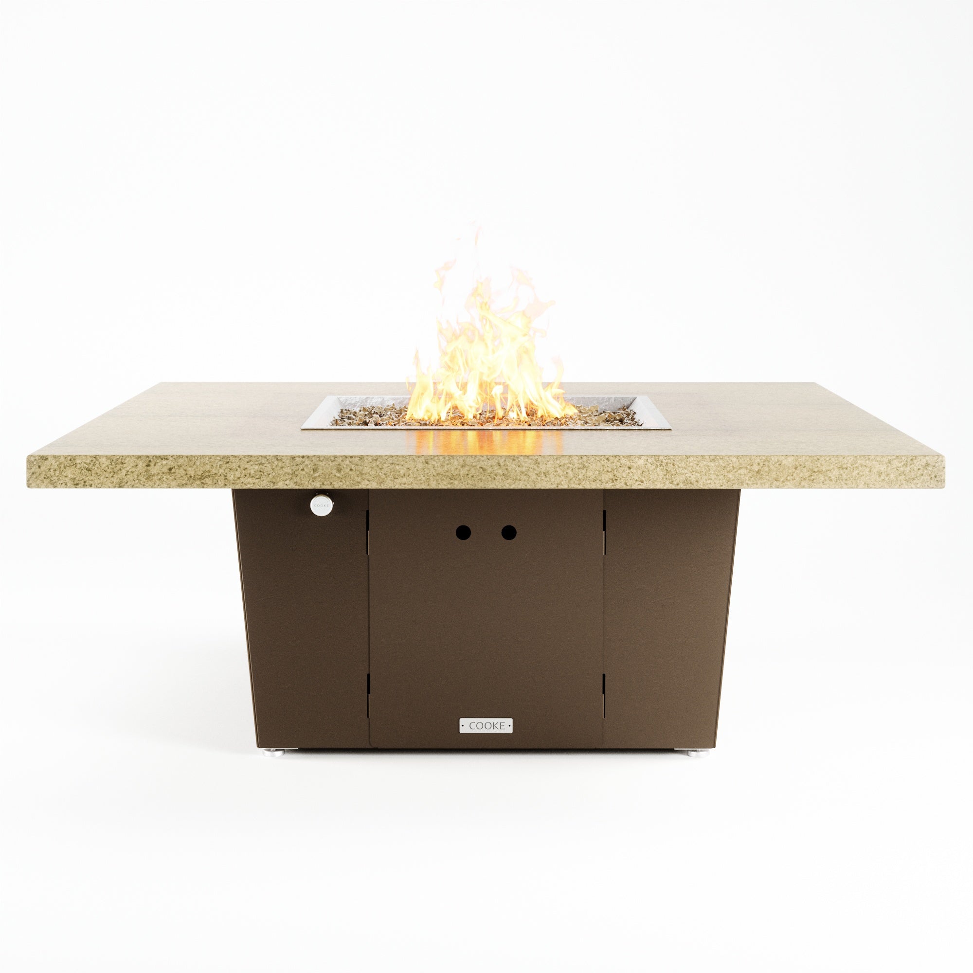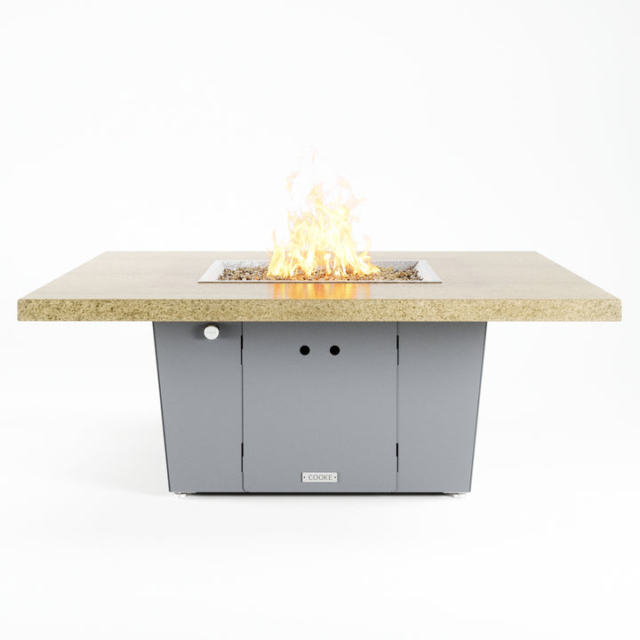 The Parkway fire pit table is COOKE's solution to a great-looking, quality, made-in-USA square fire pit table that is versatile and a great value. This chat height fire pit table features a generous table top with 4" bookmatched edges on a 21" tall slightly tapered base. This table has nice thick top with a modern look. A clean simplicity that will continue to look fresh. This table is big enough for ample seating but is carefully designed to be integrated into landscaped lounge areas, open patio spaces with planters, or near fountains and water features. The COOKE Parkway is hands down the best value for an all aluminum or real stone fire pit table.