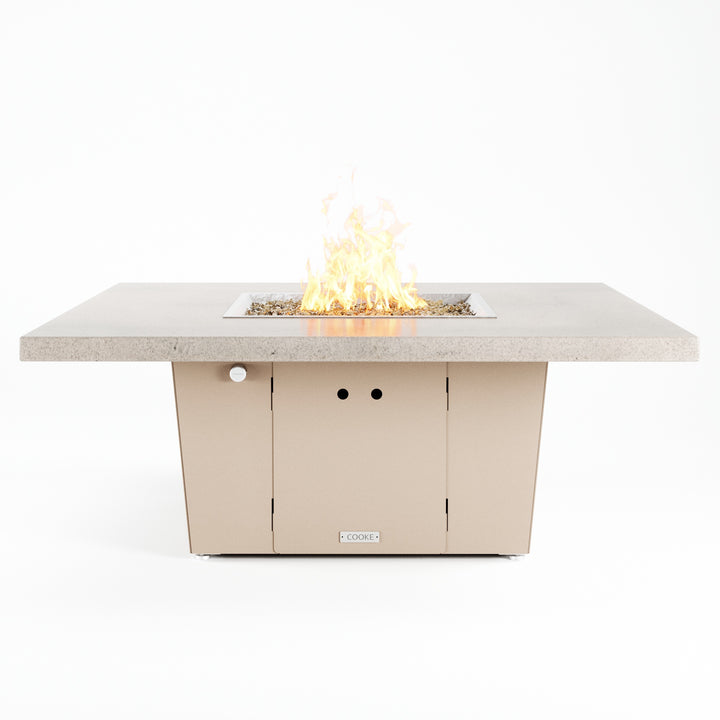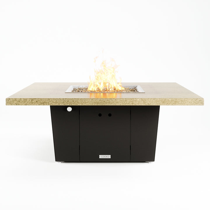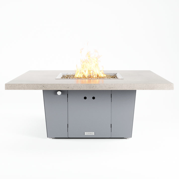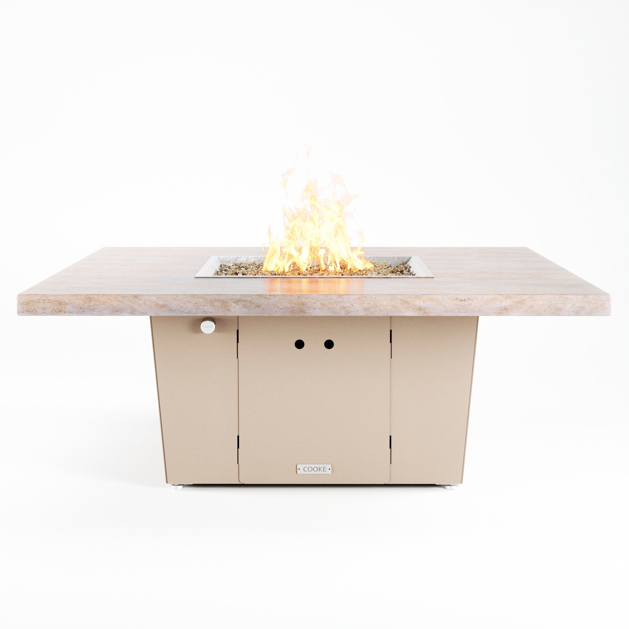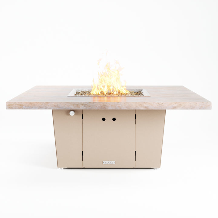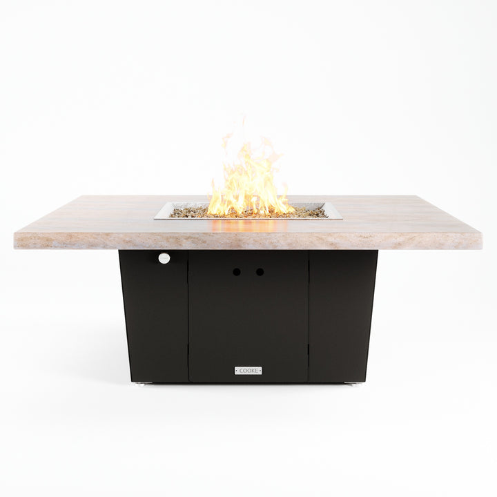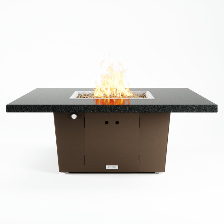 The Parkway fire pit table is COOKE's solution to a great-looking, quality, made-in-USA square fire pit table that is versatile and a great value. This chat height fire pit table features a generous table top with 4" bookmatched edges on a 21" tall slightly tapered base. This table has nice thick top with a modern look. A clean simplicity that will continue to look fresh. This table is big enough for ample seating but is carefully designed to be integrated into landscaped lounge areas, open patio spaces with planters, or near fountains and water features. The COOKE Parkway is hands down the best value for an all aluminum or real stone fire pit table.