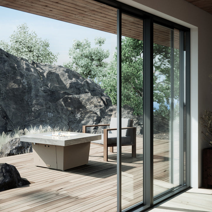 This table has lighter lines, a more traditional look, but a clean simplicity that will continue to look fresh. This table is big enough for ample seating but is carefully designed to be integrated into landscaped lounge areas, open patio spaces with planters, or near fountains and water features. The COOKE Parkway is hands down the best value for an all aluminum or real stone fire pit table.
