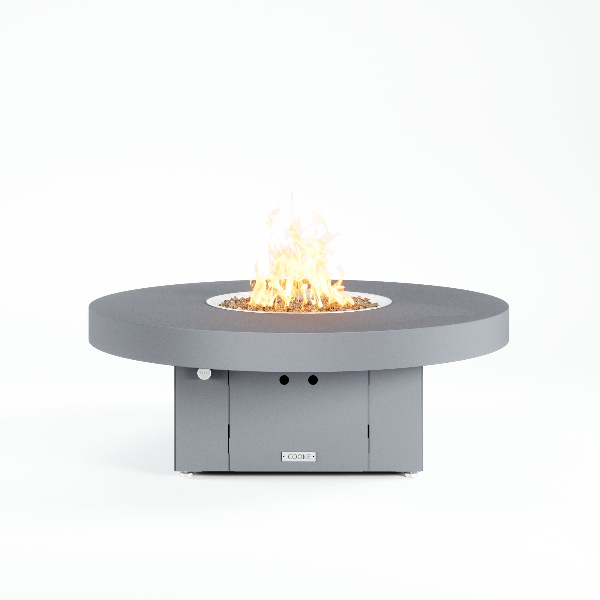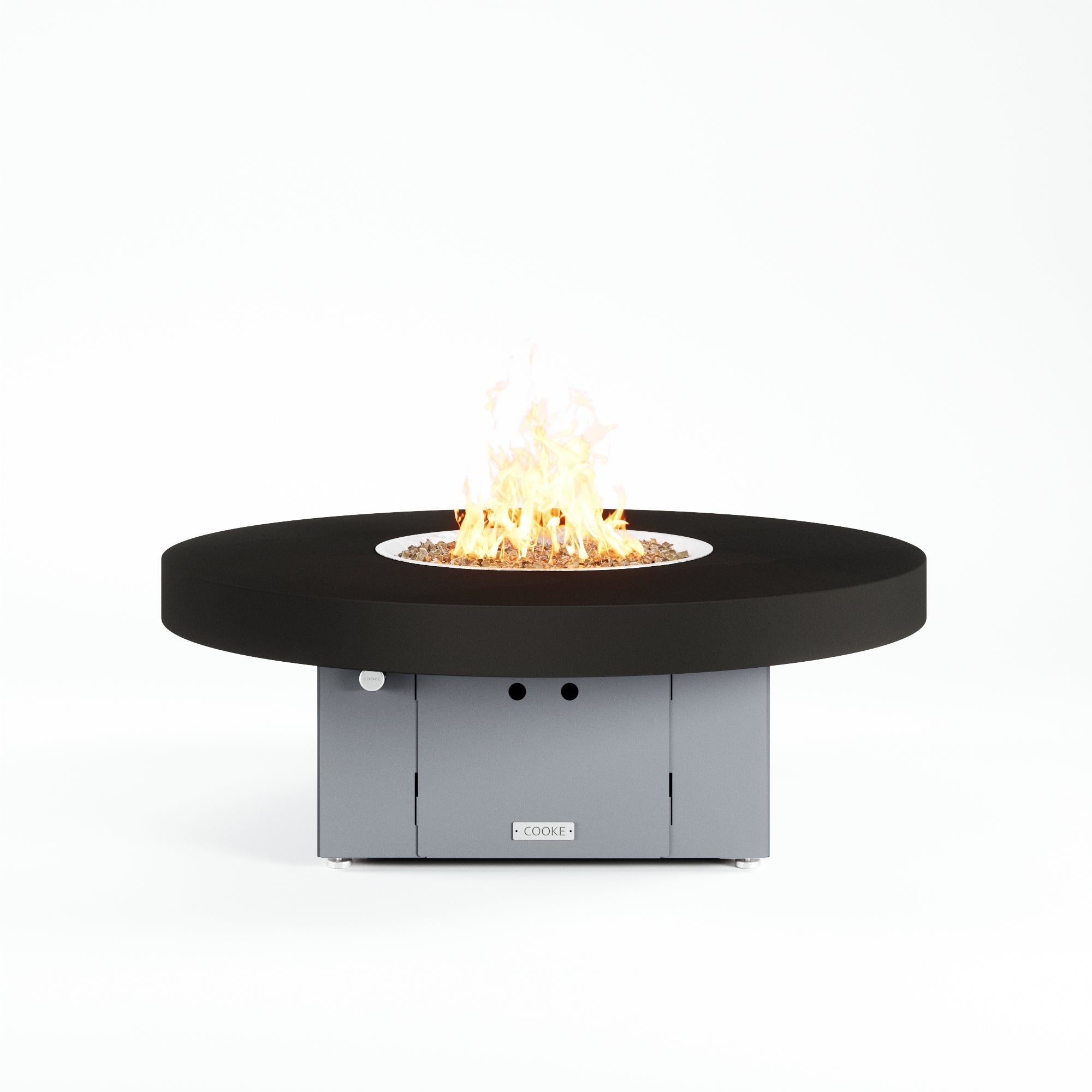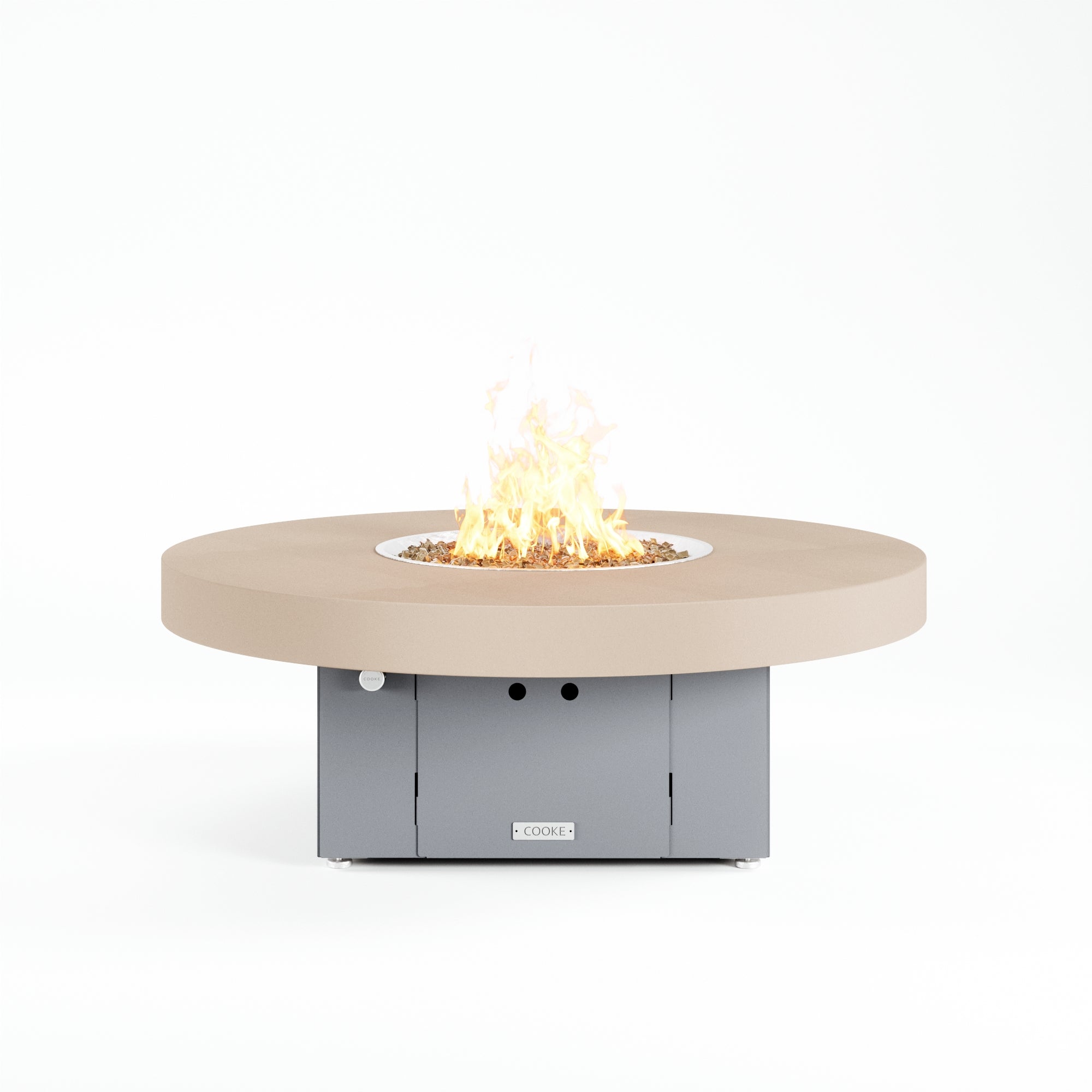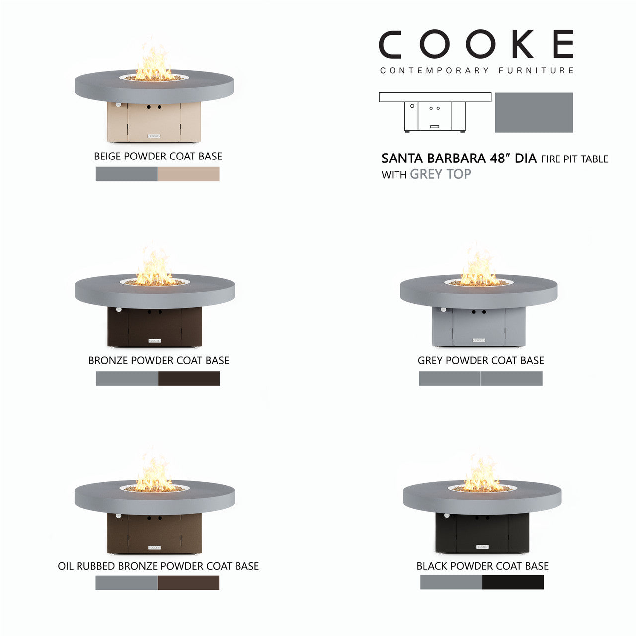 The 48" round Santa Barbara fire pit table is the perfect medium size and accommodates seating up to 4. Our customers love this table's stain resistant aluminum table top which has plenty of room for small plates and drinks. COOKE produces some of the finest fire pit tables in the industry which can be seen in the level of detail brought to the table top surface. Finally, a fire pit table with a premium table top! Cover up the fire pit with the stainless steel burner lid and this table doubles as a premium outdoor stone table.