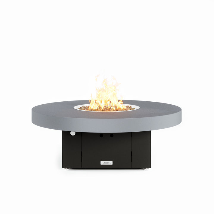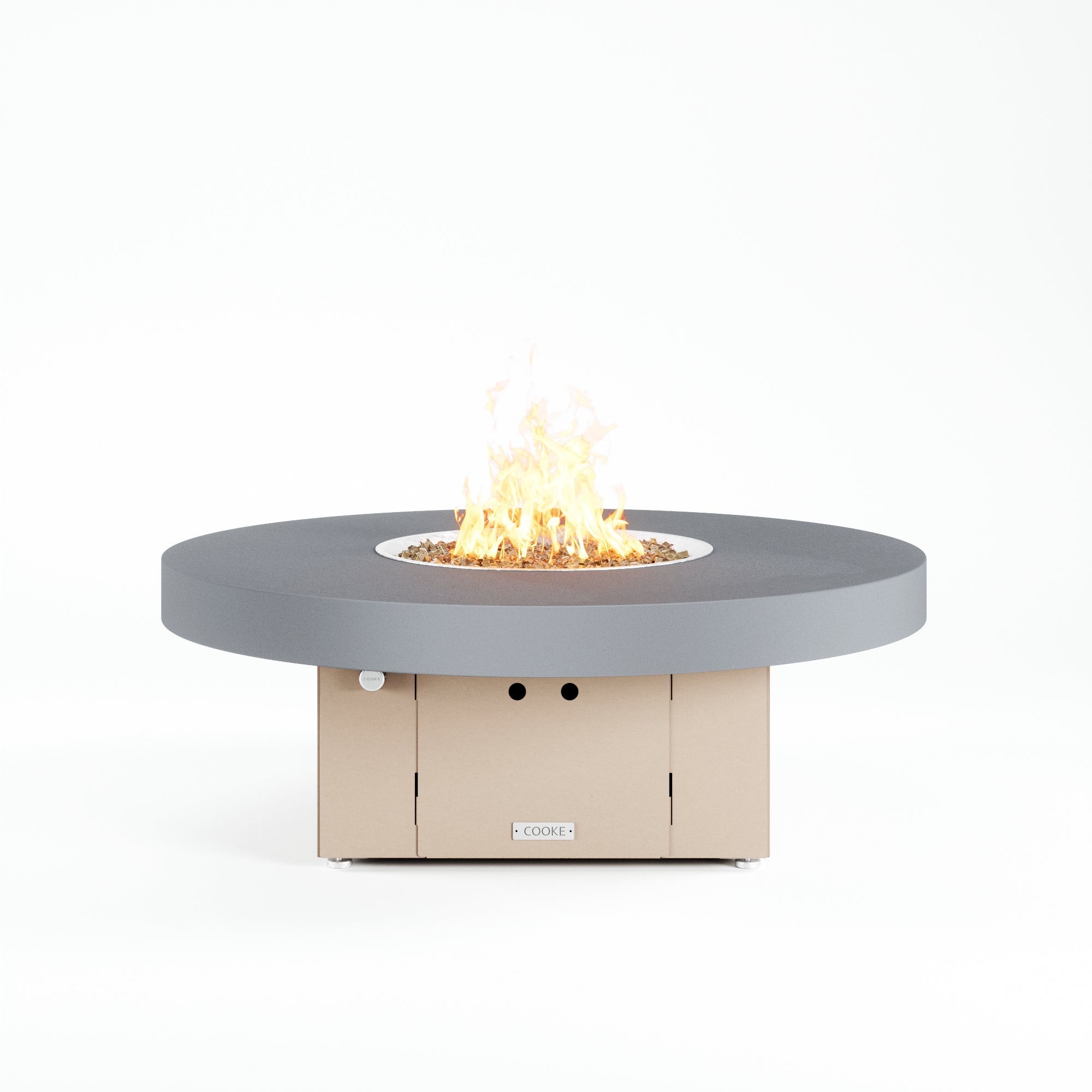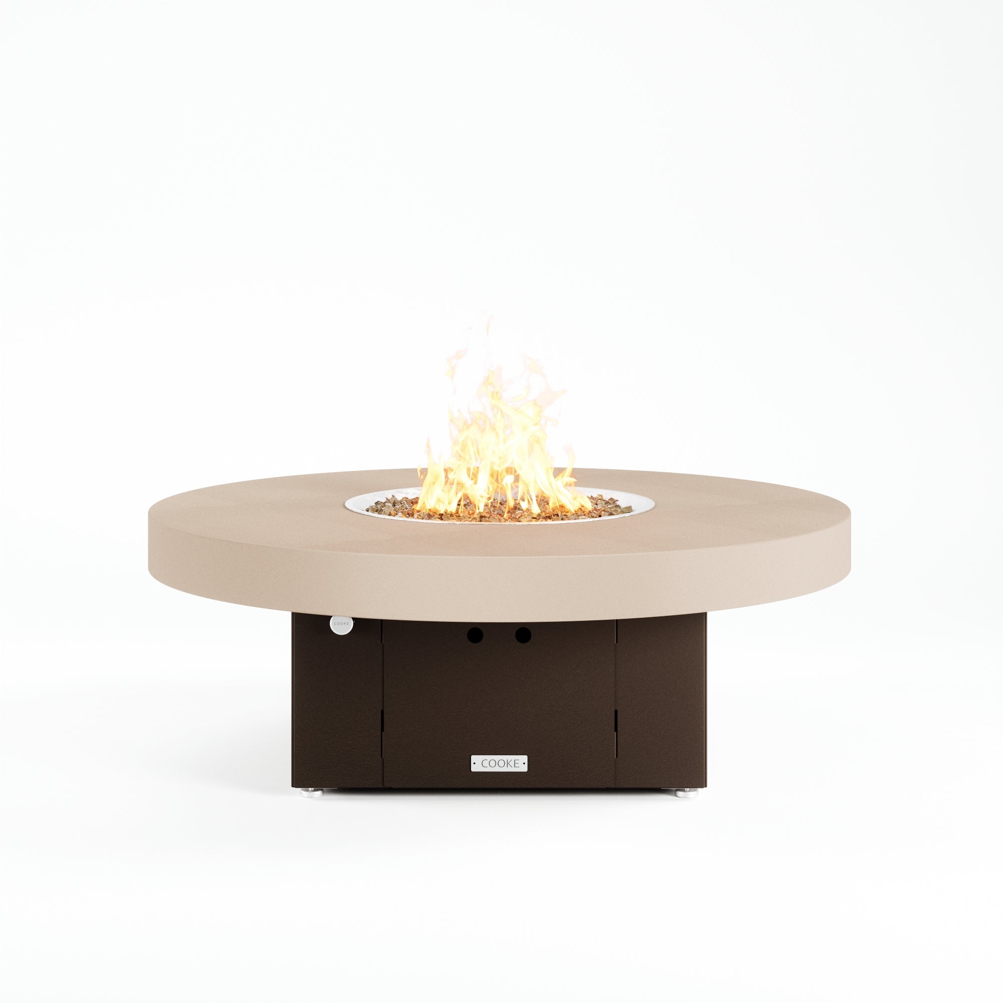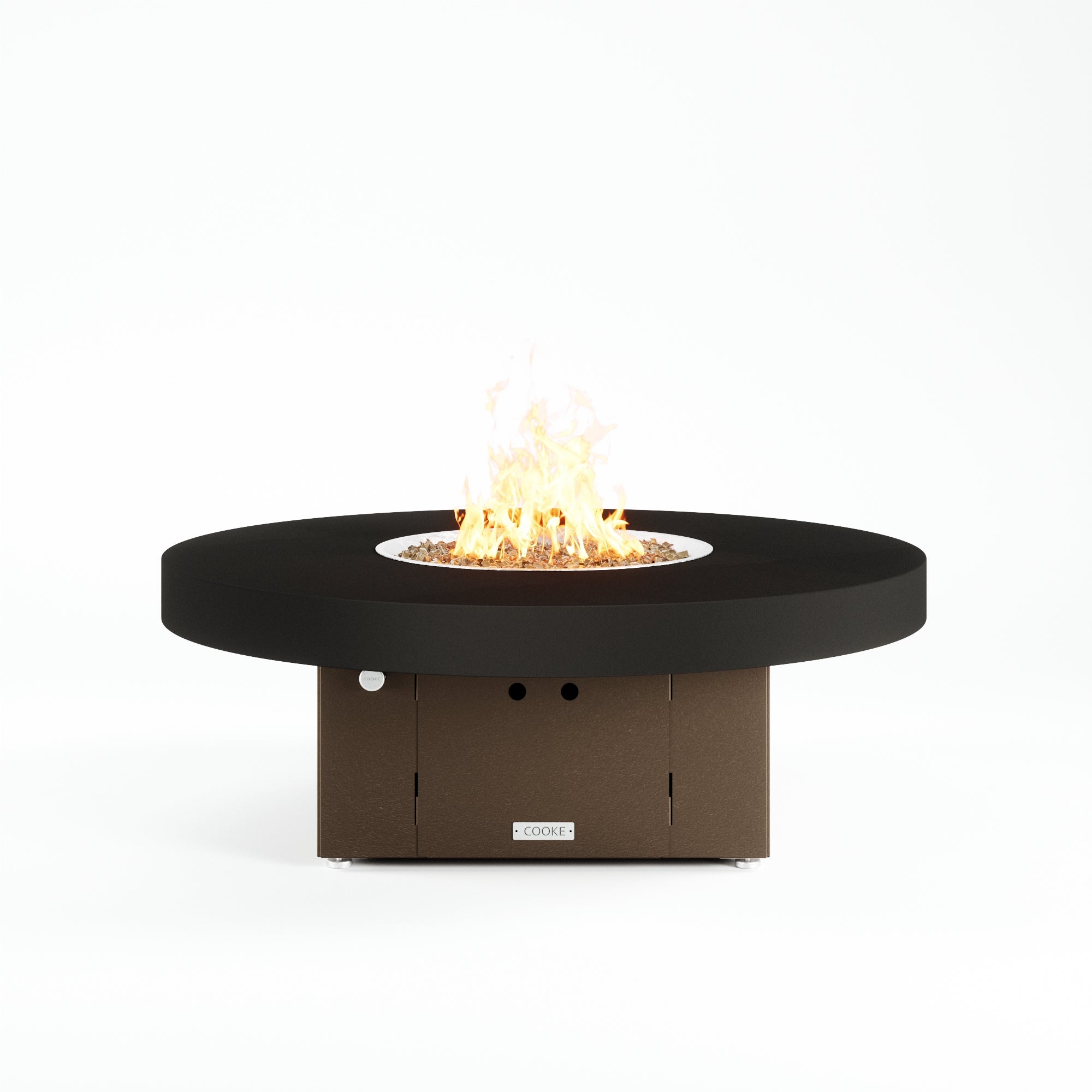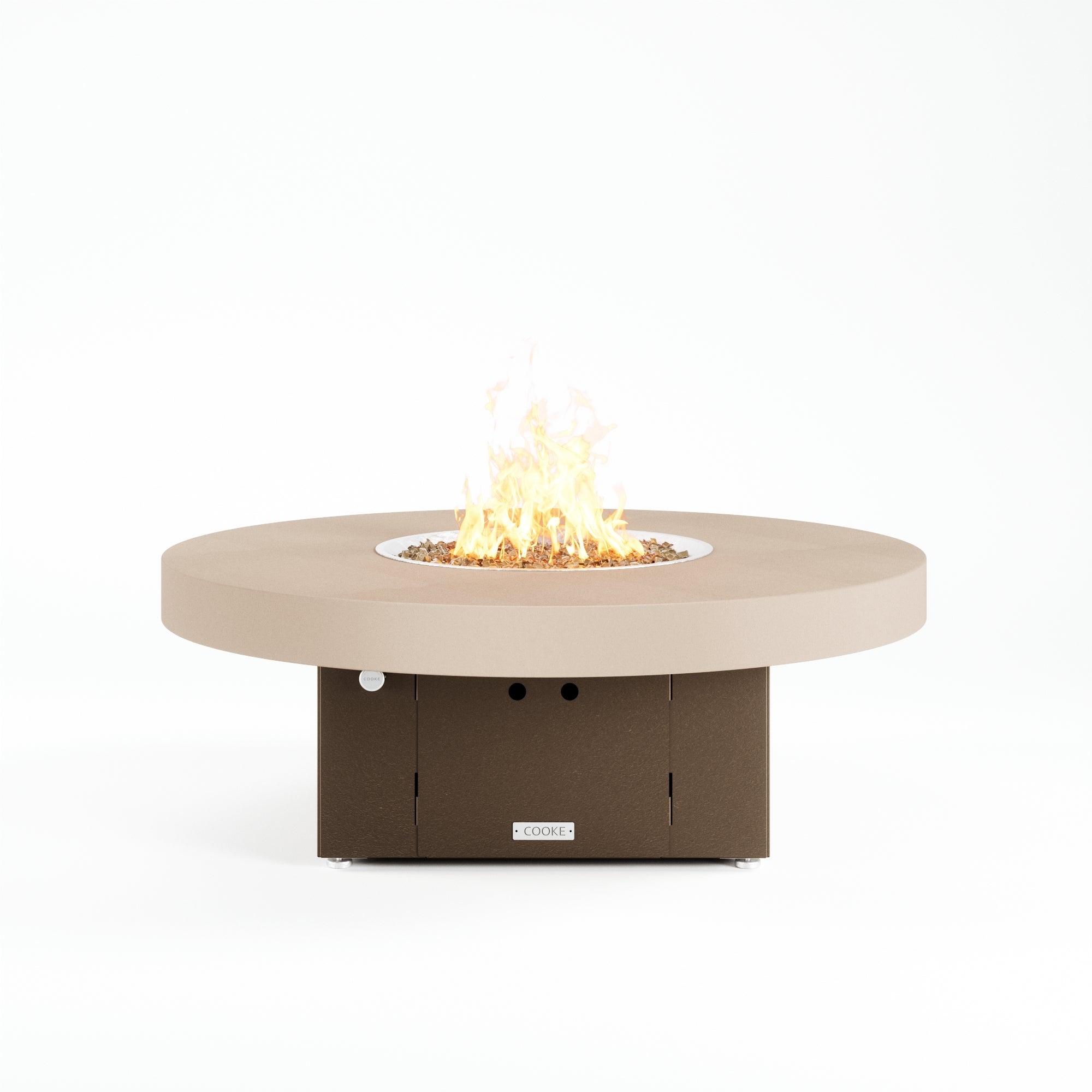 The 48" round Santa Barbara fire pit table is the perfect medium size and accommodates seating up to 4. Our customers love this table's stain resistant aluminum table top which has plenty of room for small plates and drinks. COOKE produces some of the finest fire pit tables in the industry which can be seen in the level of detail brought to the table top surface. Finally, a fire pit table with a premium table top! Cover up the fire pit with the stainless steel burner lid and this table doubles as a premium outdoor stone table.