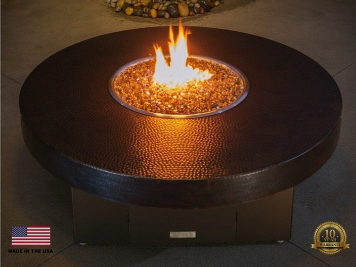 This fire pit table is Cooke’s tribute to Hammered Copper. This 55" diameter XL hammered copper table top is a work of hammered copper art. This tabletop uses real copper and in a large size, this table is stunning. Perfect for seating 6 in your own courtyard, backyard, or garden sanctuary.