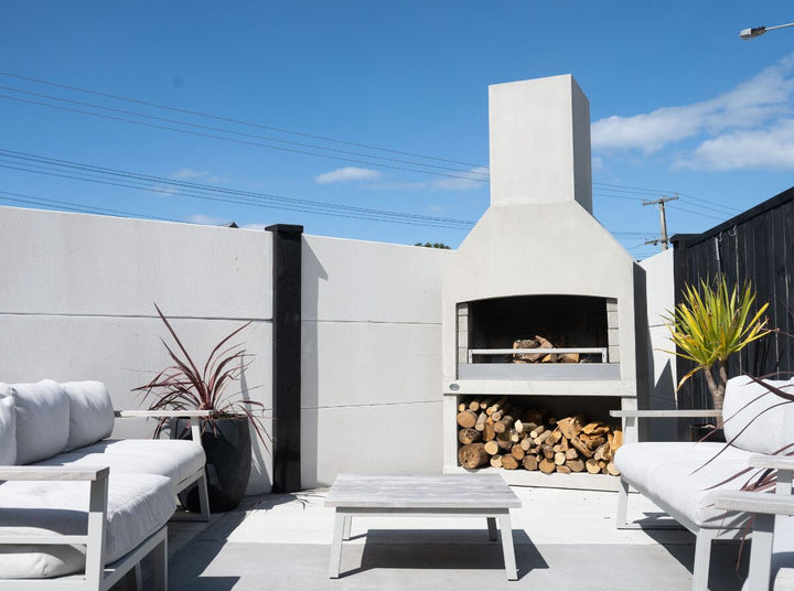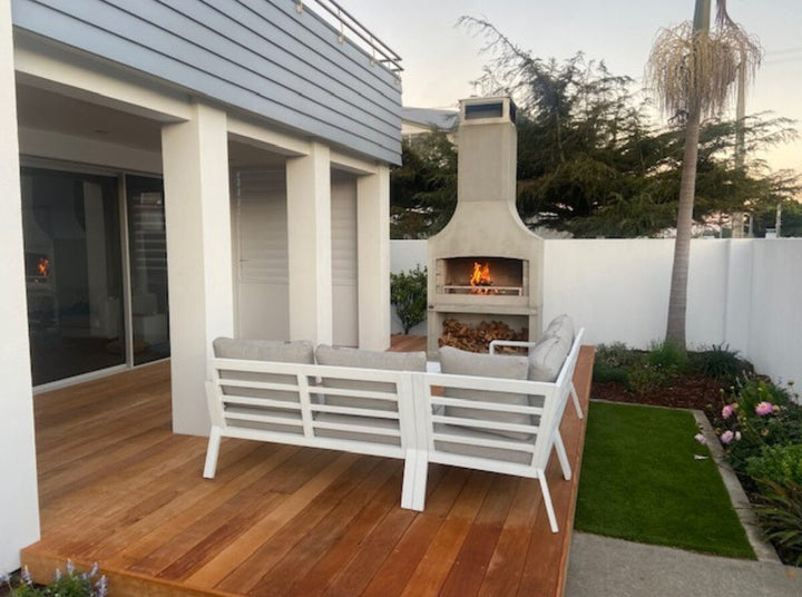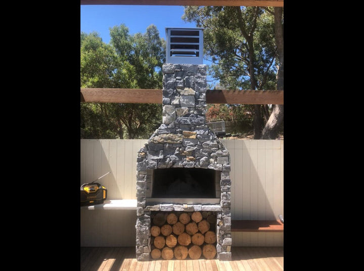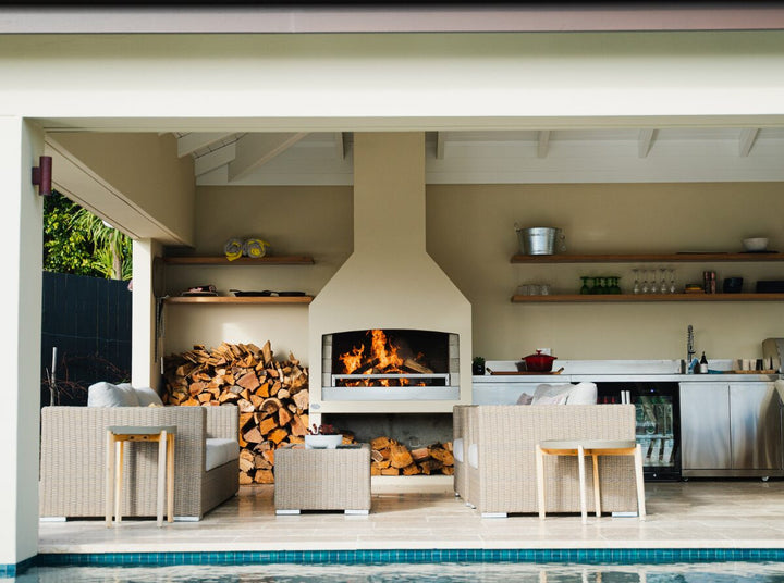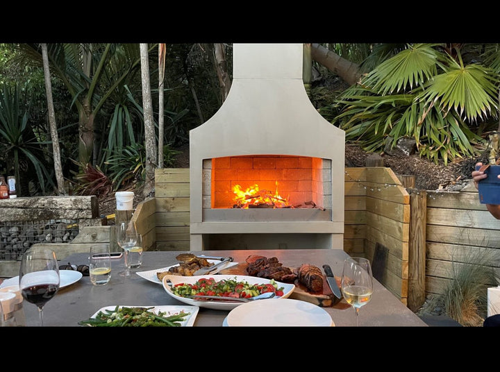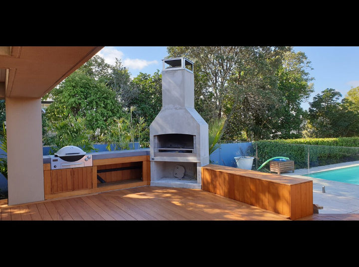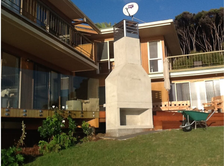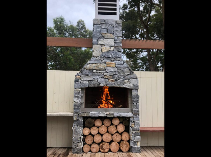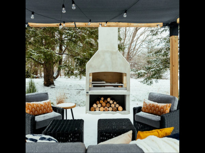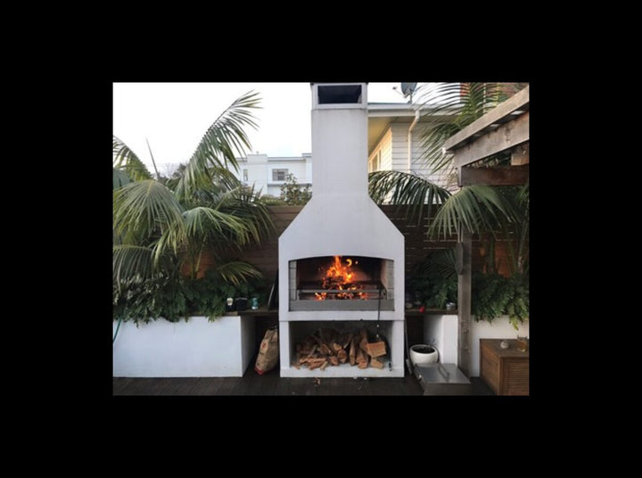 Flare’s Signature Series of Outdoor Fireplaces have been warming homes for over 20 years. They are designed around the principle of a wide mouth to allow for a big fire and simultaneous cooking over embers. Their masonry structure provides a heat-sink, whereby the entire fireplace radiates warmth and provides a secure structure that stands the test of time. In addition, Flare Fires are modifiable: Choose a chimney shape you like and the configuration of wood-storage that suits your space.
