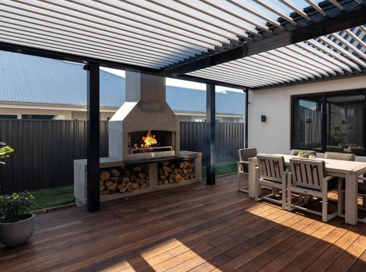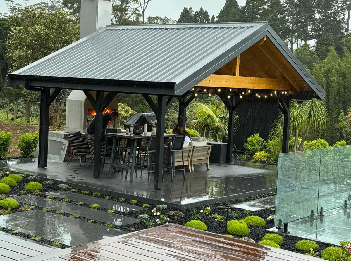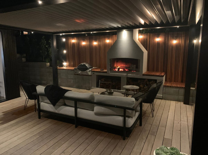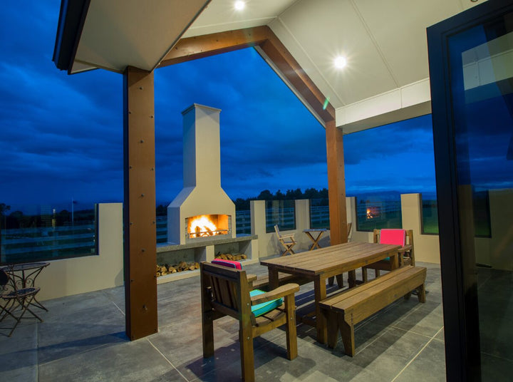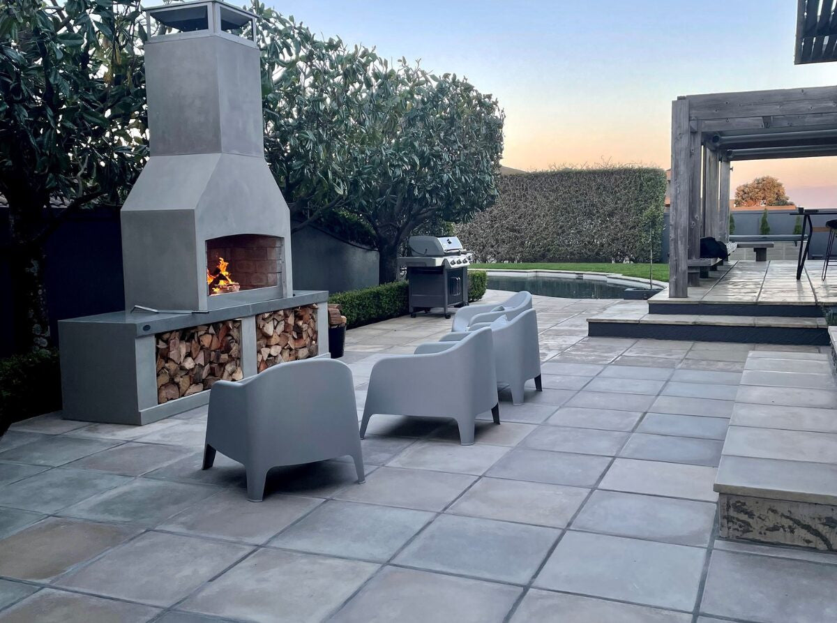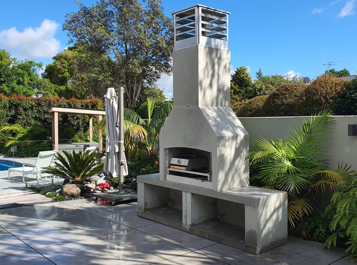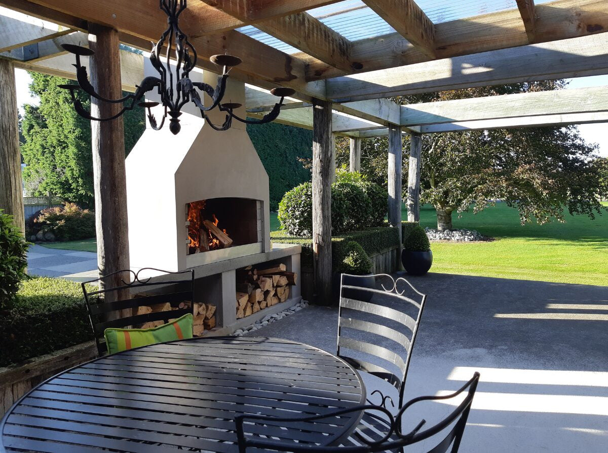 Flare’s Signature Series of Outdoor Fireplaces have been warming homes for over 20 years. They are designed around the principle of a wide mouth to allow for a big fire and simultaneous cooking over embers. Their masonry structure provides a heat-sink, whereby the entire fireplace radiates warmth and provides a secure structure that stands the test of time. In addition, Flare Fires are modifiable: Choose a chimney shape you like and the configuration of wood-storage that suits your space.