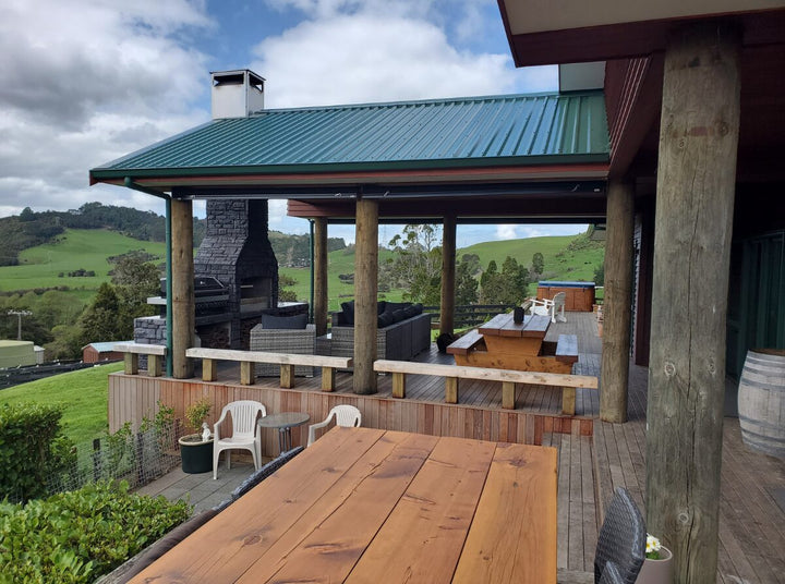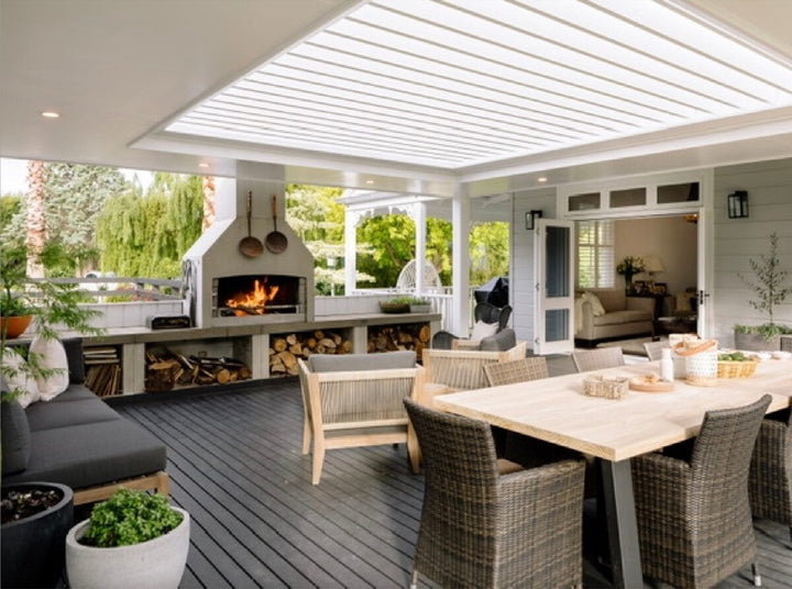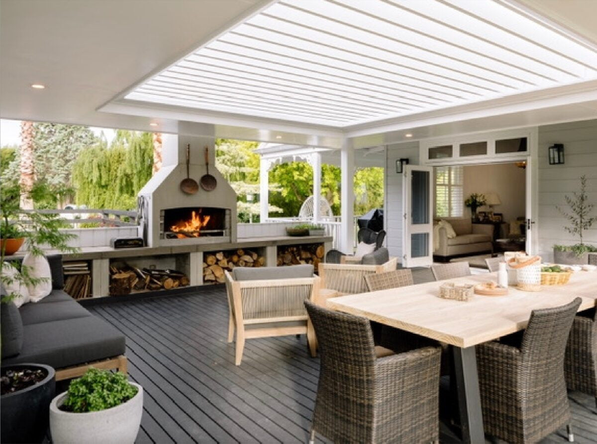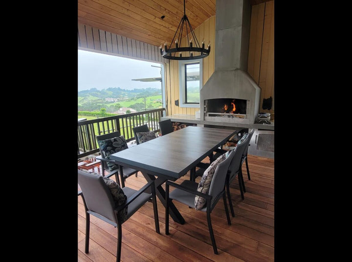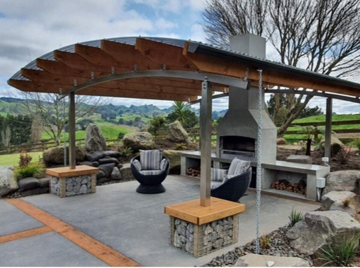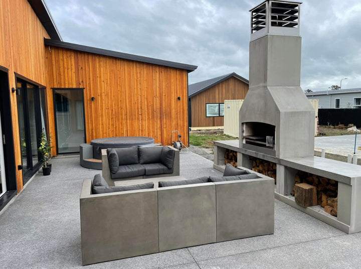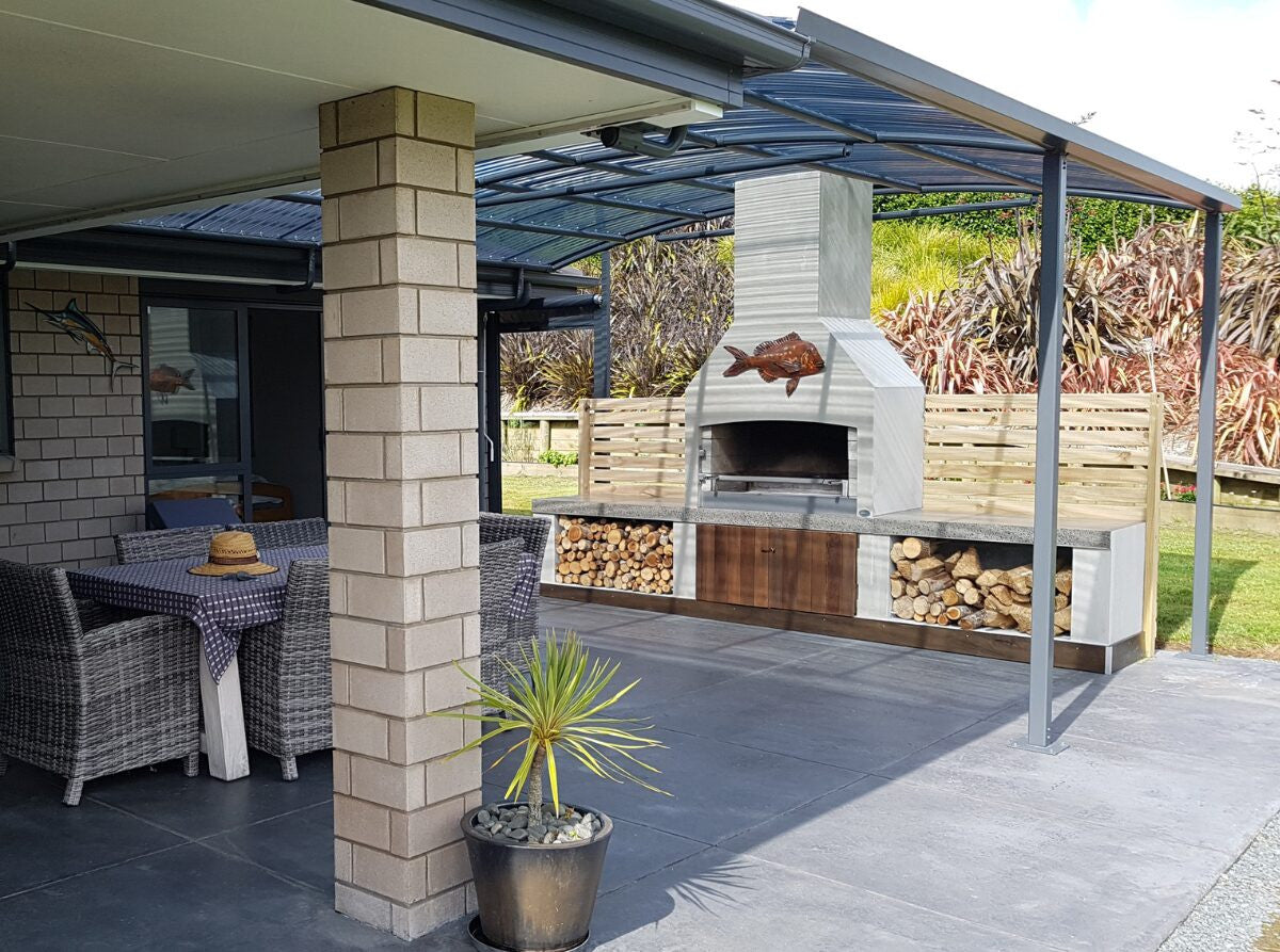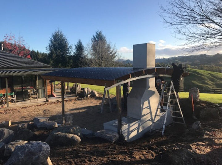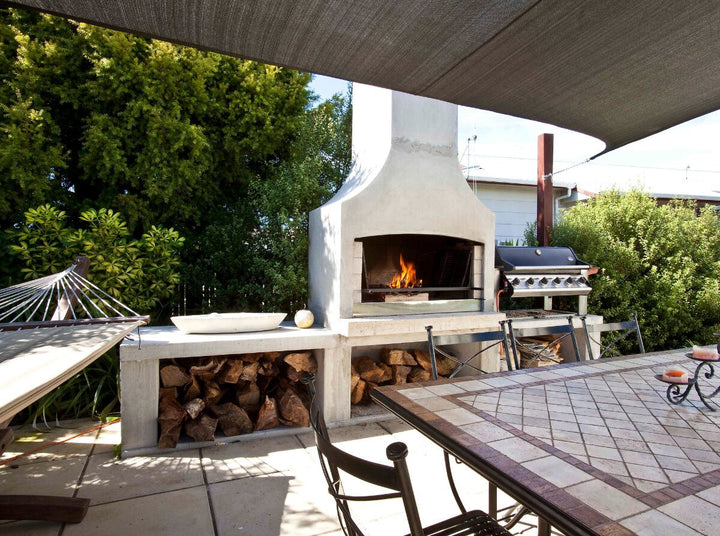 Flare’s Signature Series of Outdoor Fireplaces have been warming homes for over 20 years. They are designed around the principle of a wide mouth to allow for a big fire and simultaneous cooking over embers. Their masonry structure provides a heat-sink, whereby the entire fireplace radiates warmth and provides a secure structure that stands the test of time. In addition, Flare Fires are modifiable: Choose a chimney shape you like and the configuration of wood-storage that suits your space.