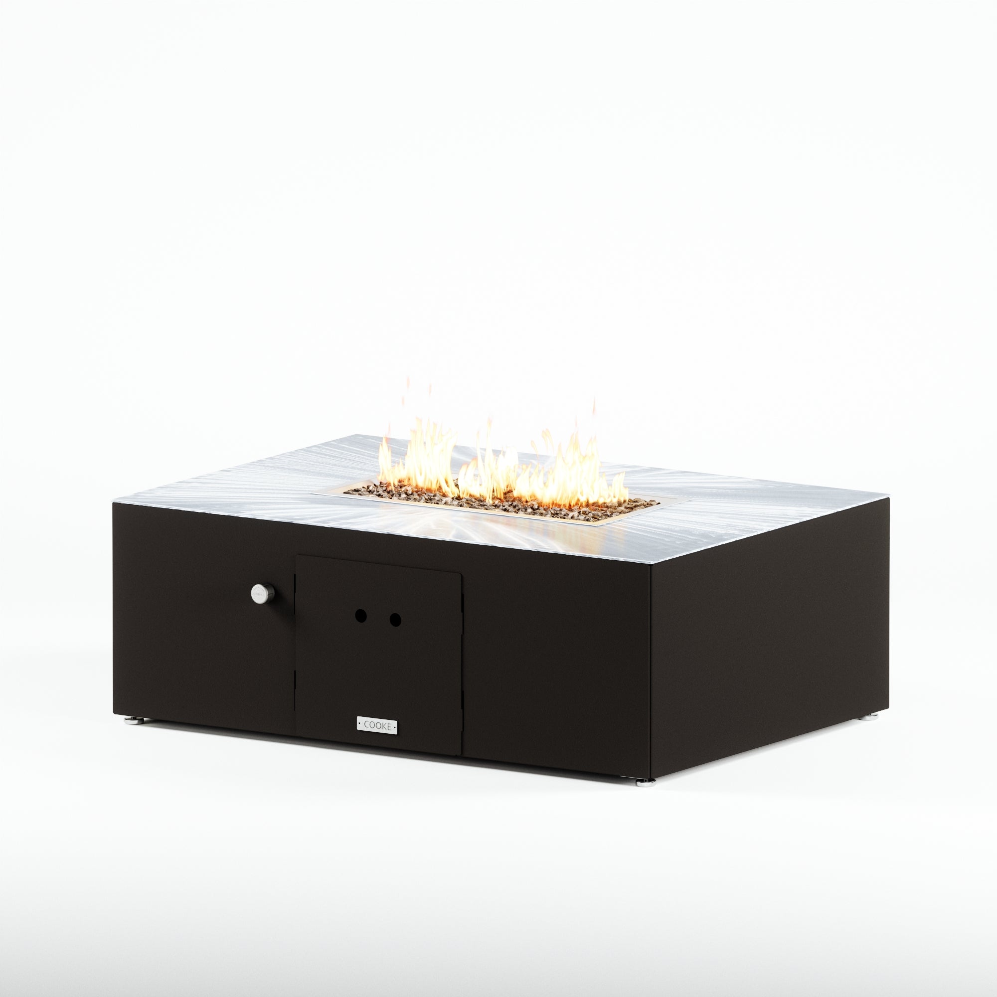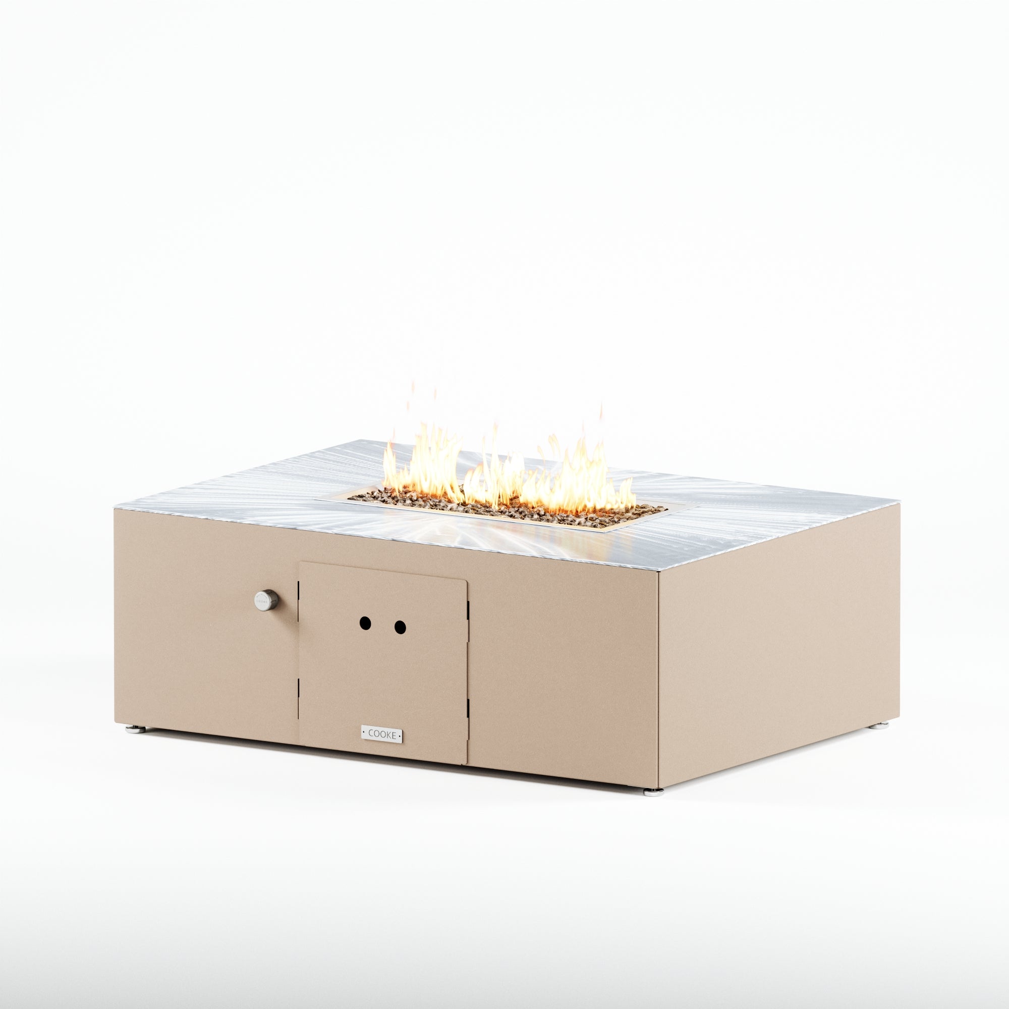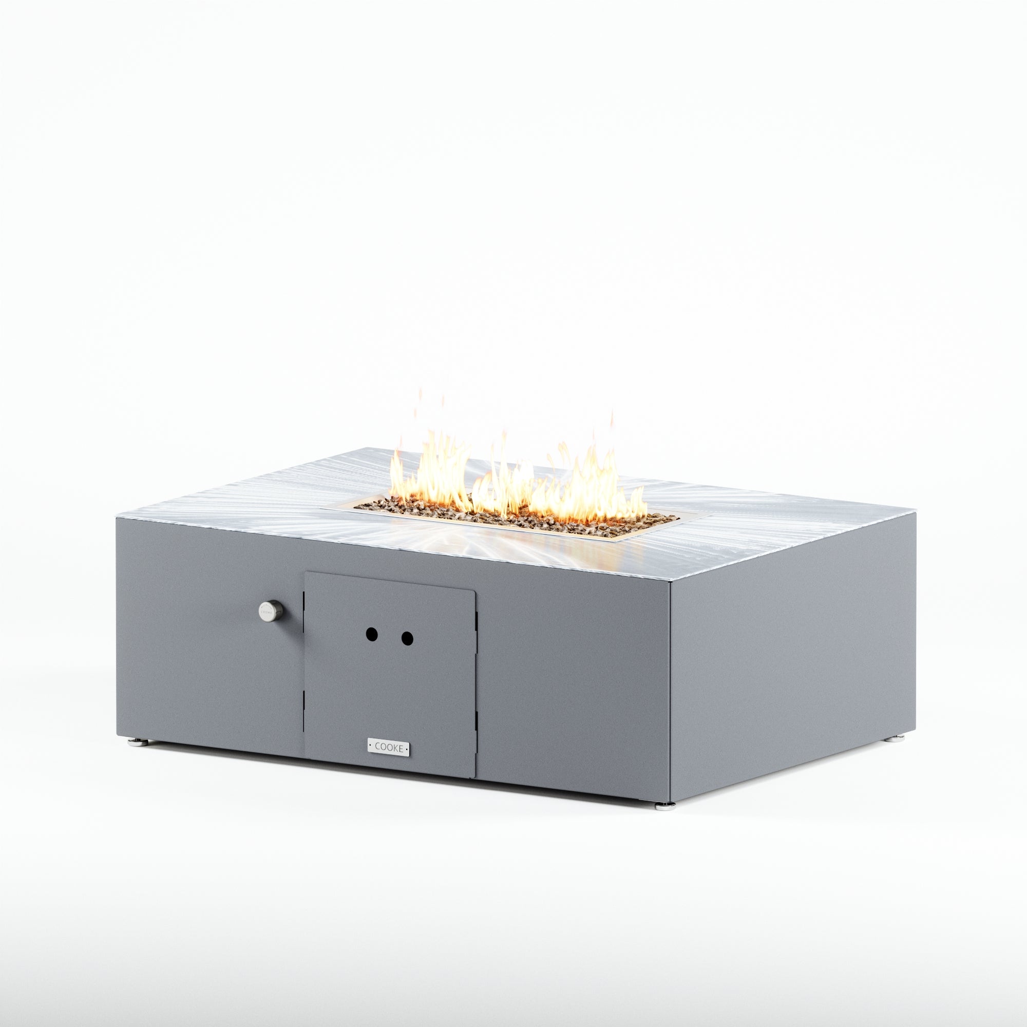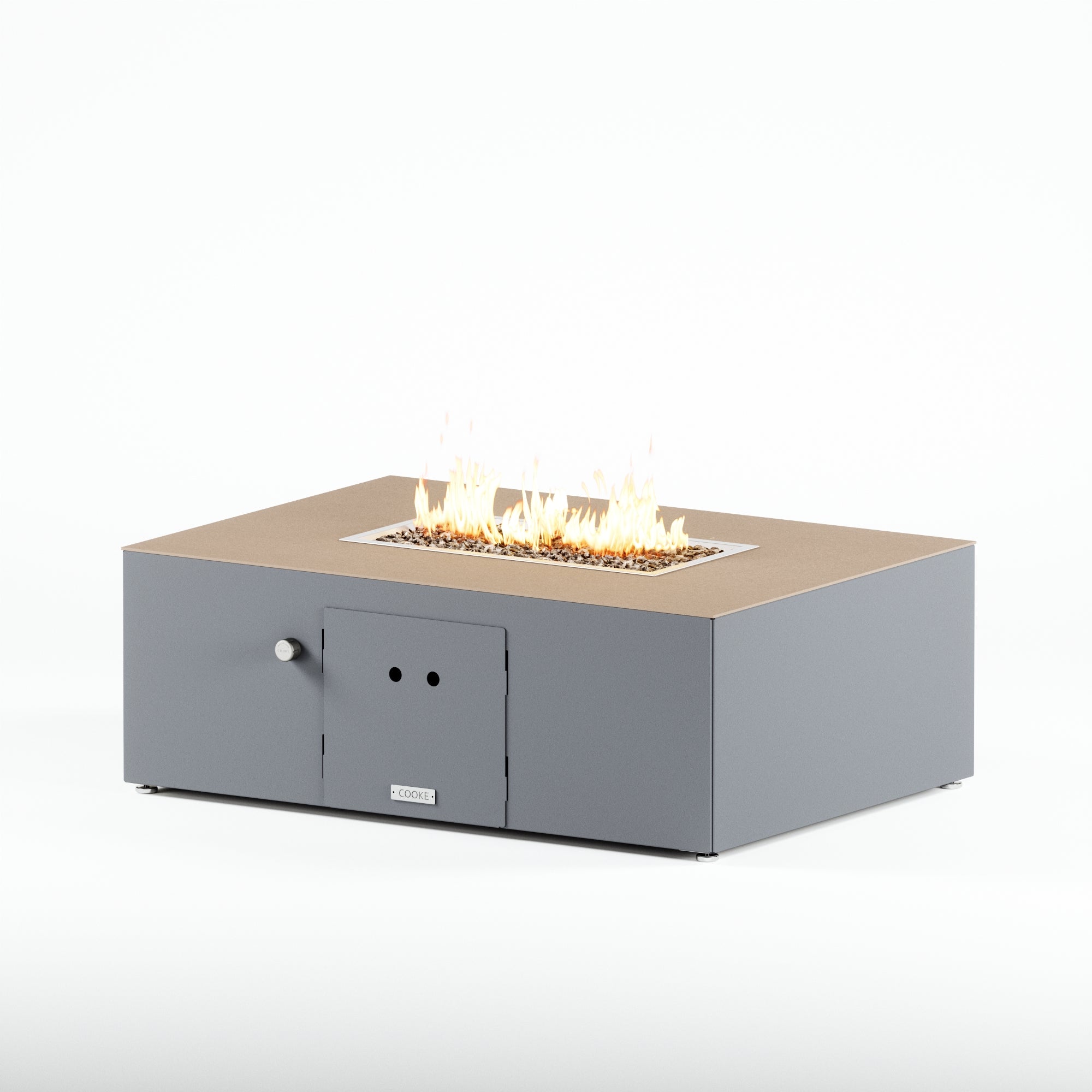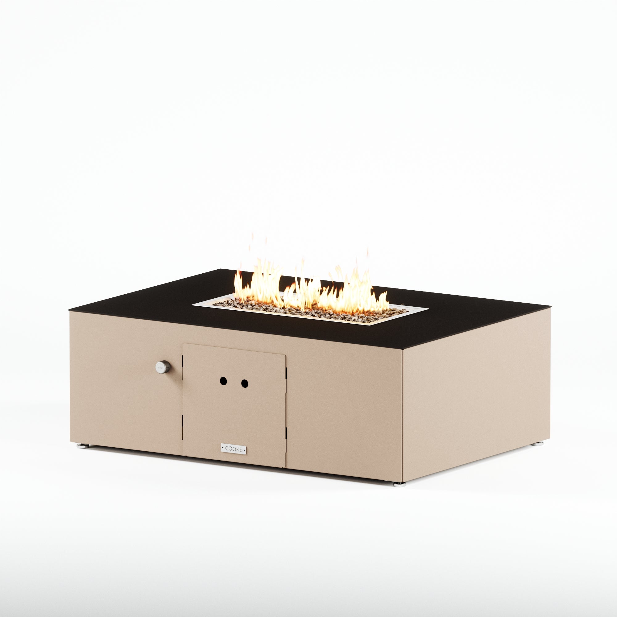 This lounge height Fire Pit table is made in the USA with an aluminum base and aluminum plate top. The base features a door for hiding a full size BBQ propane tank under the table. Custom colors are available for a $500 fee, so if you need it fire engine red or any other color of the rainbow we can do it! Shipping takes 4-6 weeks.