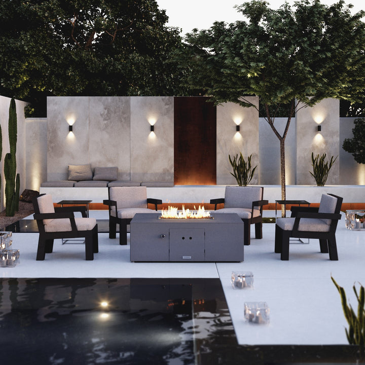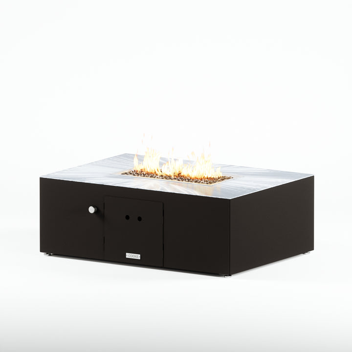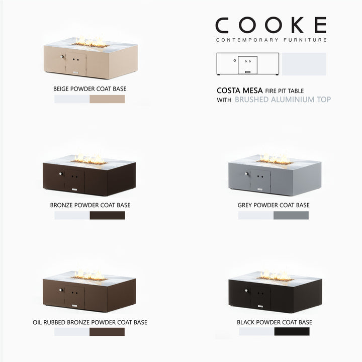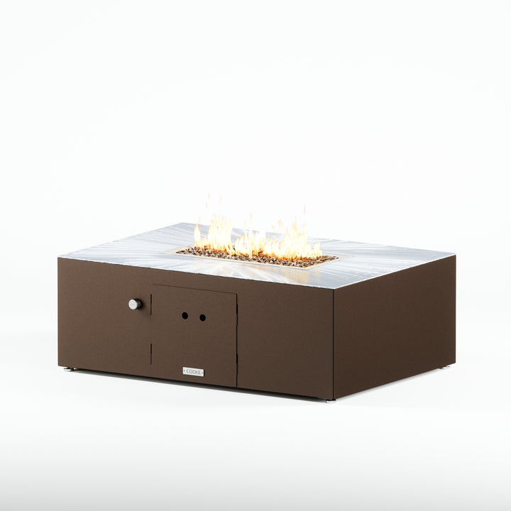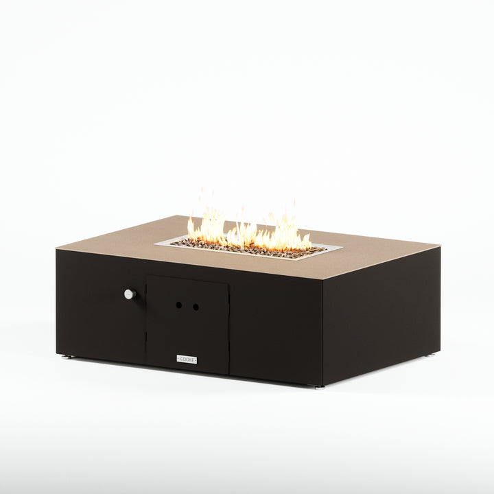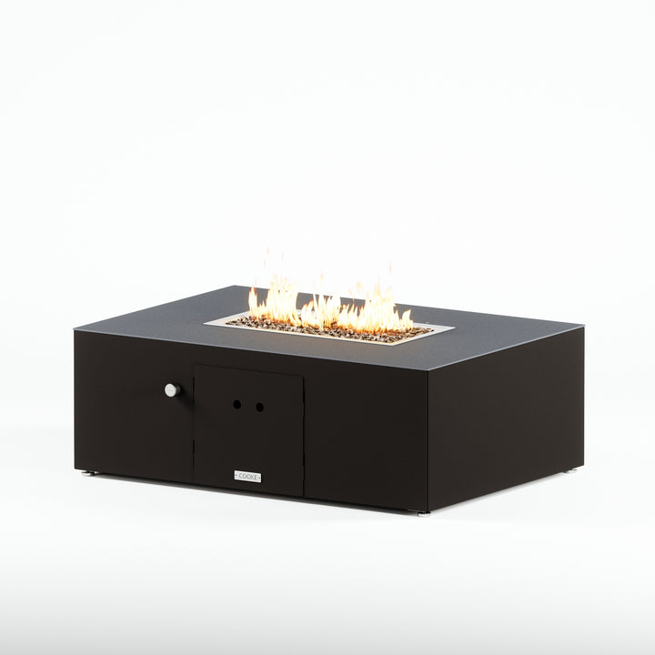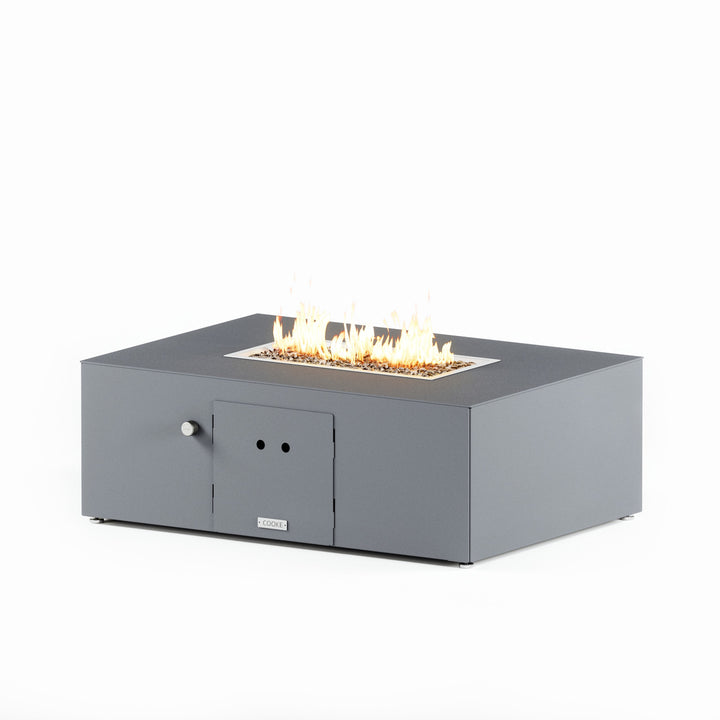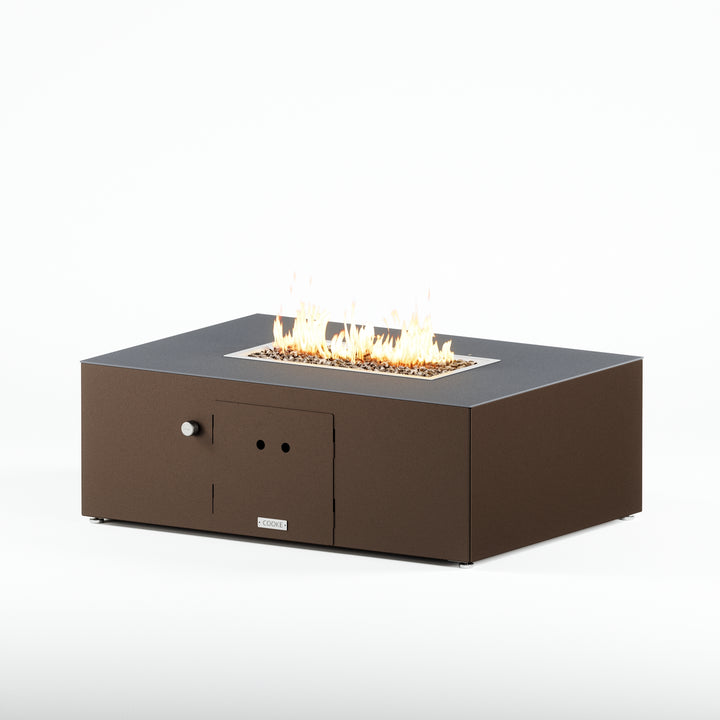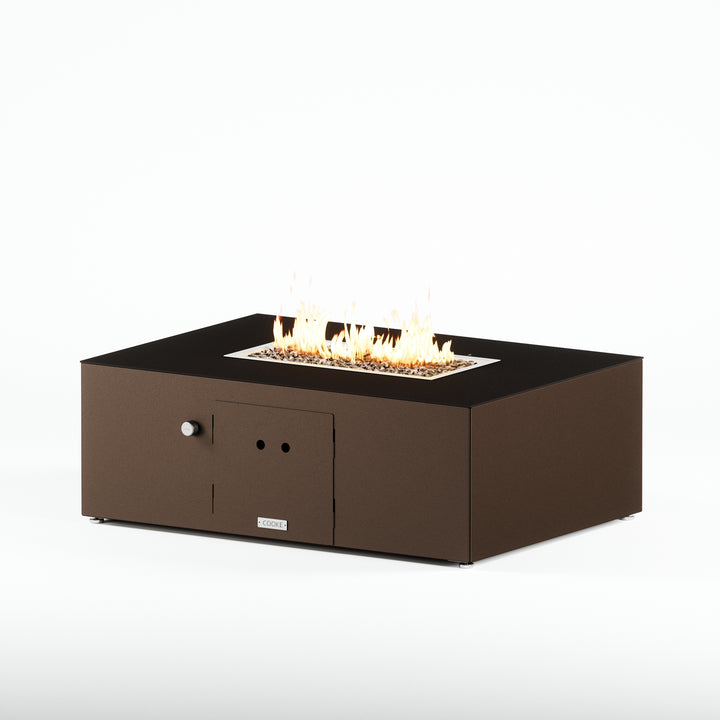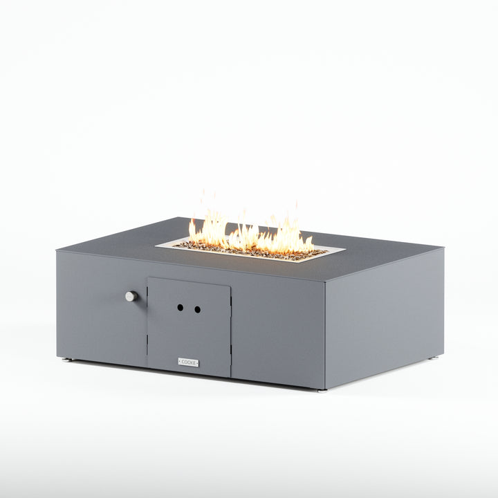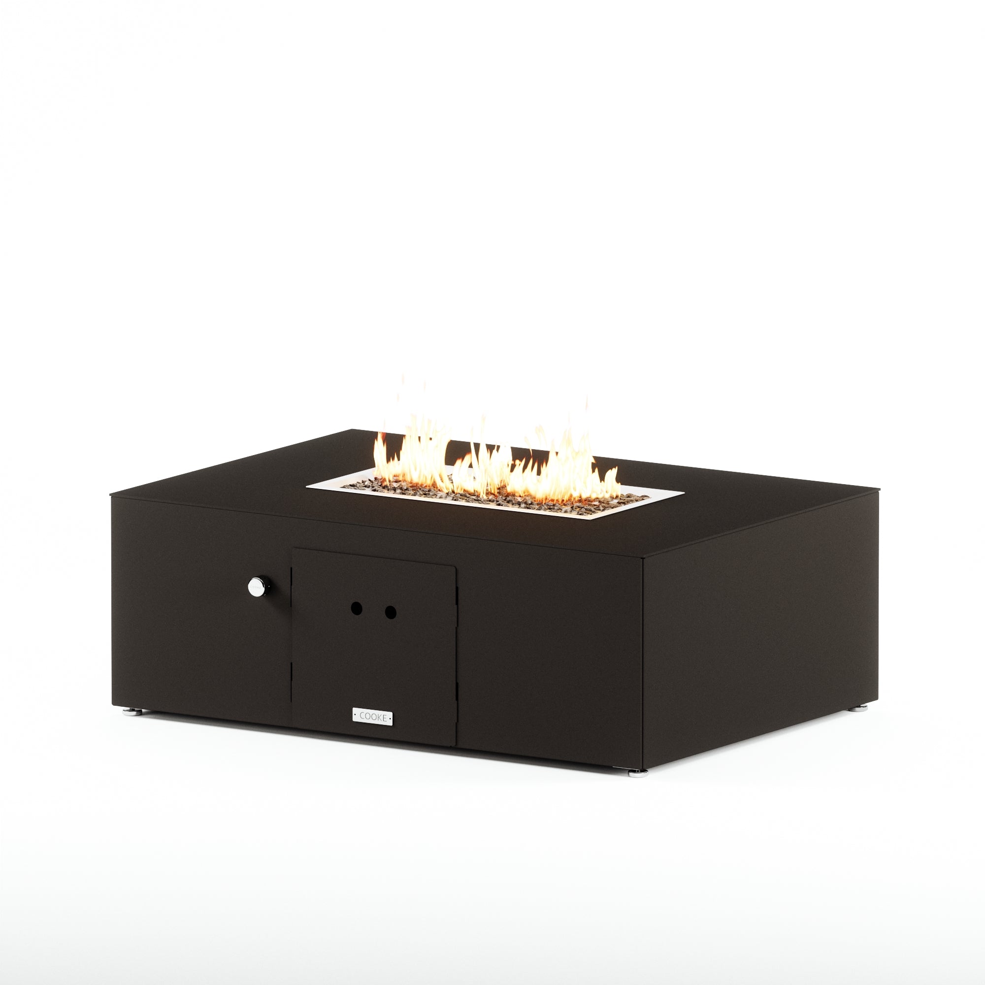 This lounge height Fire Pit table is made in the USA with an aluminum base and aluminum plate top. The base features a door for hiding a full size BBQ propane tank under the table. Custom colors are available for a $500 fee, so if you need it fire engine red or any other color of the rainbow we can do it! Shipping takes 4-6 weeks.