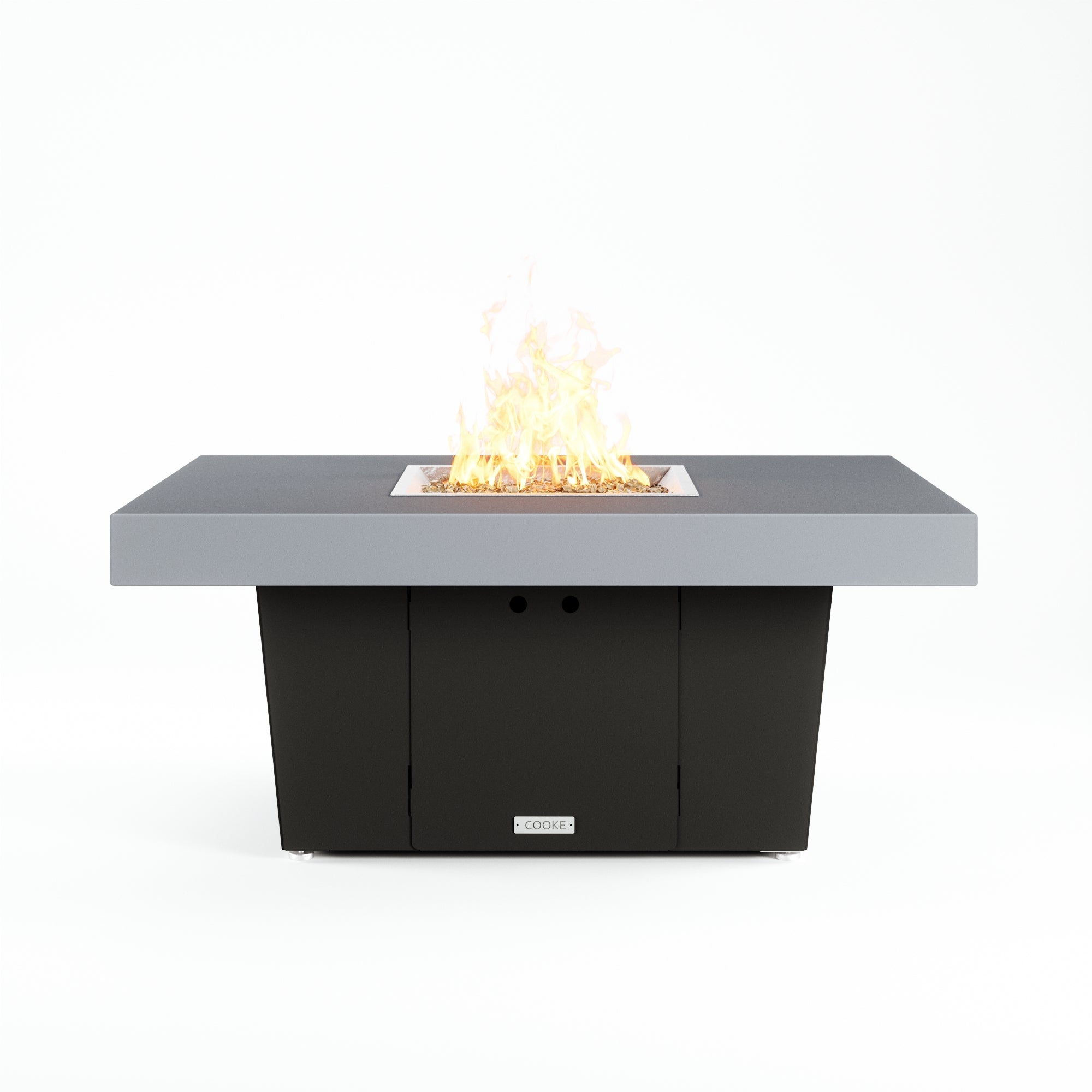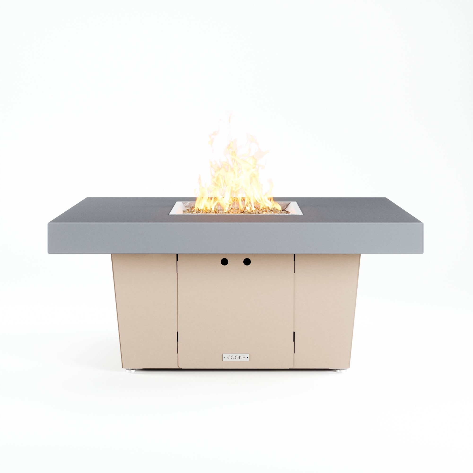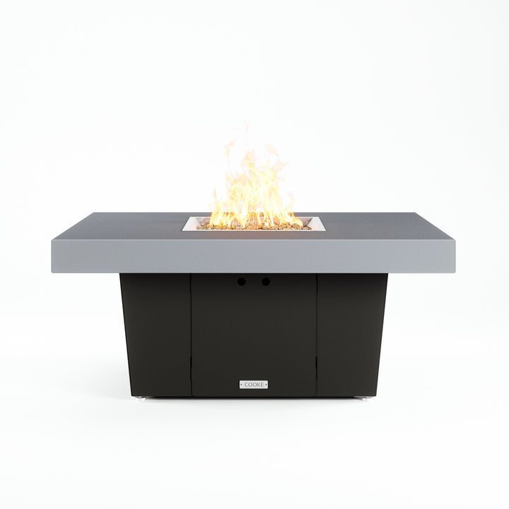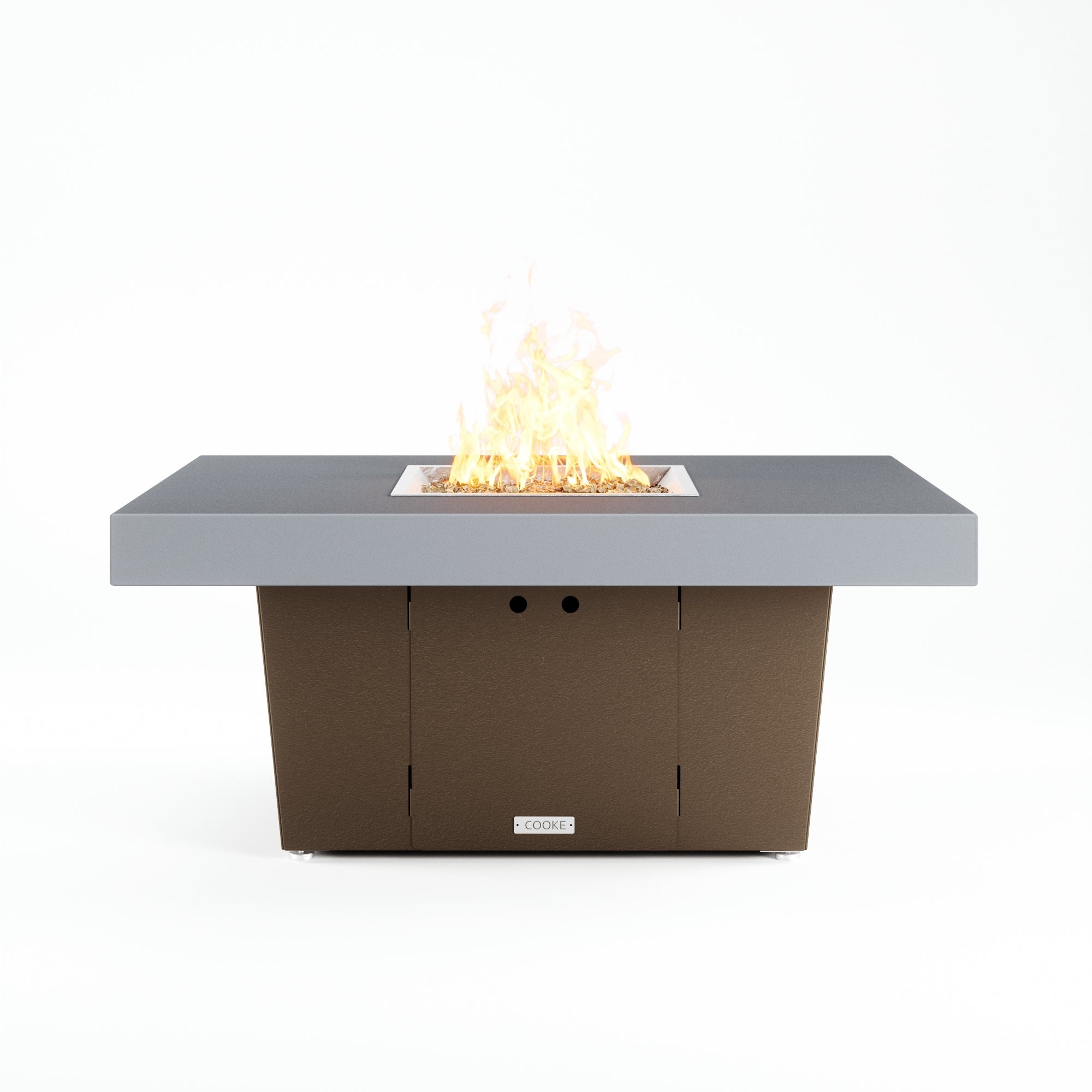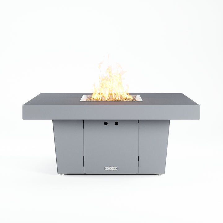 The Palisades fire pit table is COOKE's solution to a great-looking, quality, made-in-USA fire pit table that is versatile and a great value. This chat height fire pit table features a generous table top with 4" edge on a 21" tall slightly tapered base. This rectangular table has a modern look with a clean simplicity that will continue to look fresh. The COOKE Palisades is hands down the best value for an all aluminum or real stone fire pit table.