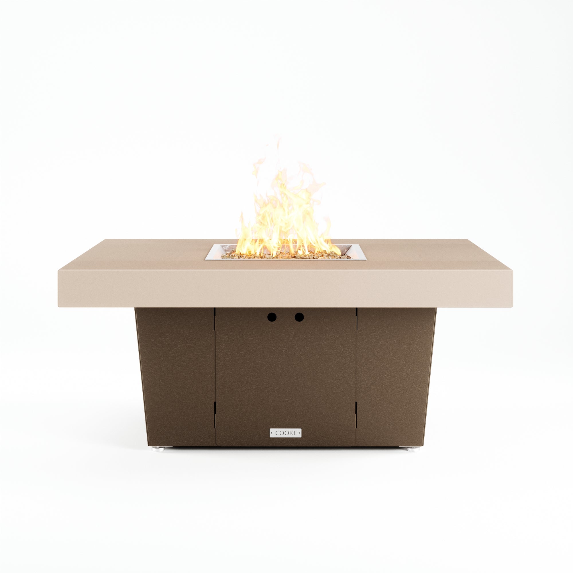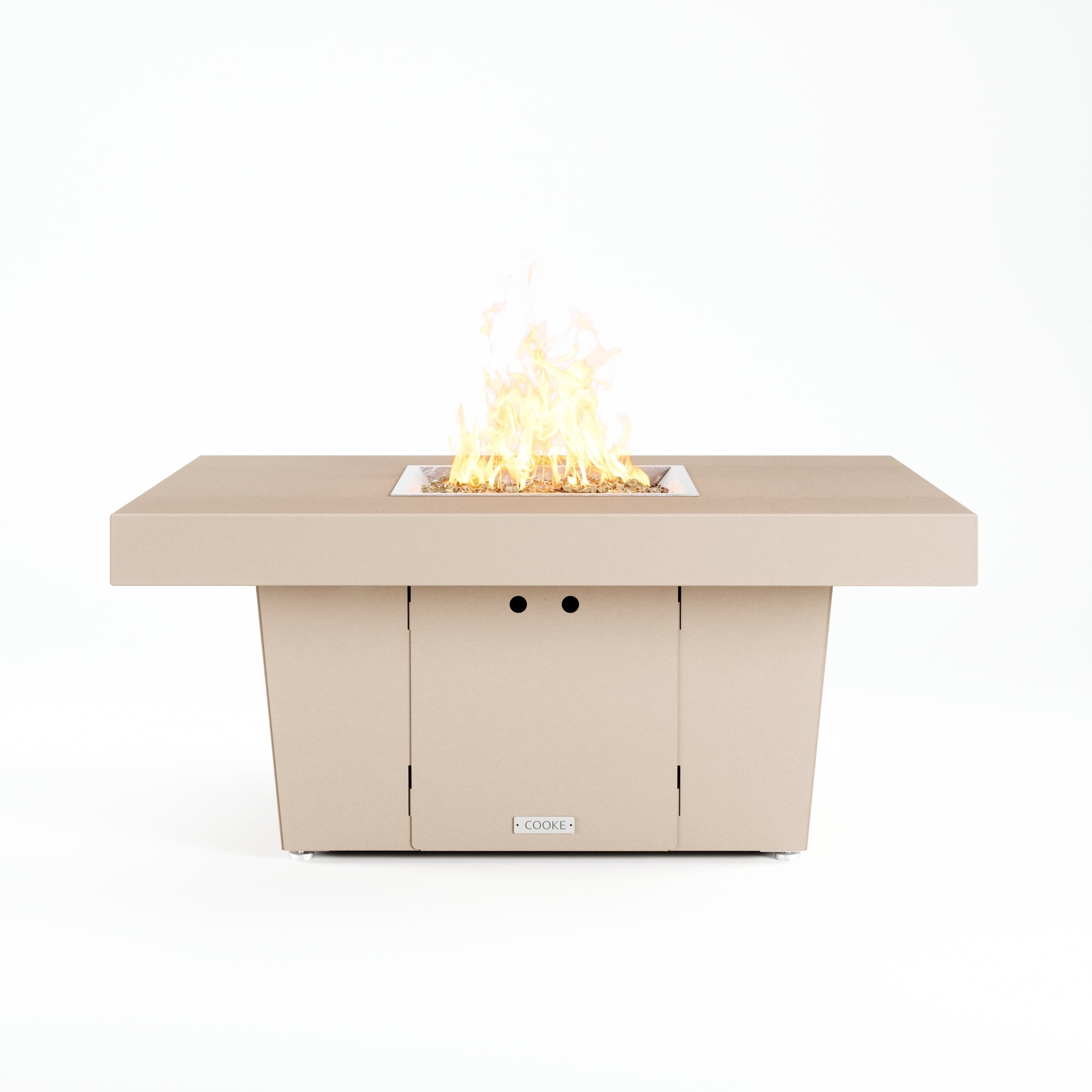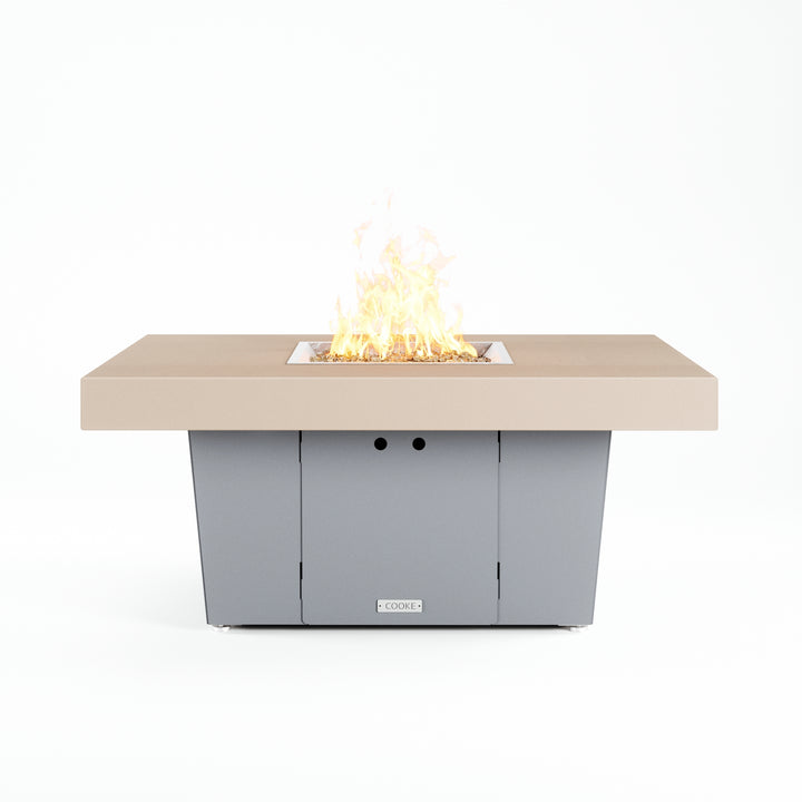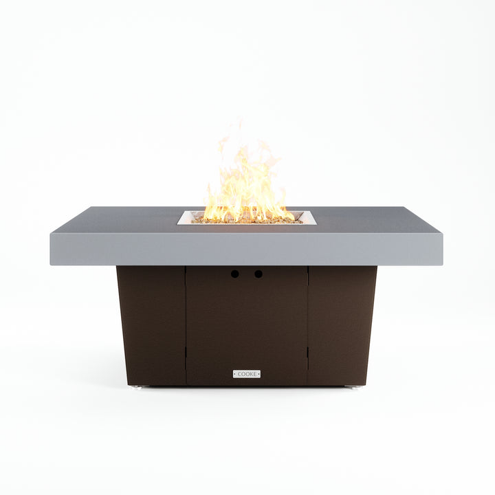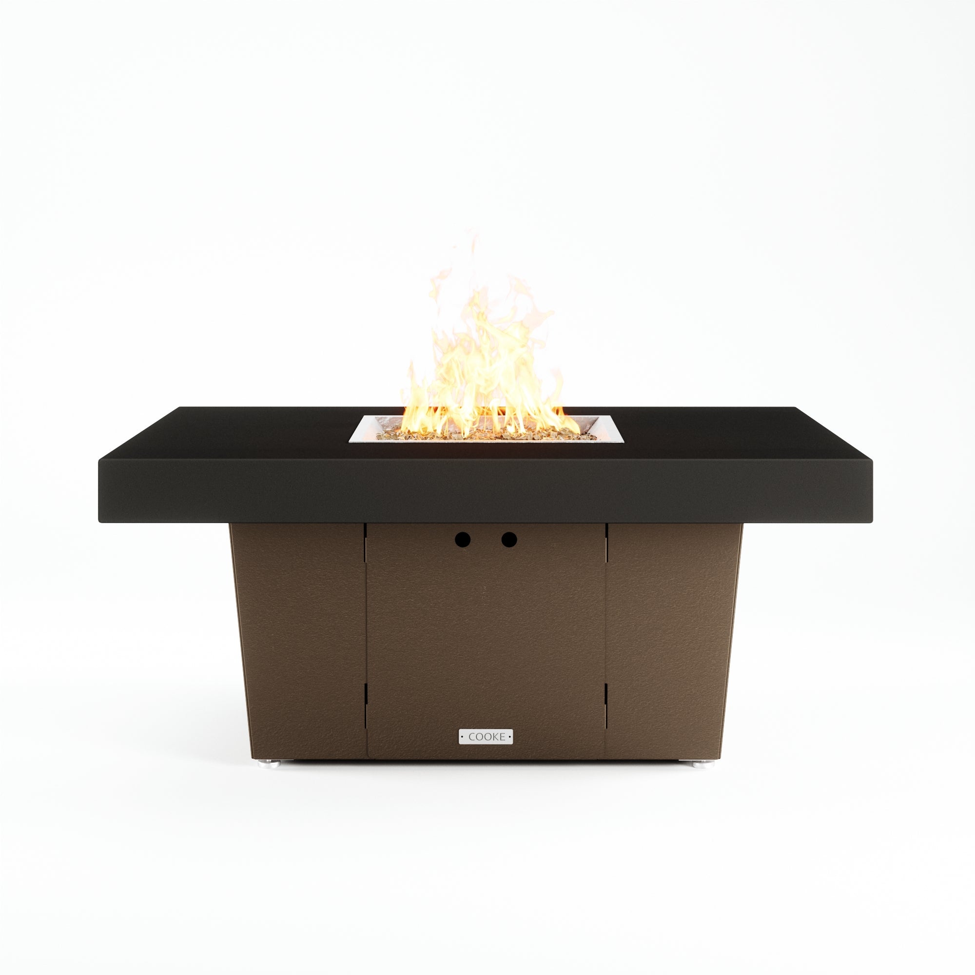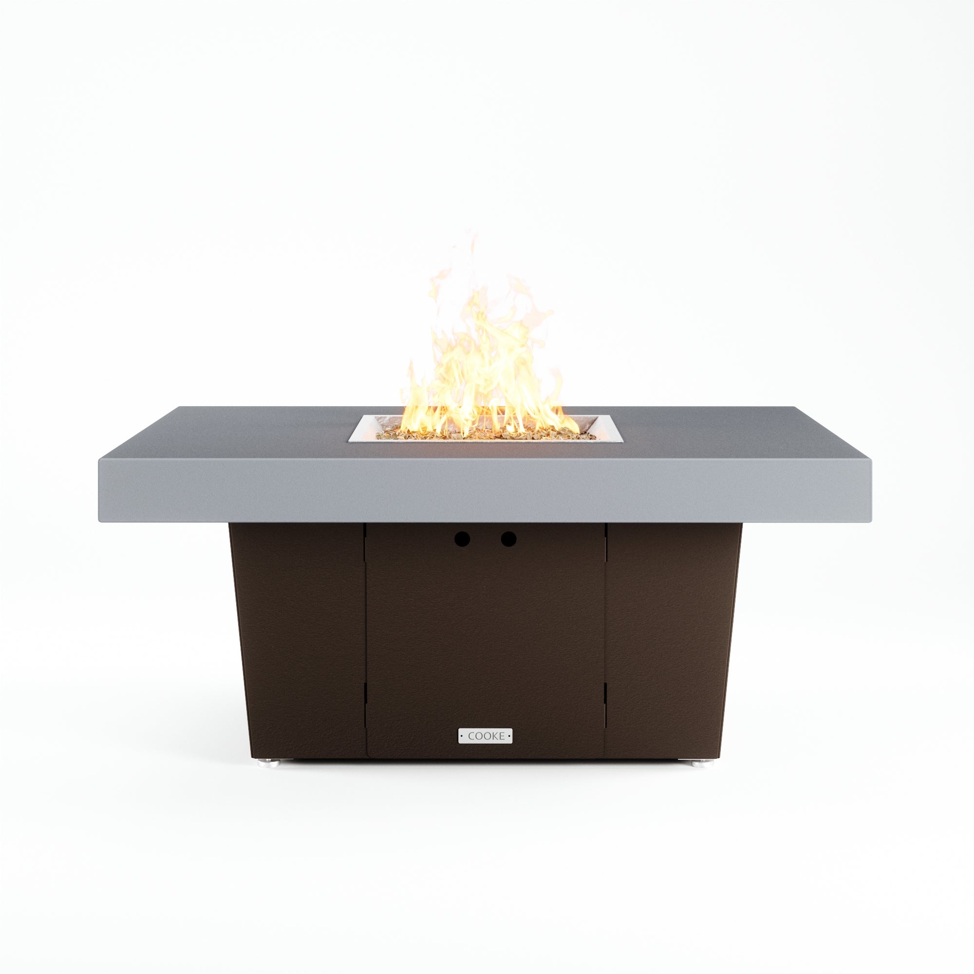 The Palisades fire pit table is COOKE's solution to a great-looking, quality, made-in-USA fire pit table that is versatile and a great value. This chat height fire pit table features a generous table top with 4" edge on a 21" tall slightly tapered base. This rectangular table has a modern look with a clean simplicity that will continue to look fresh. The COOKE Palisades is hands down the best value for an all aluminum or real stone fire pit table.