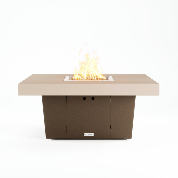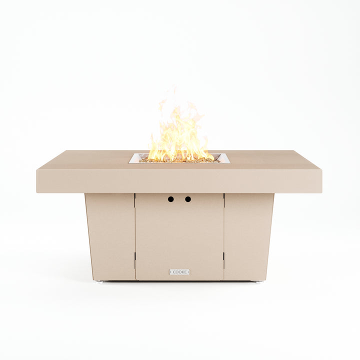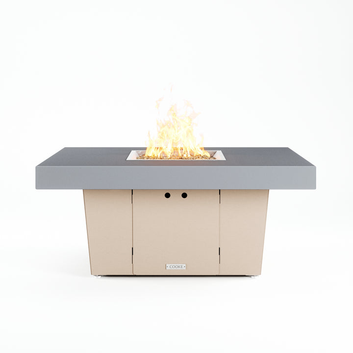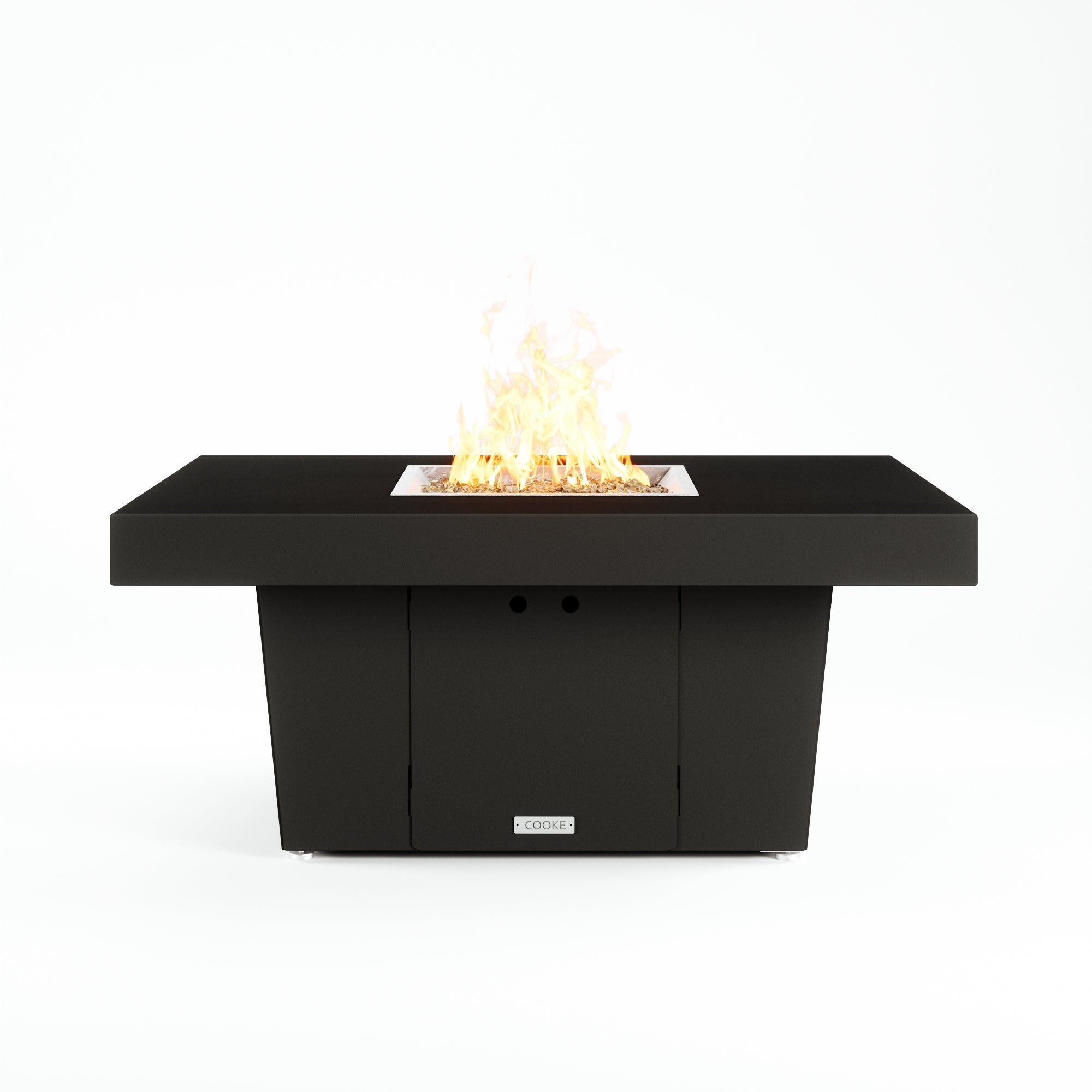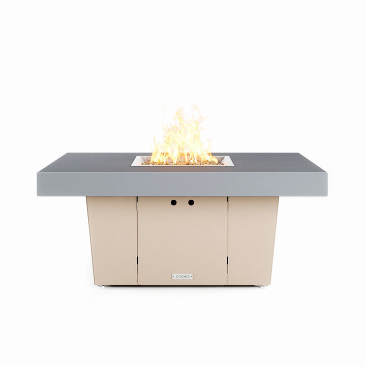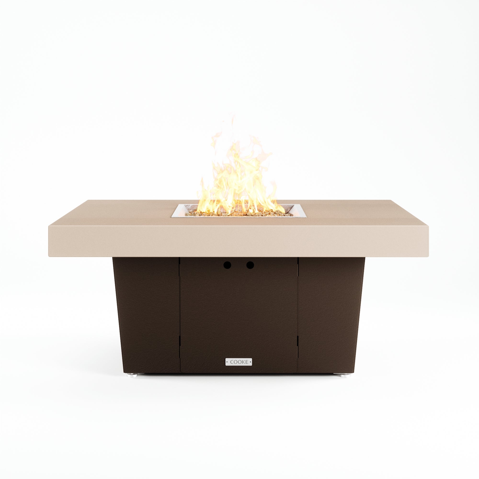 The Palisades fire pit table is COOKE's solution to a great-looking, quality, made-in-USA fire pit table that is versatile and a great value. This chat height fire pit table features a generous table top with 4" edge on a 21" tall slightly tapered base. This rectangular table has a modern look with a clean simplicity that will continue to look fresh. The COOKE Palisades is hands down the best value for an all aluminum or real stone fire pit table.