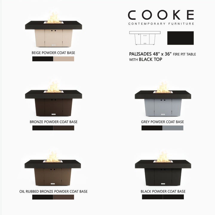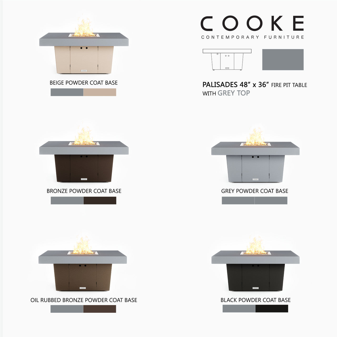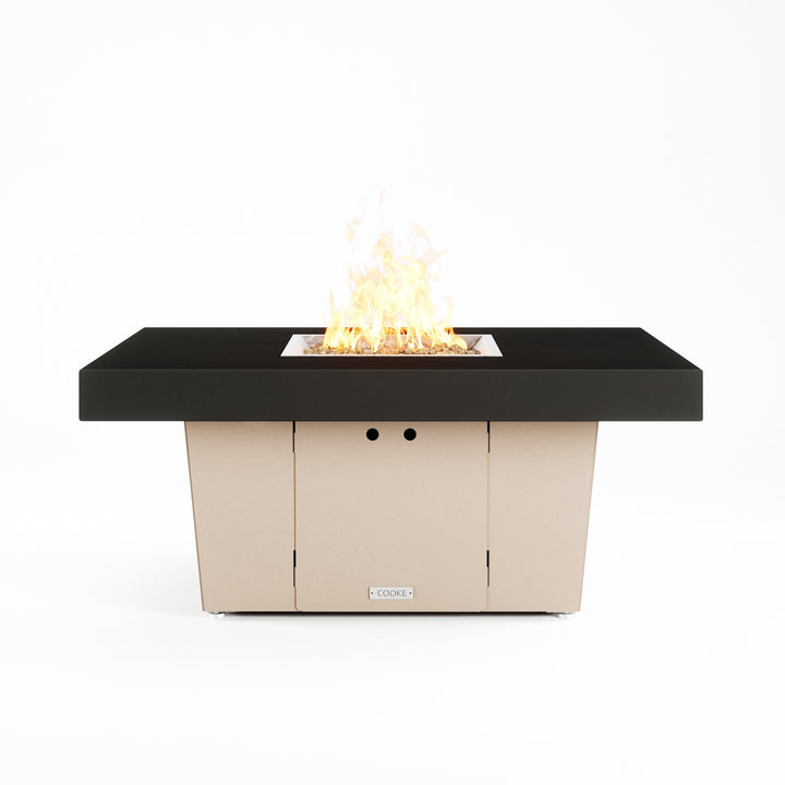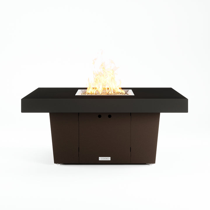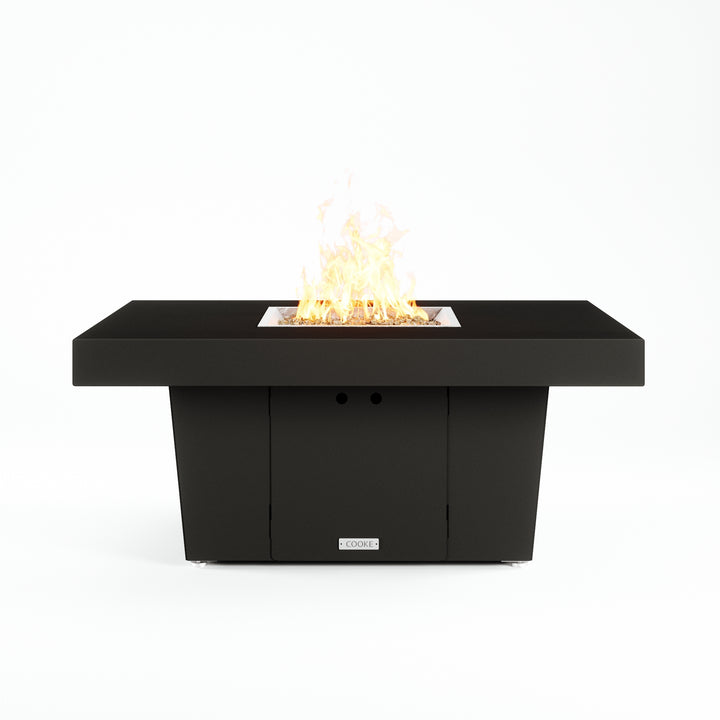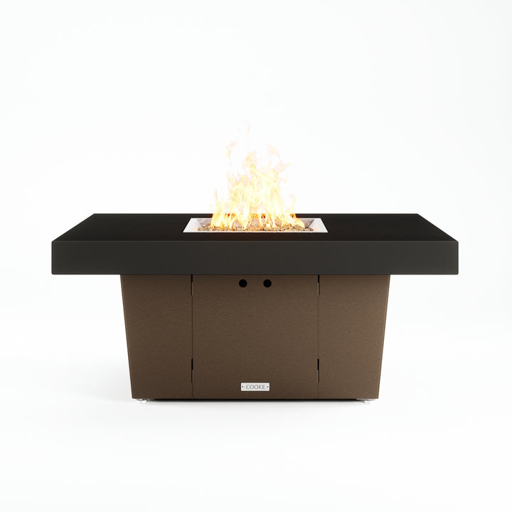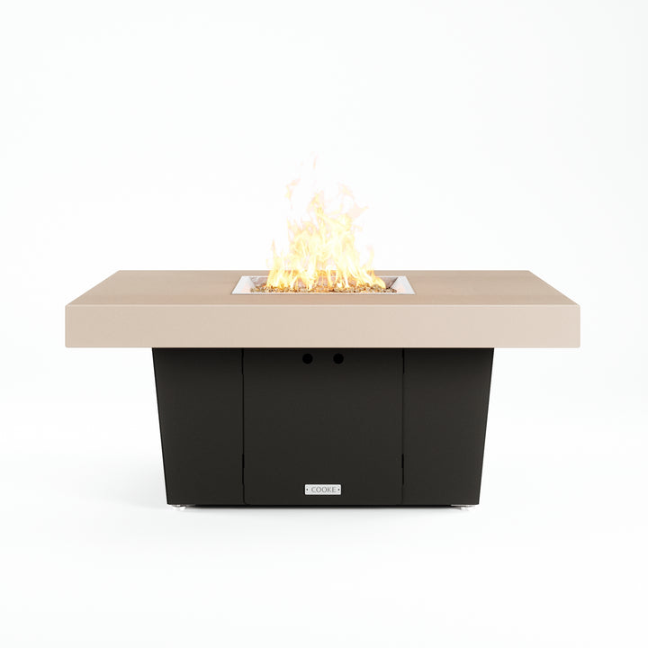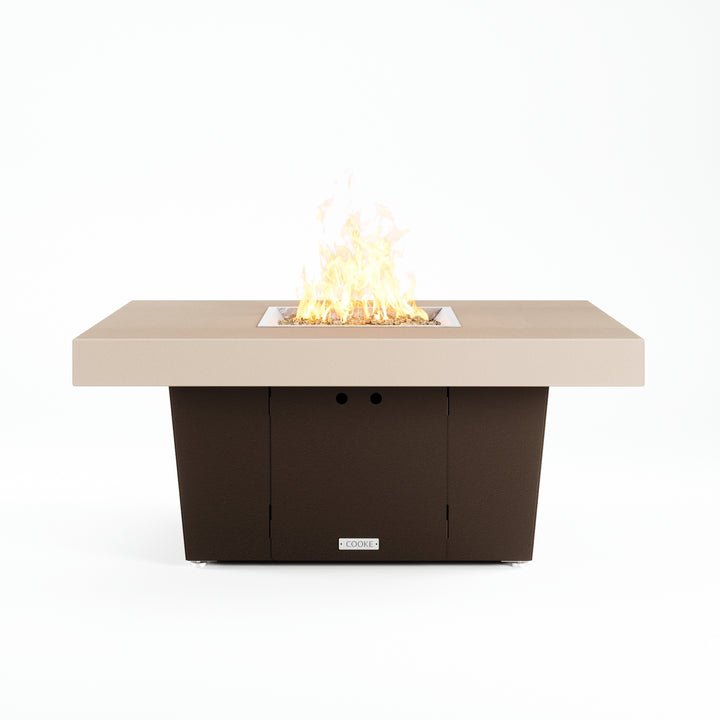 The Palisades fire pit table is COOKE's solution to a great-looking, quality, made-in-USA fire pit table that is versatile and a great value. This chat height fire pit table features a generous table top with 4" edge on a 21" tall slightly tapered base. This rectangular table has a modern look with a clean simplicity that will continue to look fresh. The COOKE Palisades is hands down the best value for an all aluminum or real stone fire pit table.