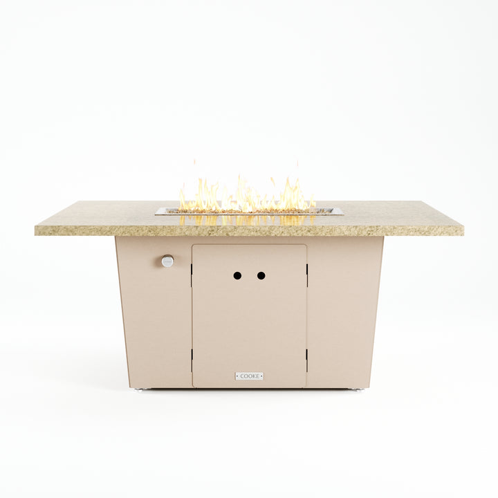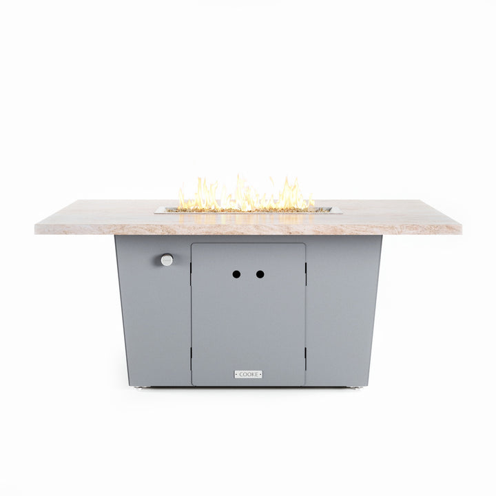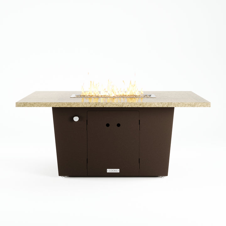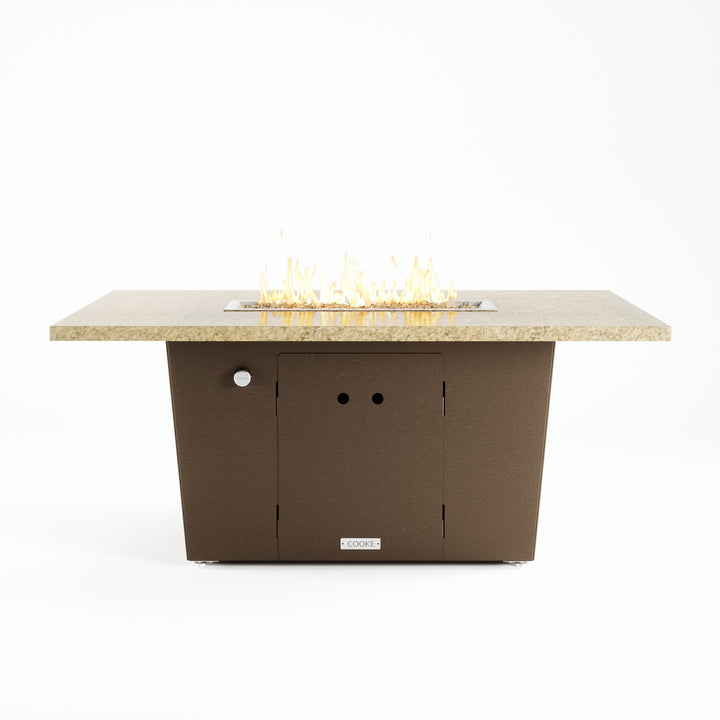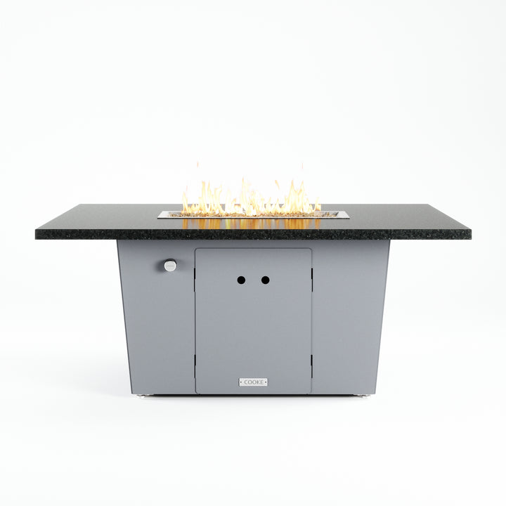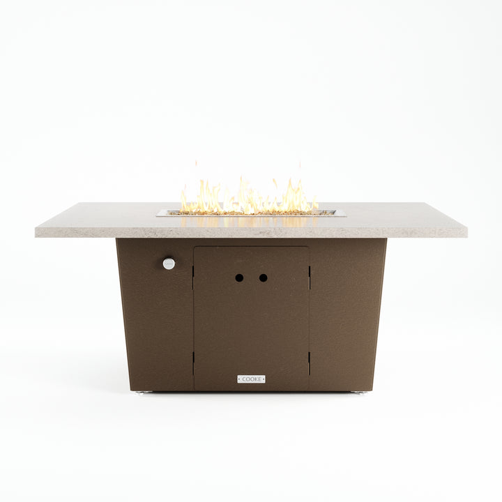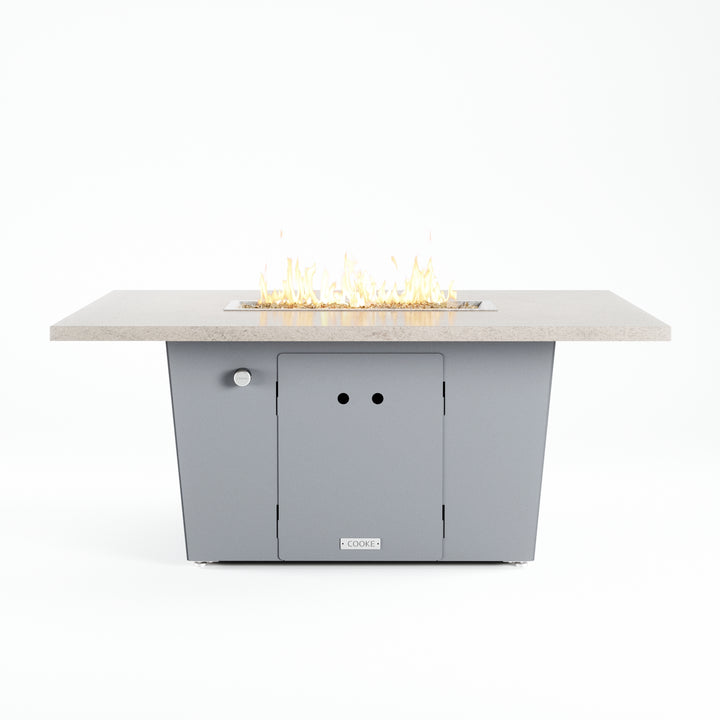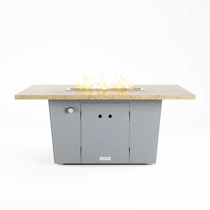 The Palisades fire pit table is COOKE's solution to a great-looking, quality, made-in-USA fire pit table that is versatile and a great value. This chat height fire pit table features a generous table top with 3cm edge on a 21" tall slightly tapered base. This rectangular table has lighter lines, a more traditional look, but a clean simplicity that will continue to look fresh. The COOKE Palisades is hands down the best value for an all aluminum or real stone fire pit table.