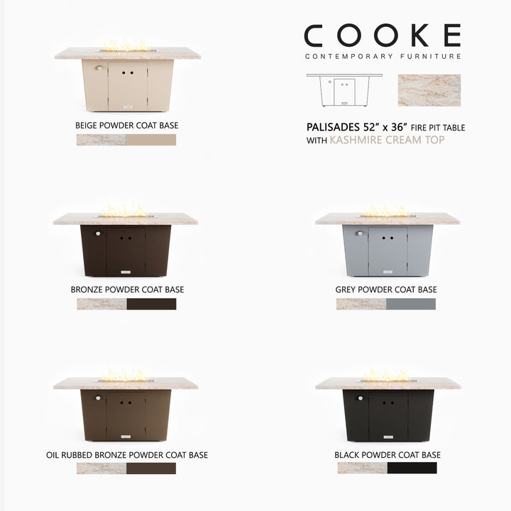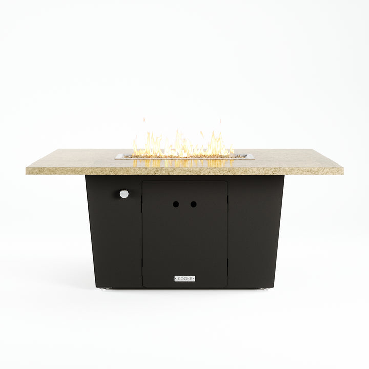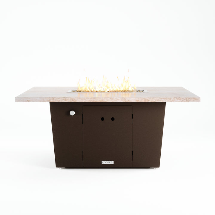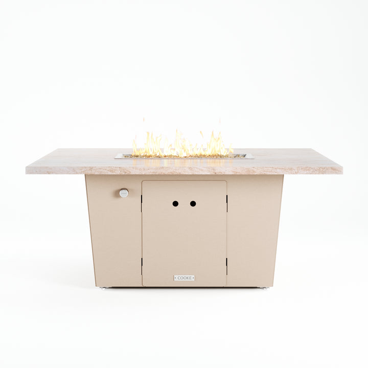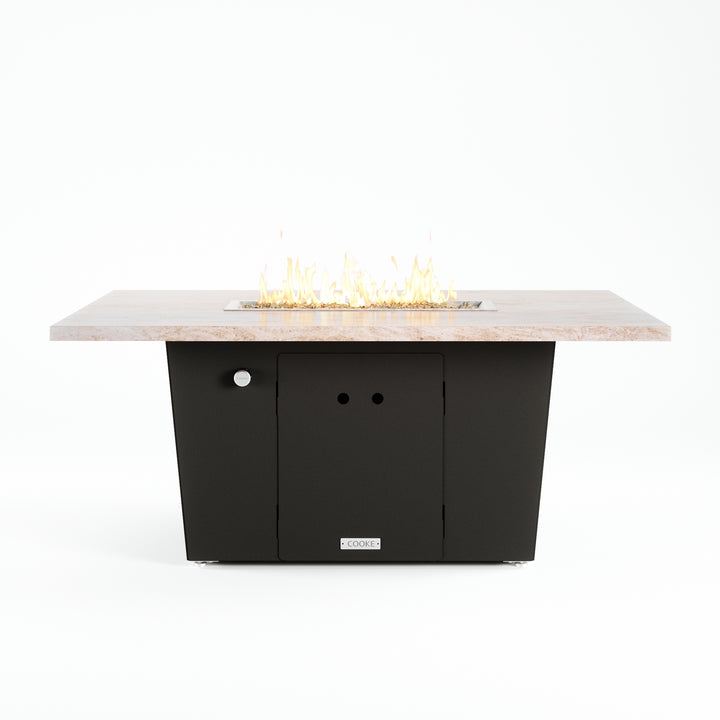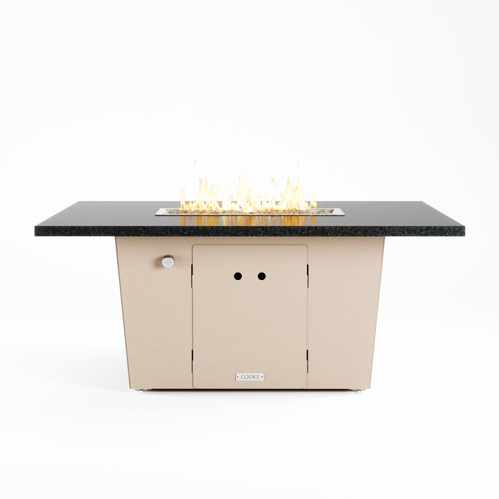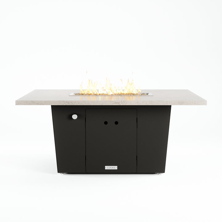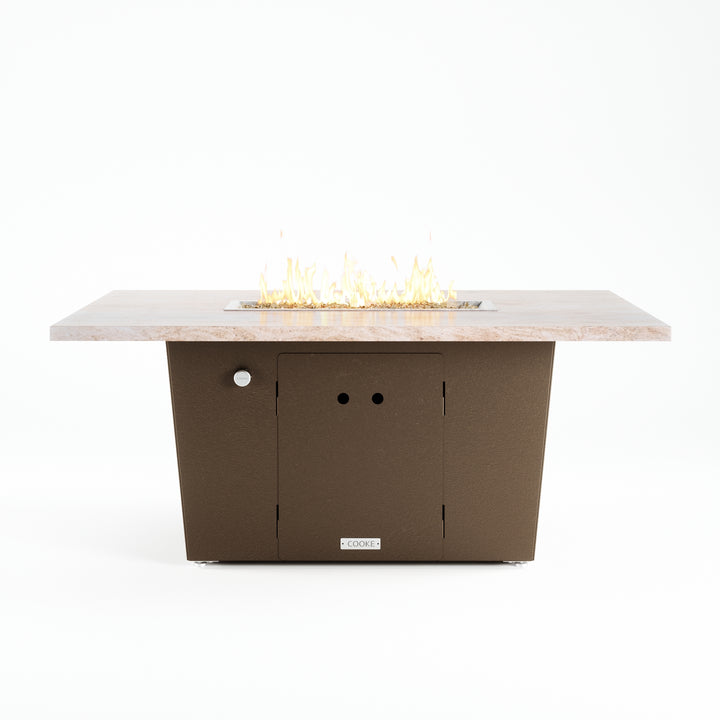 The Palisades fire pit table is COOKE's solution to a great-looking, quality, made-in-USA fire pit table that is versatile and a great value. This chat height fire pit table features a generous table top with 3cm edge on a 21" tall slightly tapered base. This rectangular table has lighter lines, a more traditional look, but a clean simplicity that will continue to look fresh. The COOKE Palisades is hands down the best value for an all aluminum or real stone fire pit table.