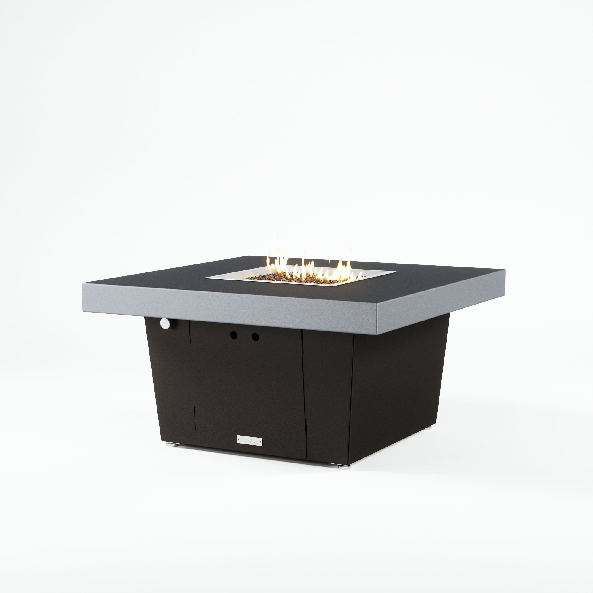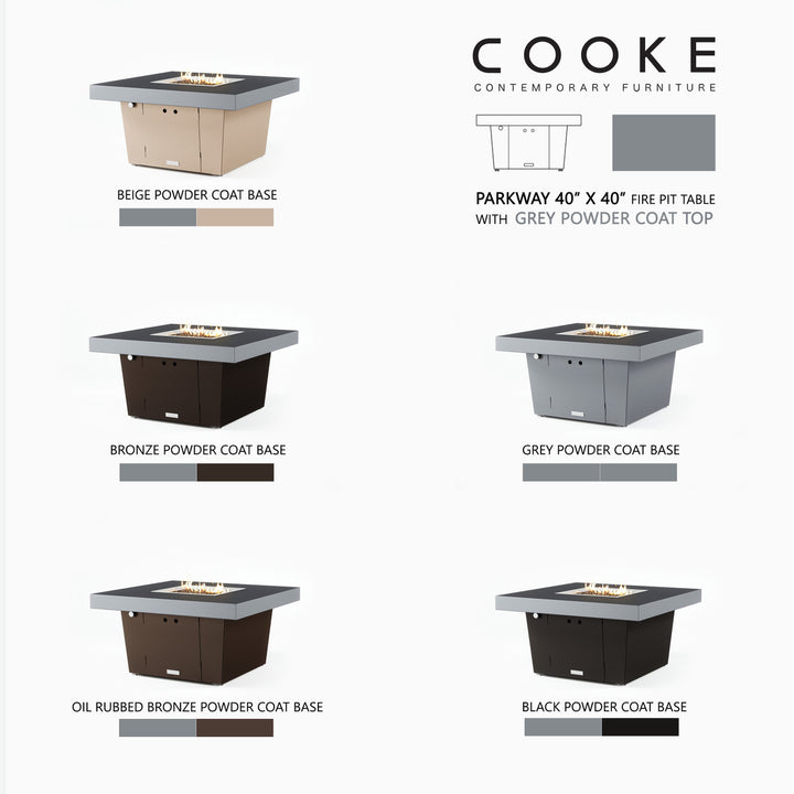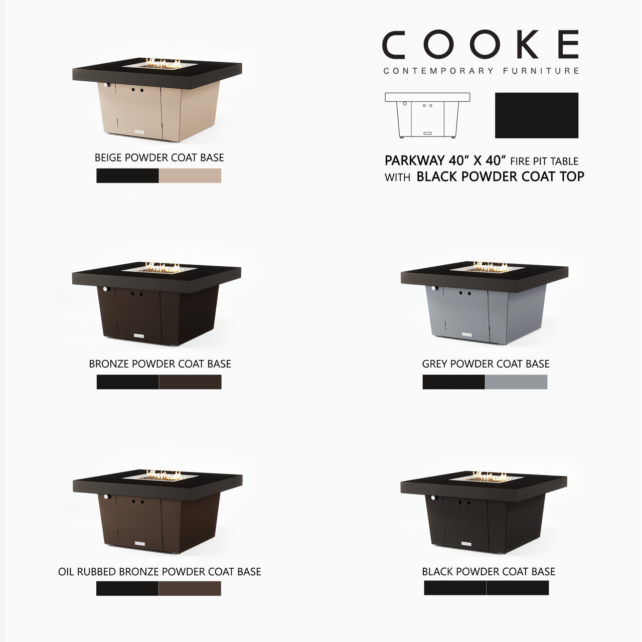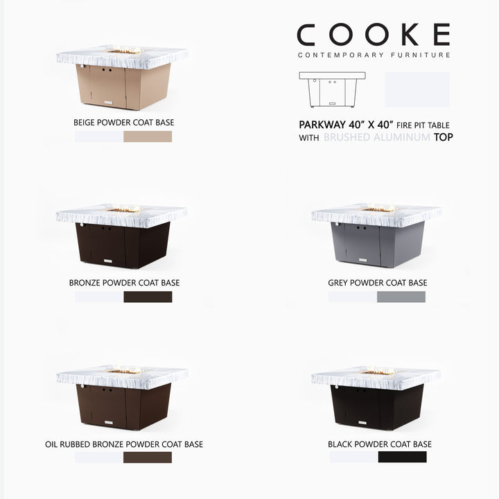 The Parkway fire pit table is COOKE's solution to a great-looking, quality, made-in-USA square fire pit table that is versatile and a great value. This chat height fire pit table features a generous table top with 4" edge on a 21" tall slightly tapered base. This table has elegant lines lines and a nice clean contemporary look that will continue to look fresh. This table is big enough for ample seating but is carefully designed to be integrated into landscaped lounge areas, open patio spaces with planters, or near fountains and water features. The COOKE Parkway is hands down the best value for an all aluminum fire pit table.