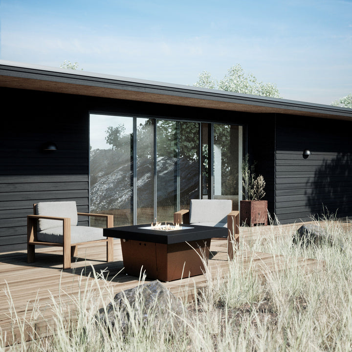We offer this outdoor fire pit table with a propane or natural gas fuel source configuration. The 60k BTU fire is fully adjustable with stainless steel controls mounted on the table base. The 17" x 17" fire pit holds your choice of lava rock, fireglass, or other media and produces a clean burning fire. A 5 gallon / 20 lb. propane tank is hidden in the base of the table an easily accessed via a color-matched panel door. There are no hoses or tanks outside of the table. The natural gas version is connected to your home's natural gas stub with our stainless steel flex lines. Perfect for new construction or renovations. We provide you all the hoses and fittings to connect your fire pit to either fuel source and get the job done!