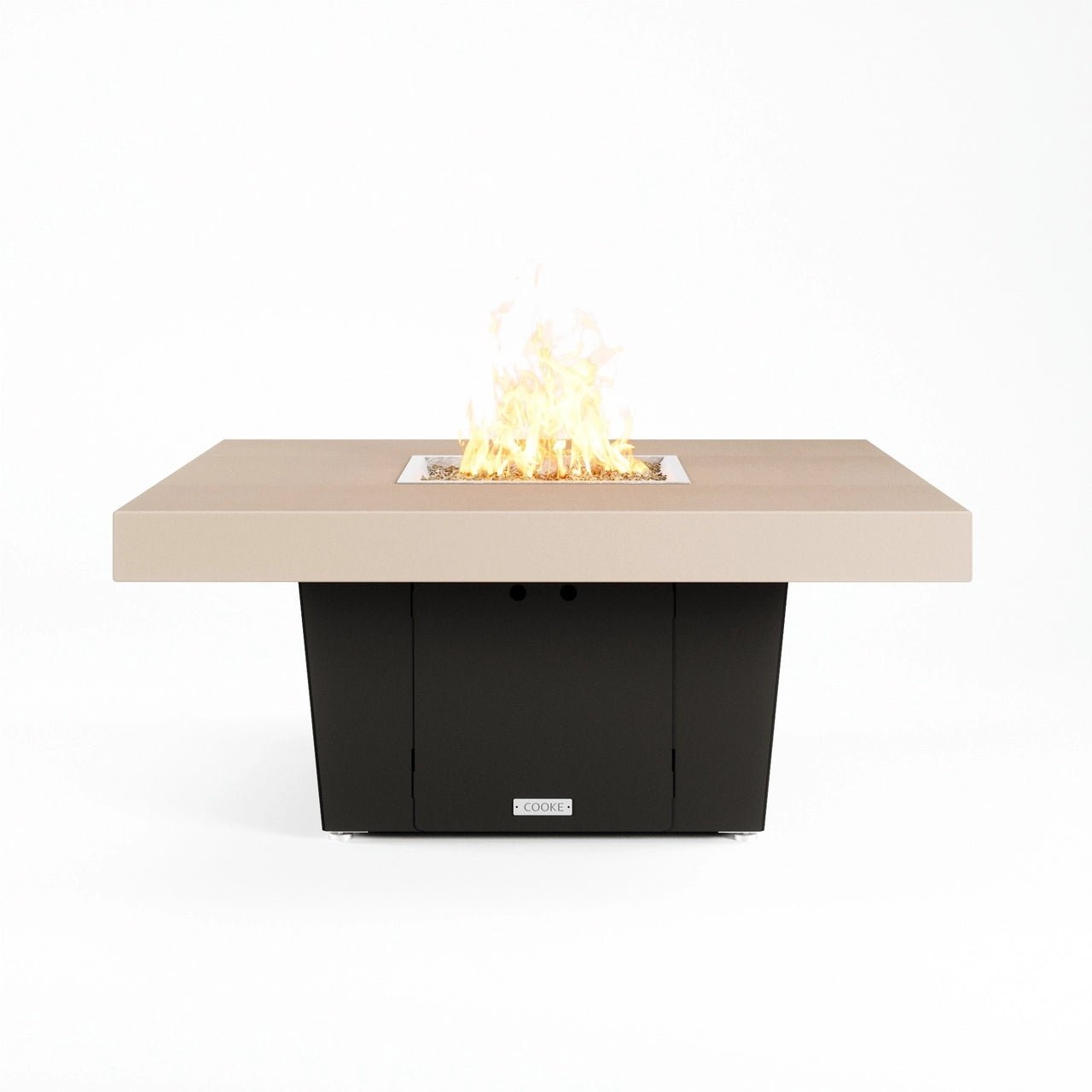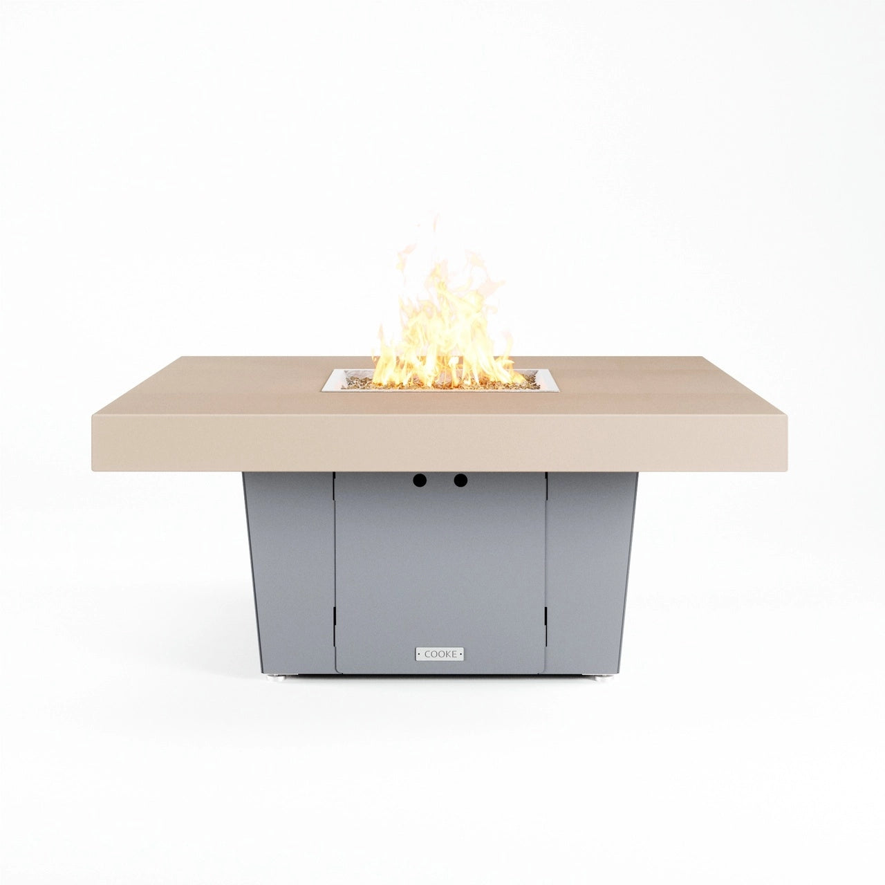 Designed and made in California, this COOKE Parkway features an oversized 48" x 48" Cobblestone Beige top that is going to look great on the patio or next to the pool. This table features everything you want in a square fire pit table. Choose from the bronze, black, or grey base and decorative fire pit media to customize the table like you want. This square fire pit table package includes a tempered glass windscreen.